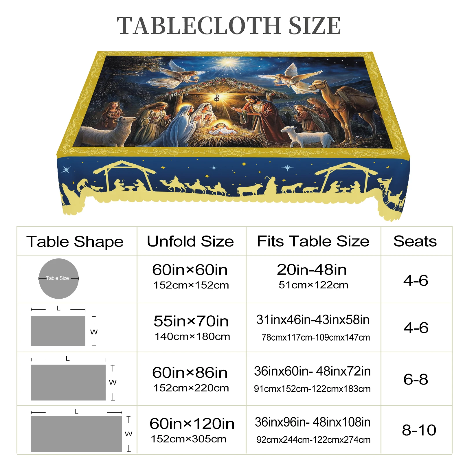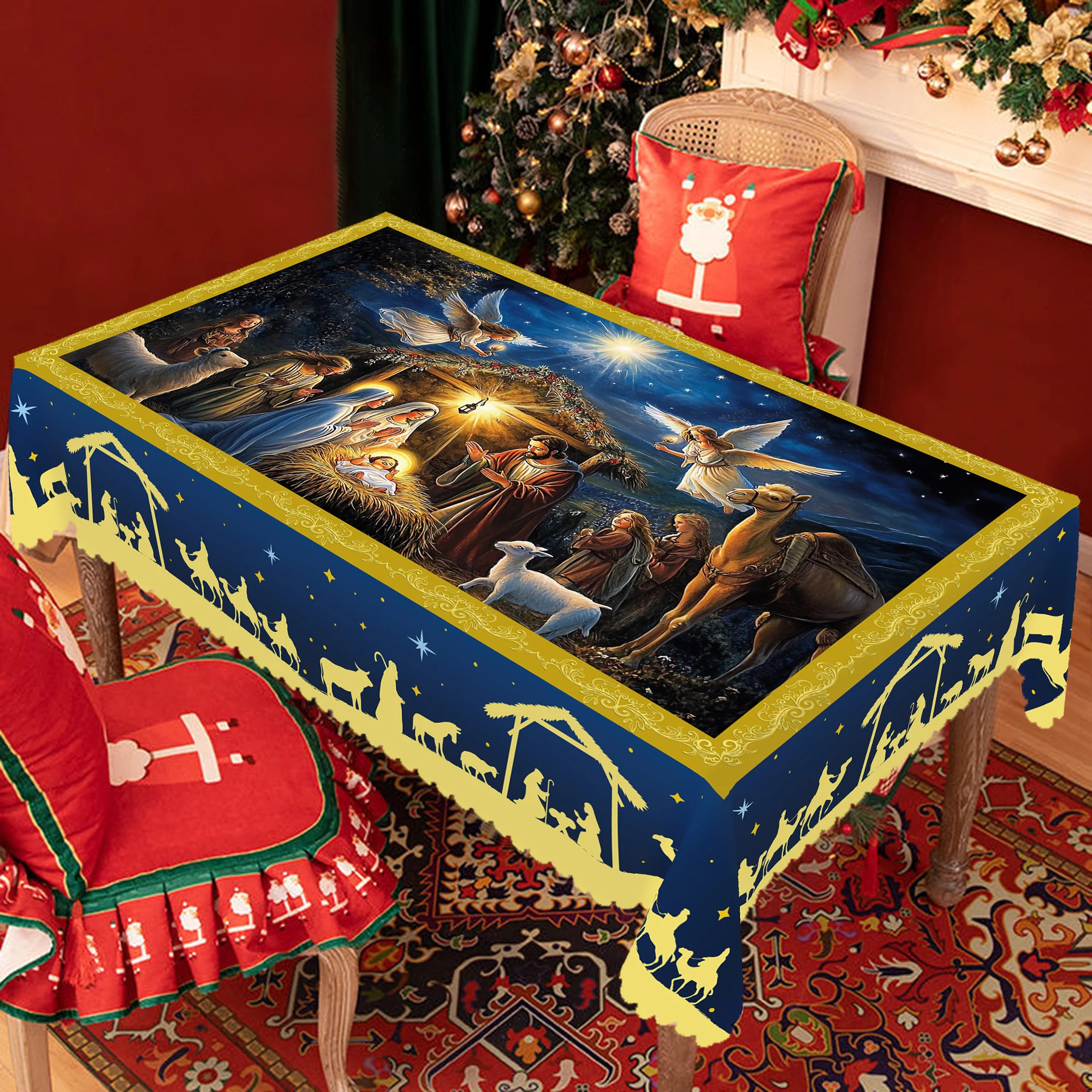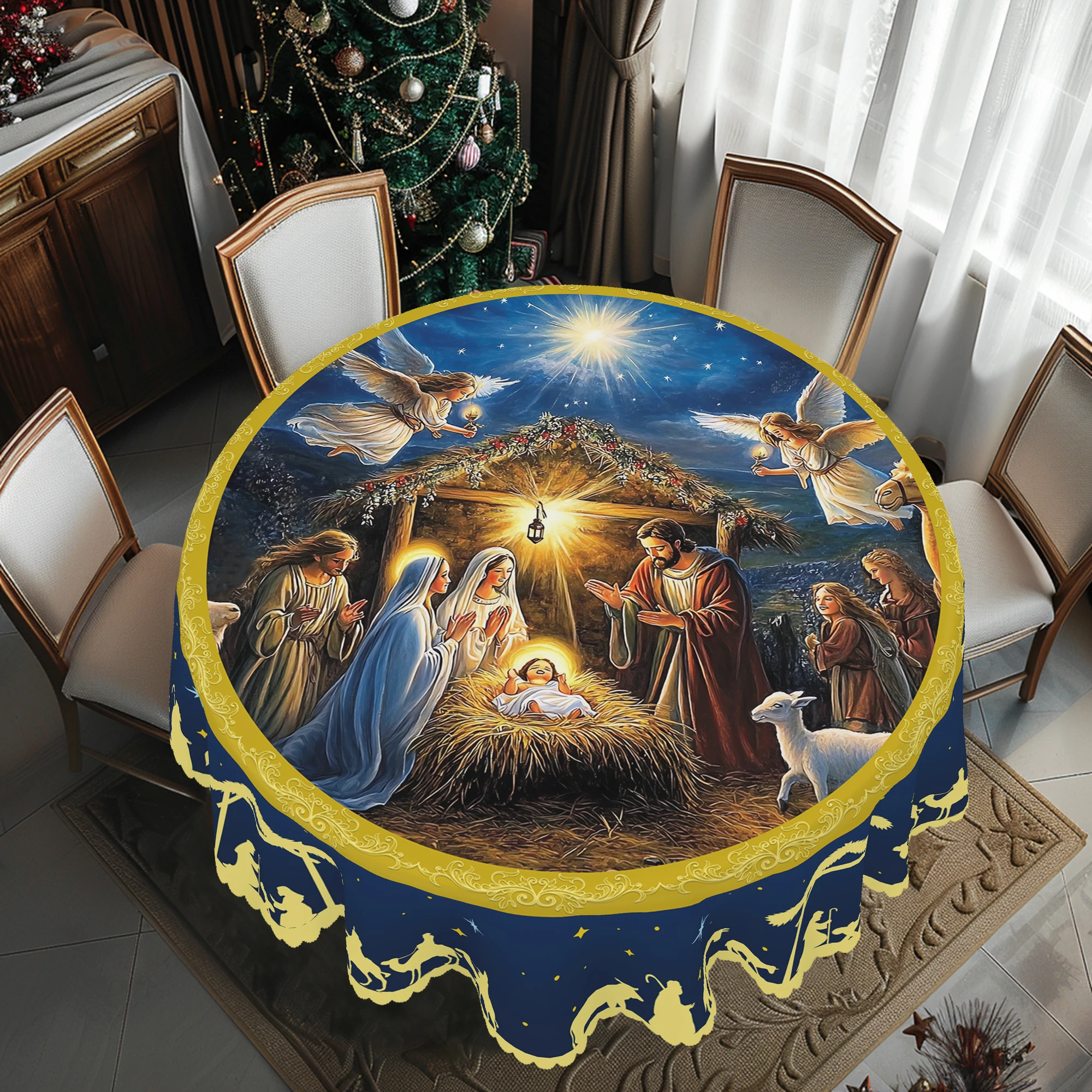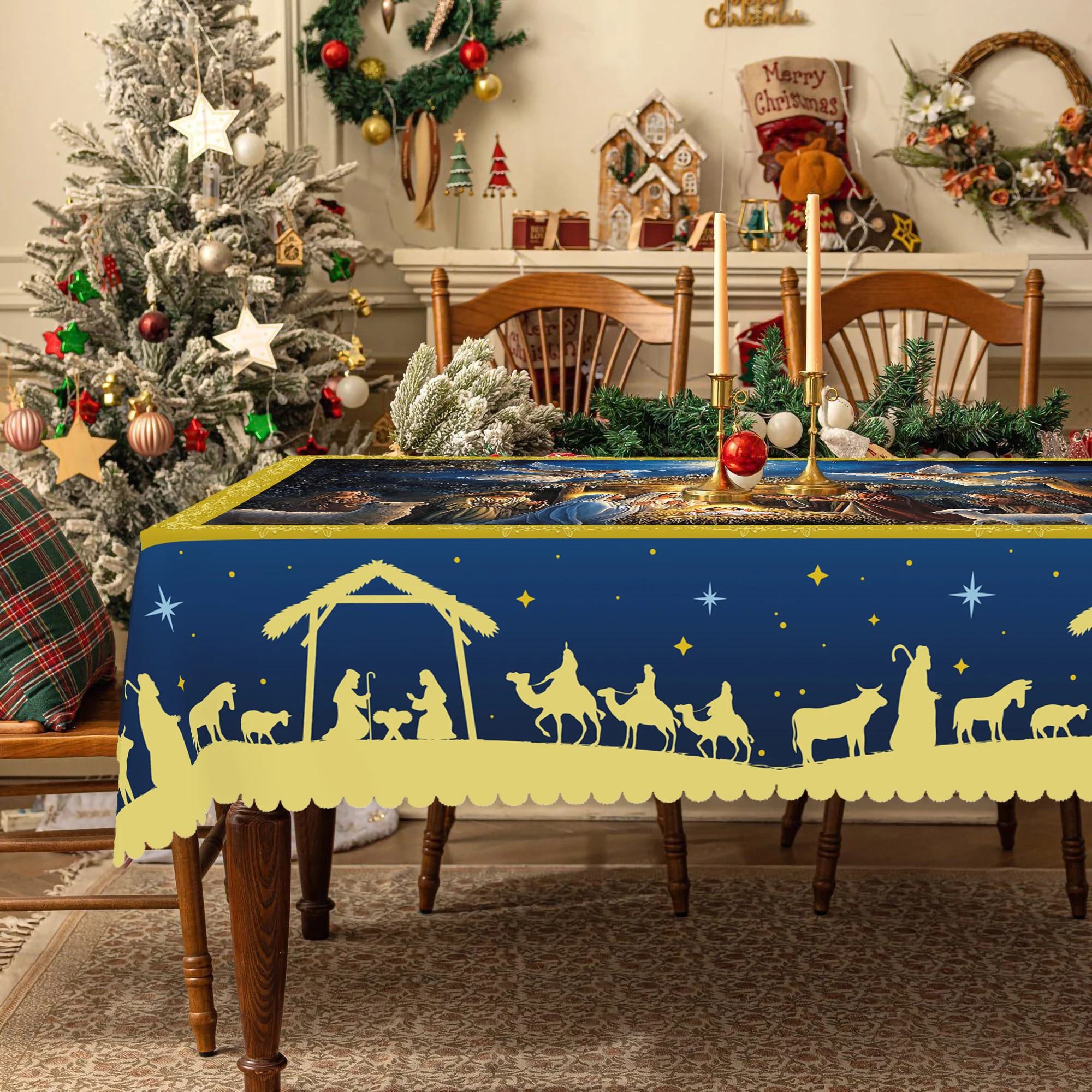 1 Christmas-Themed Round and Rectangular Tablecloth, Various Sizes, Blue Tablecl