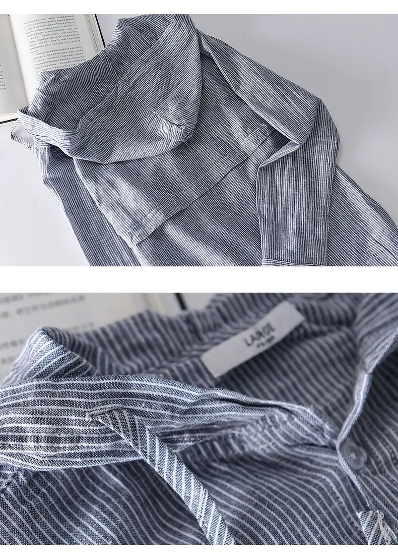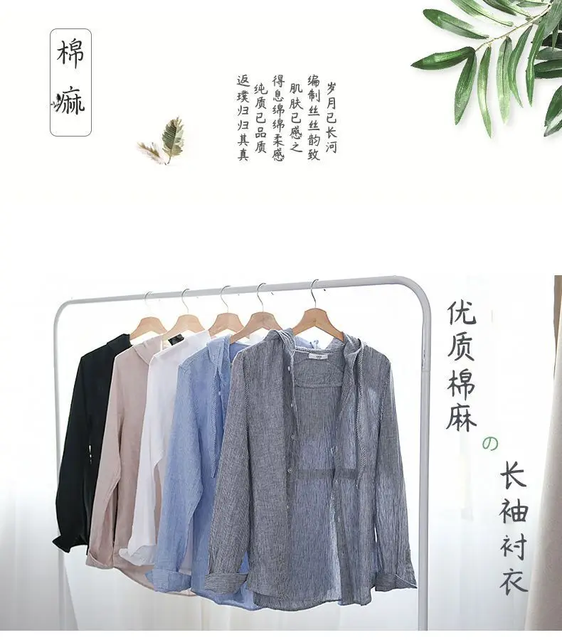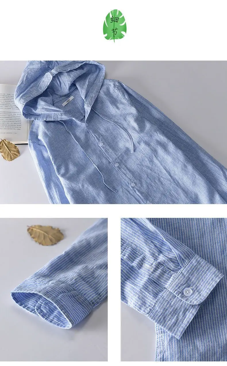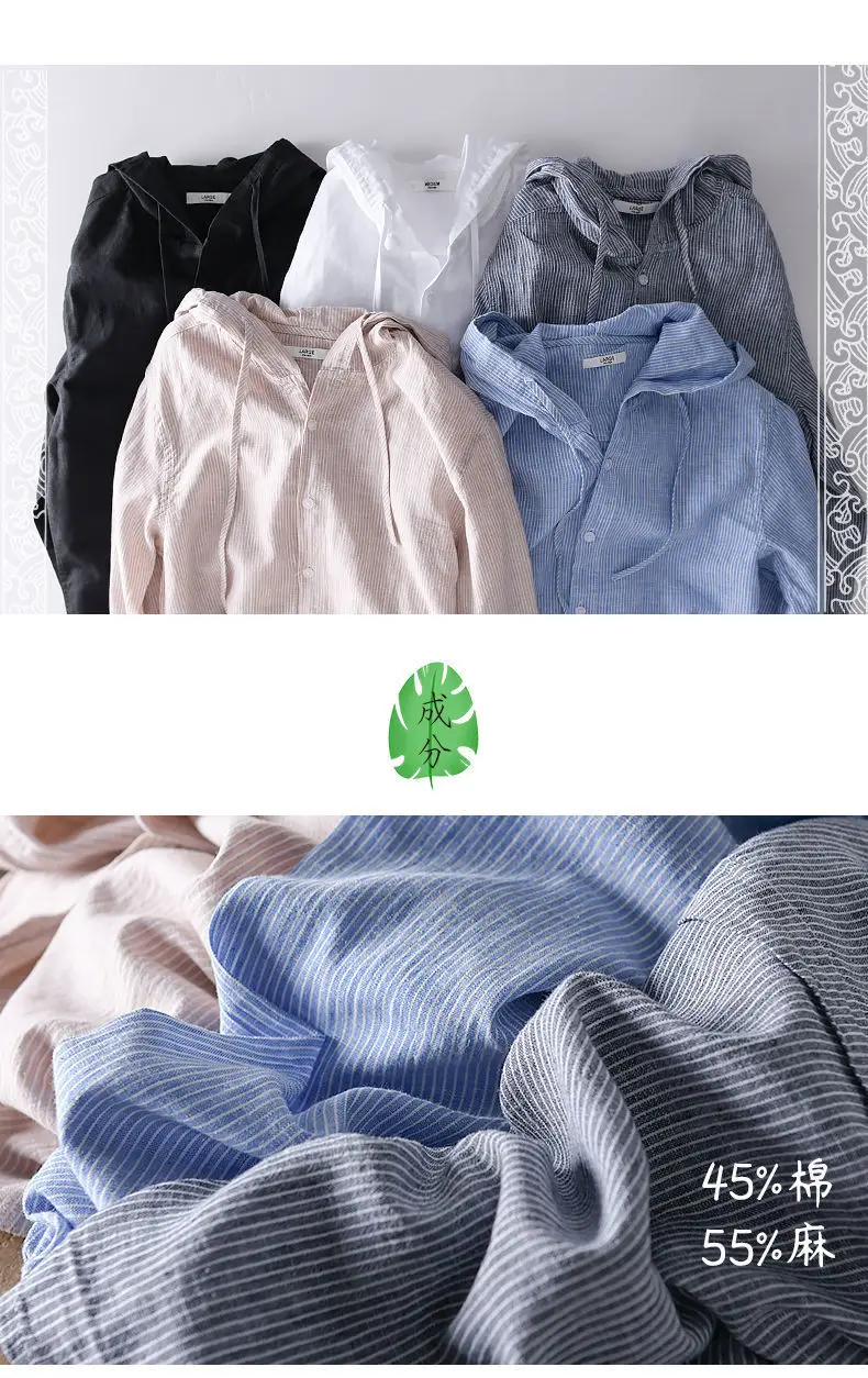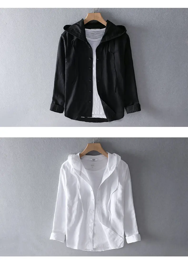 2024 Spring Summer New Solid Color Hooded Long Sleeve Cotton Hemp Shirt Man High