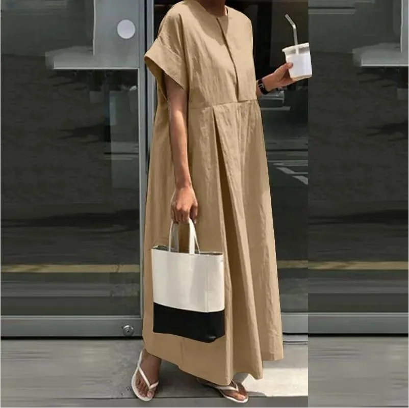 2024 Summer Fashion New Cotton and Hemp Women's Dress Loose Solid Color Folded H
