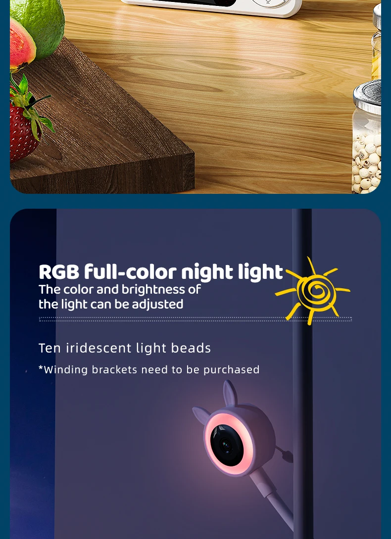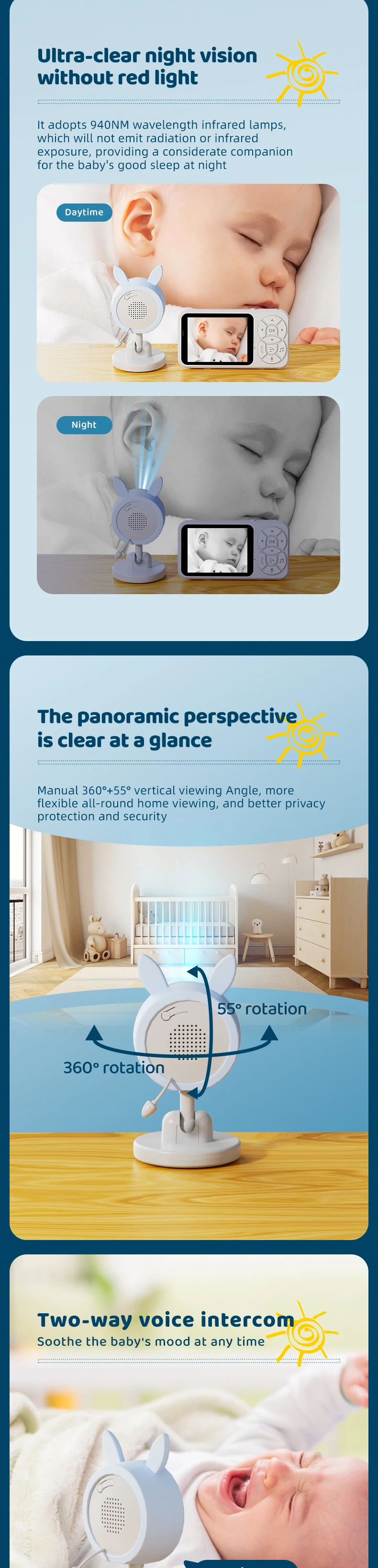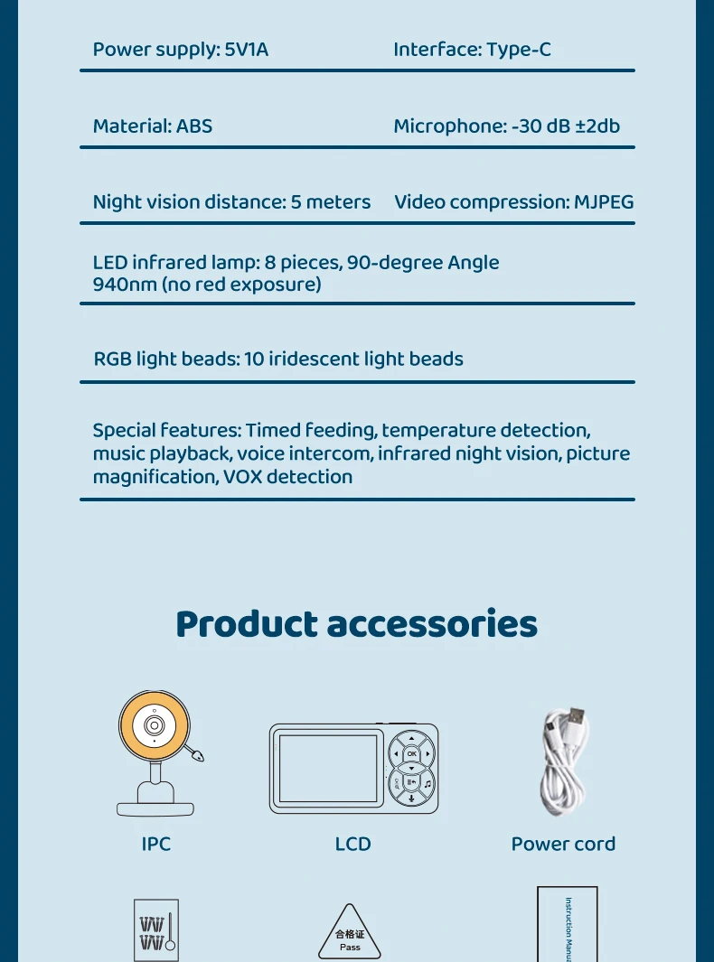 Feature: Intercom,Baby Cry Alarm,Feeding Time Reminder,Temperature Monitoring,Humidity Monitoring,LCD Display,Nightlight,Power Saver,Portable,Music