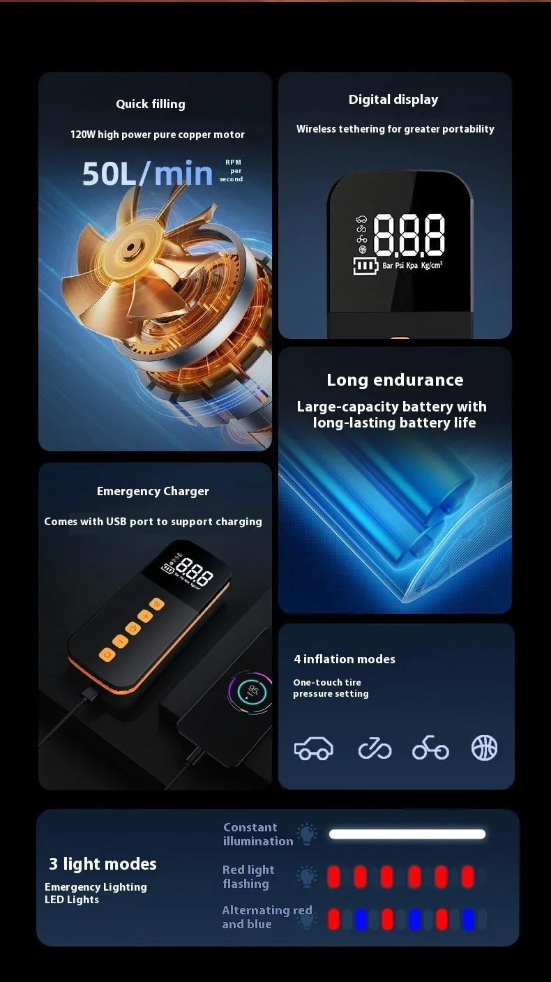 • Wireless and Convenient : No need for wires or cords, this air compressor is easy to use and can be taken anywhere.• Versatile:Suitable for use with cars, motorcycles, bicycles, boats, and even sports balls.