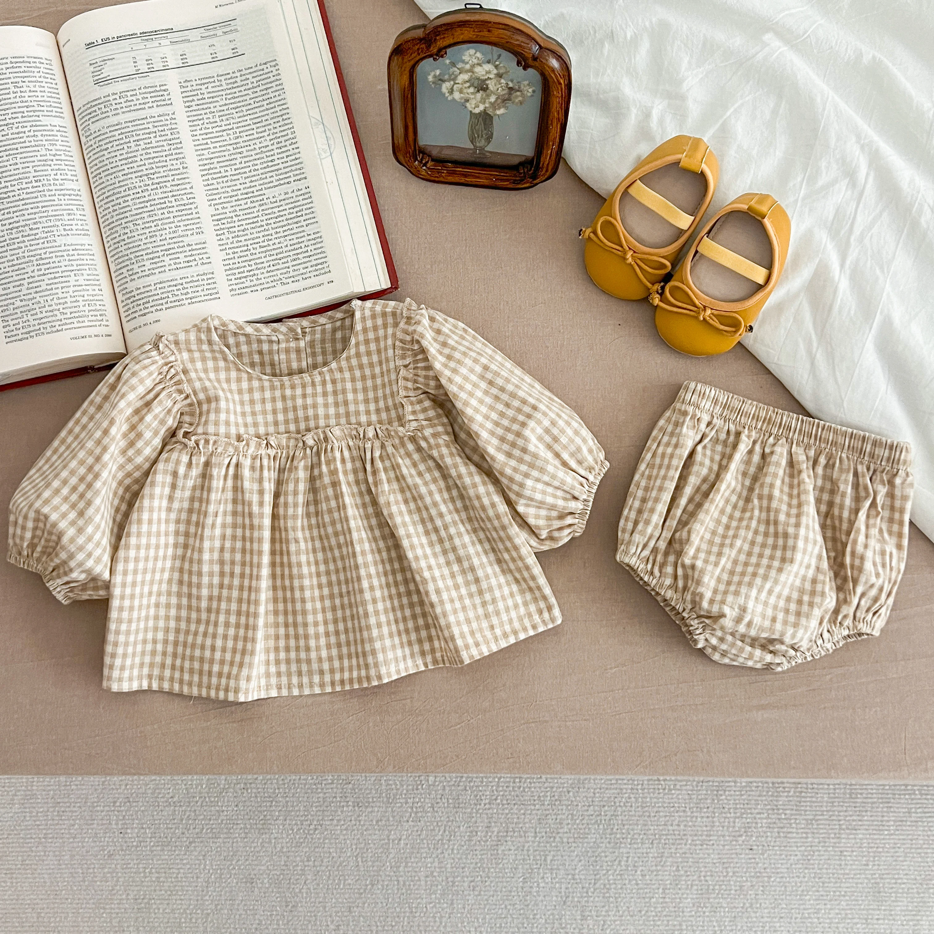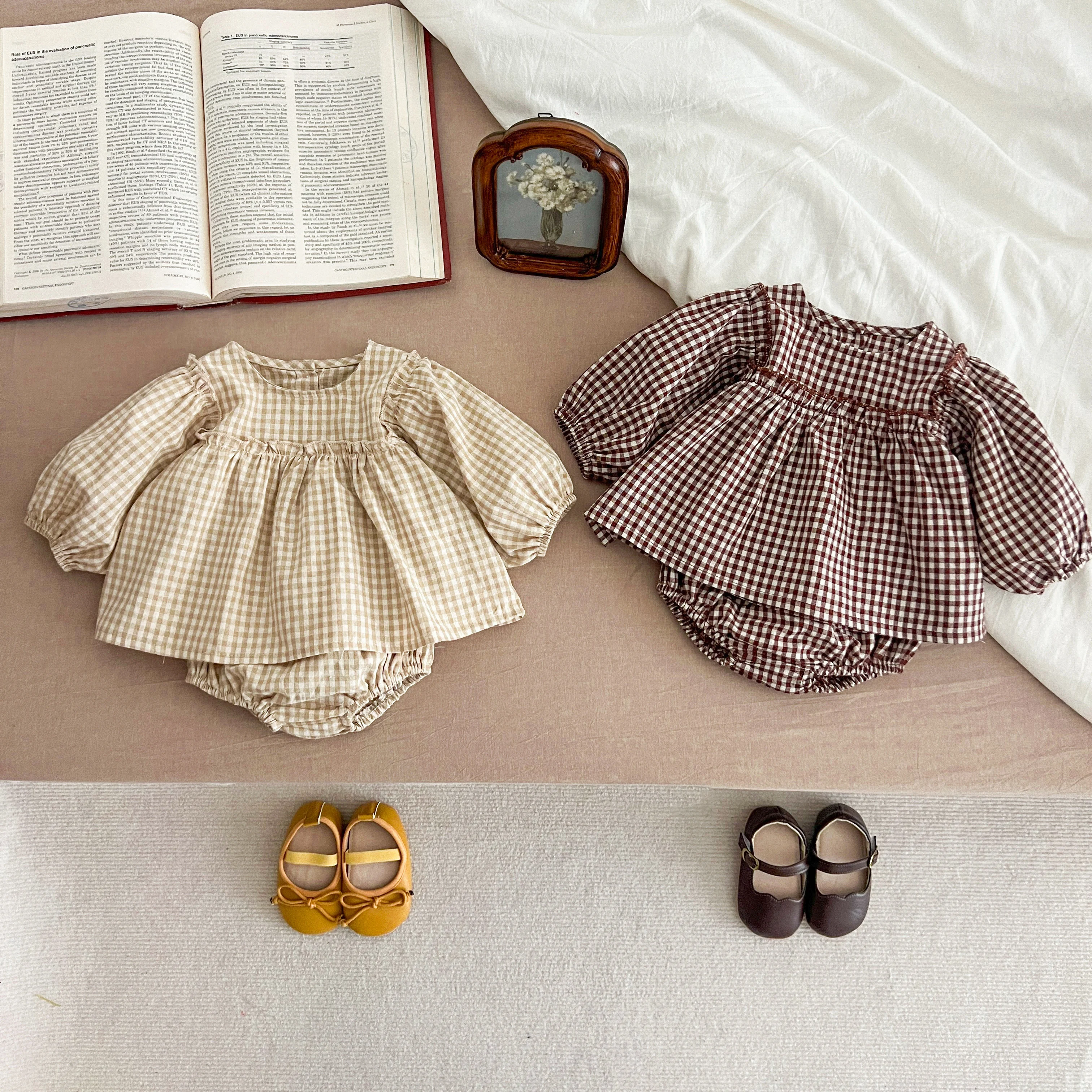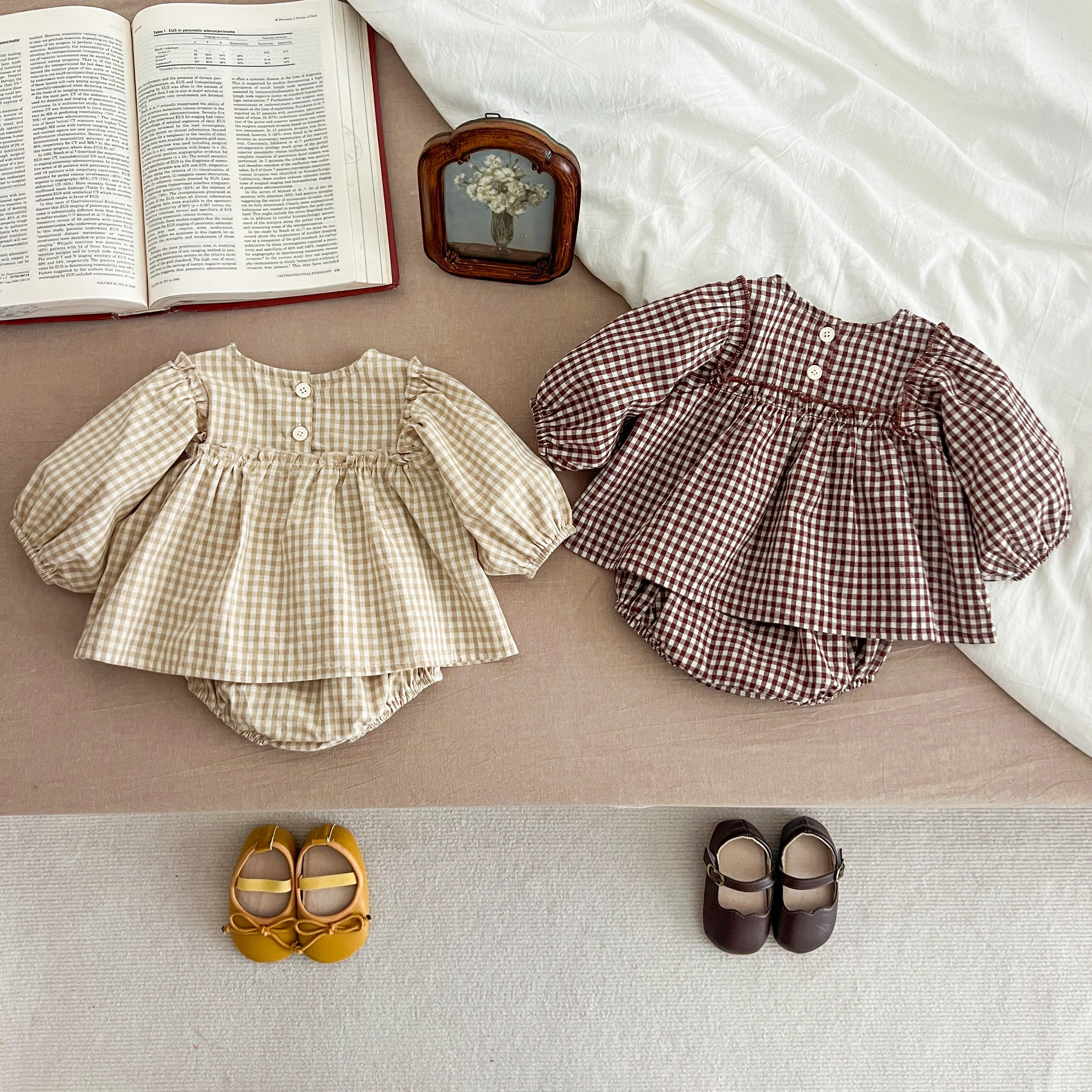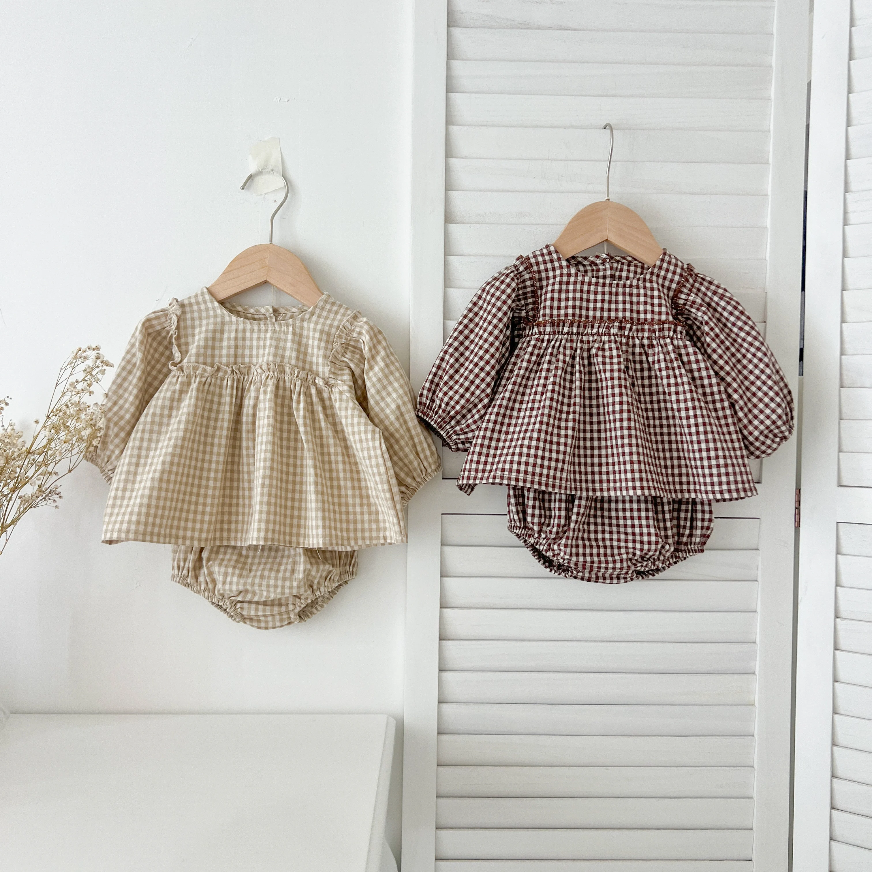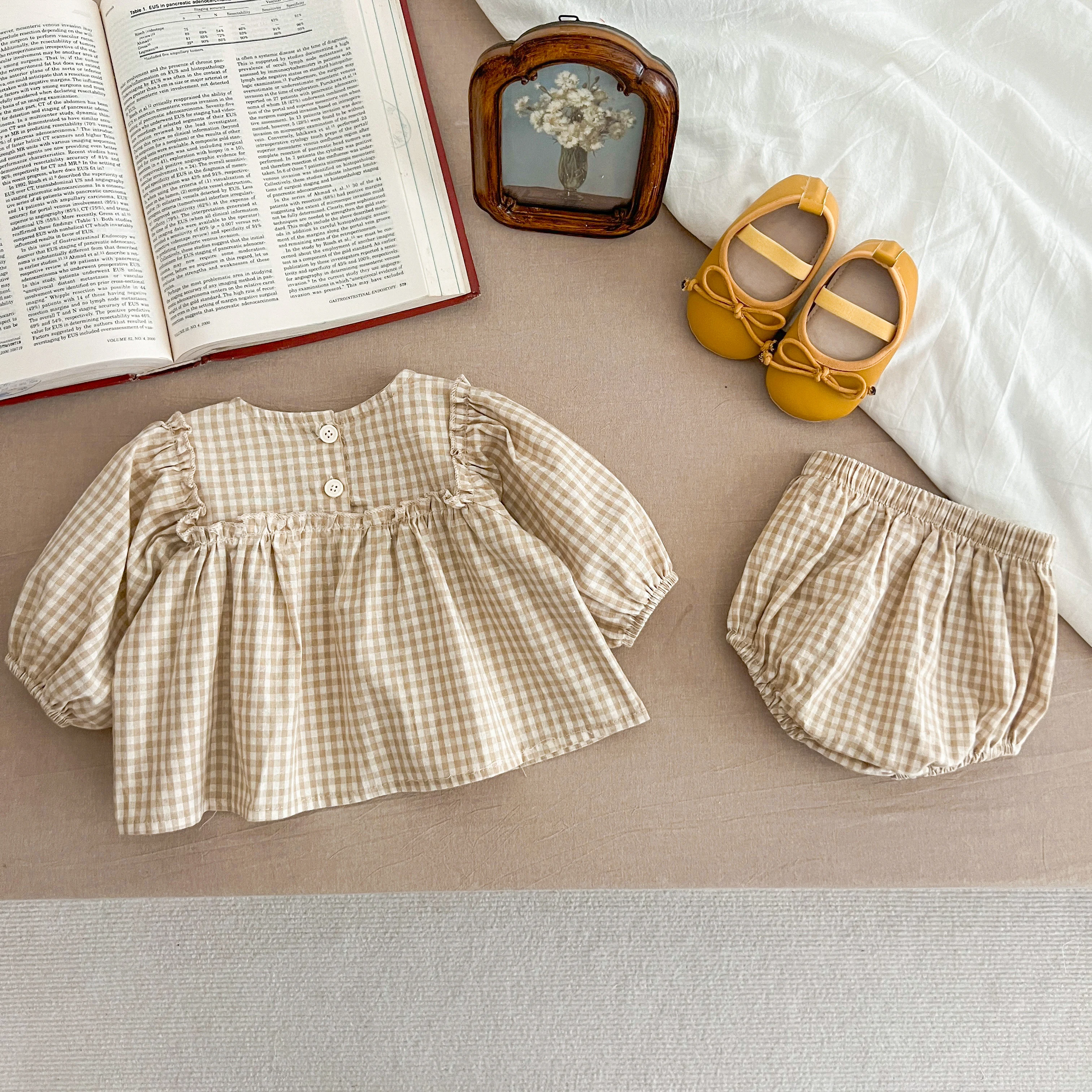 Baby Cotton Clothing Sets 0-2Yrs Autumn New Baby Girl Clothes Set Plaid Tee And Bloomer 2pcs Toddler Kids Vest + Shorts SuitSize:66(3M) 73(6M) 80(9/12M) 90(18/24M) 100(3T) 110(4T)