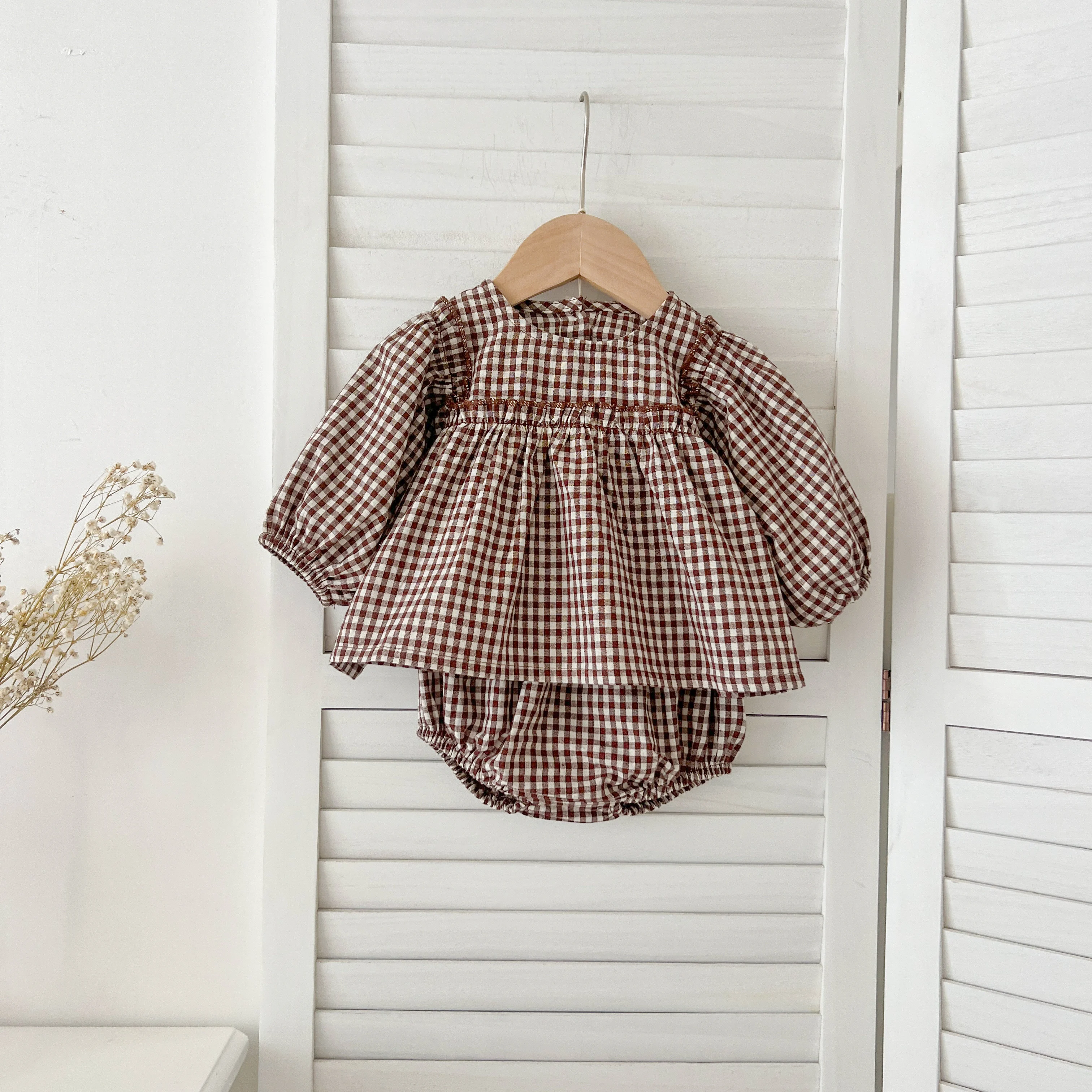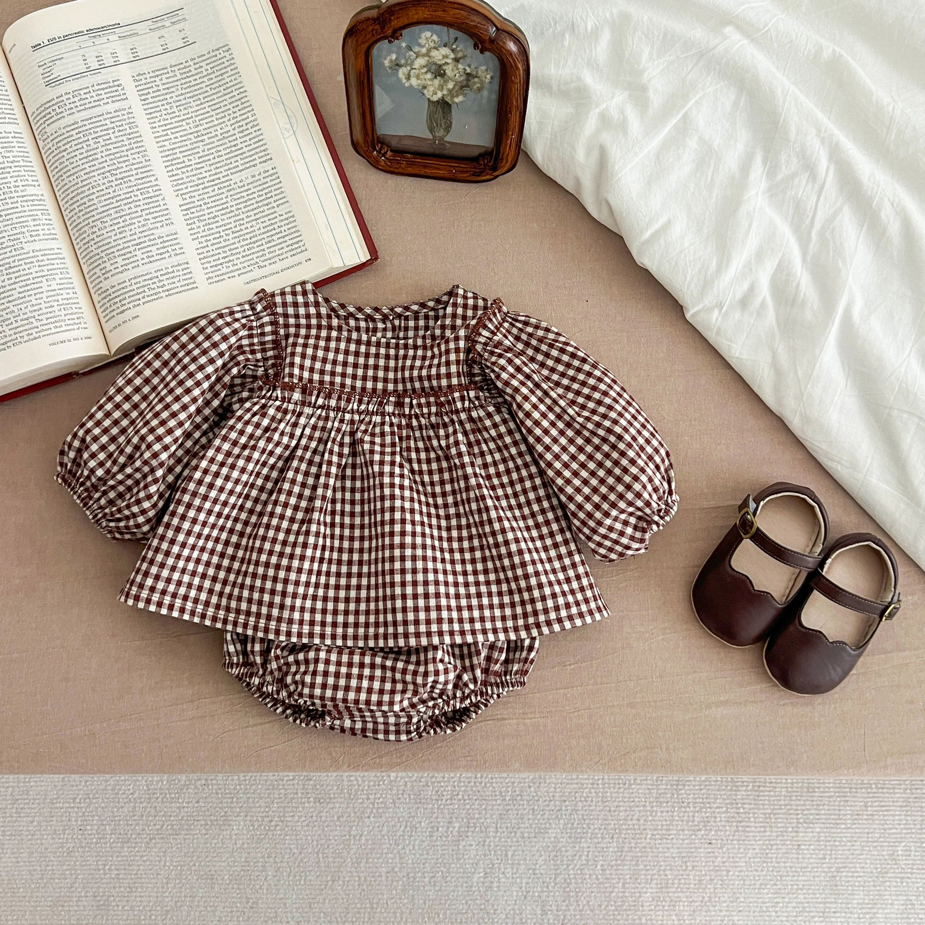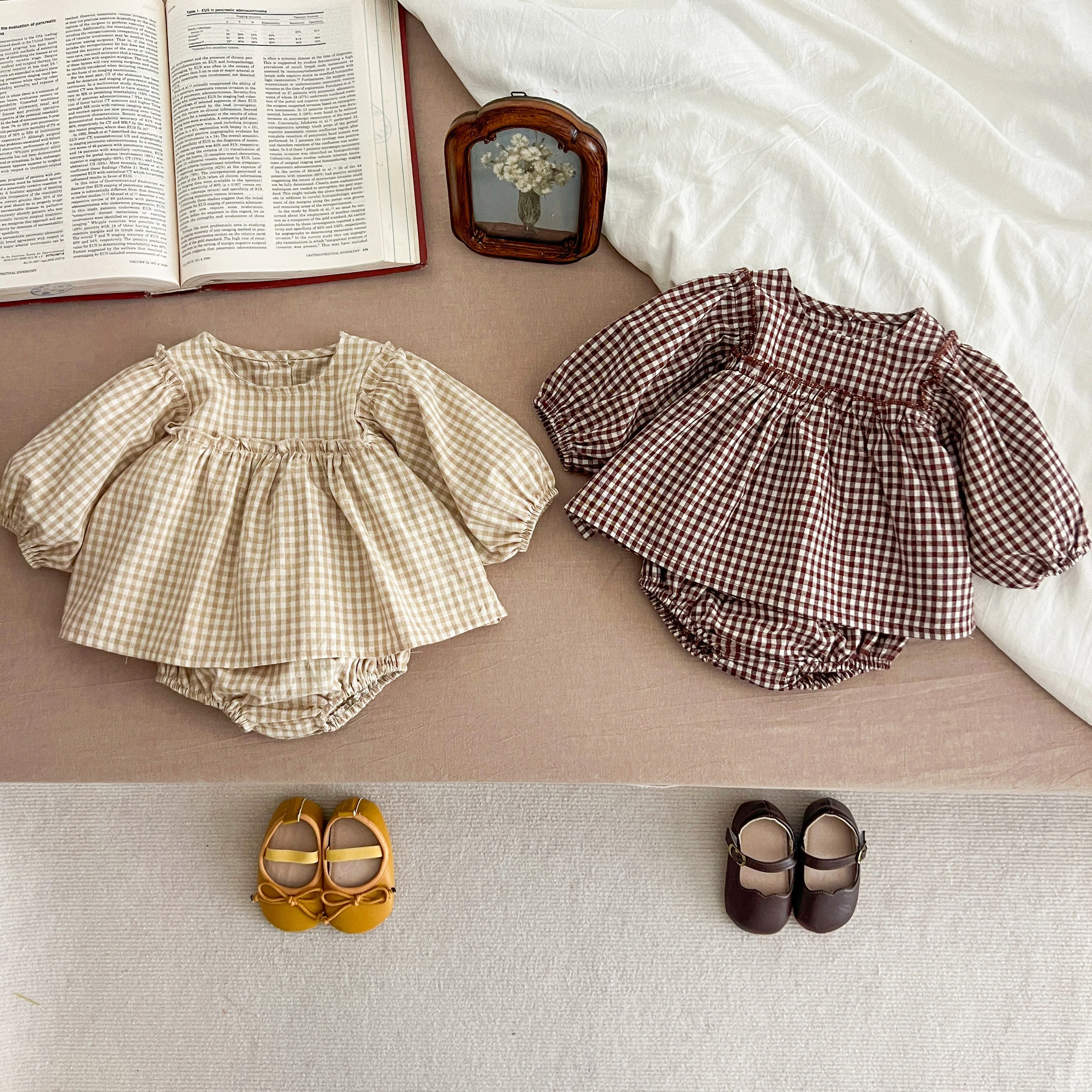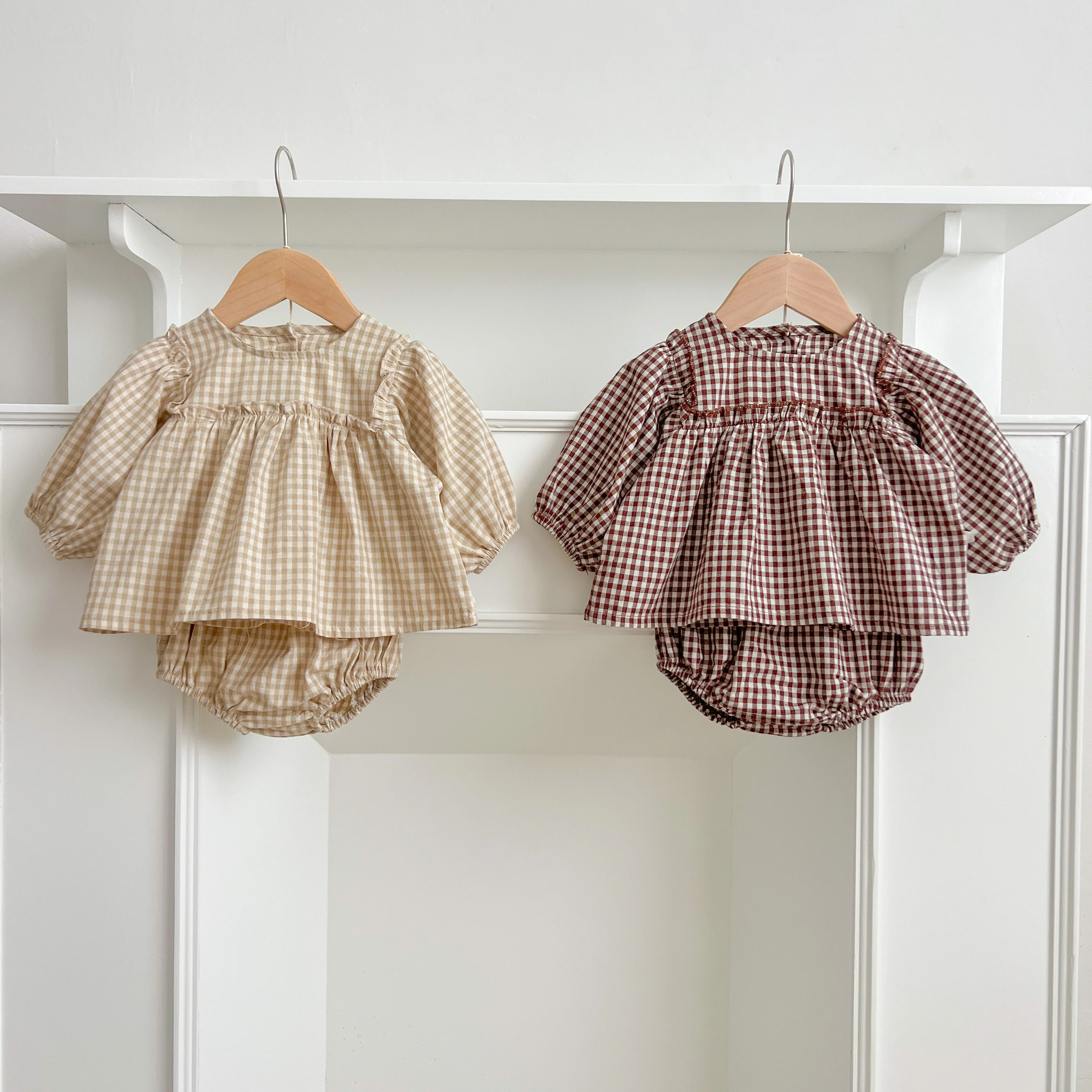 Baby Cotton Clothing Sets 0-2Yrs Autumn New Baby Girl Clothes Set Plaid Tee And Bloomer 2pcs Toddler Kids Vest + Shorts SuitSize:66(3M) 73(6M) 80(9/12M) 90(18/24M) 100(3T) 110(4T)