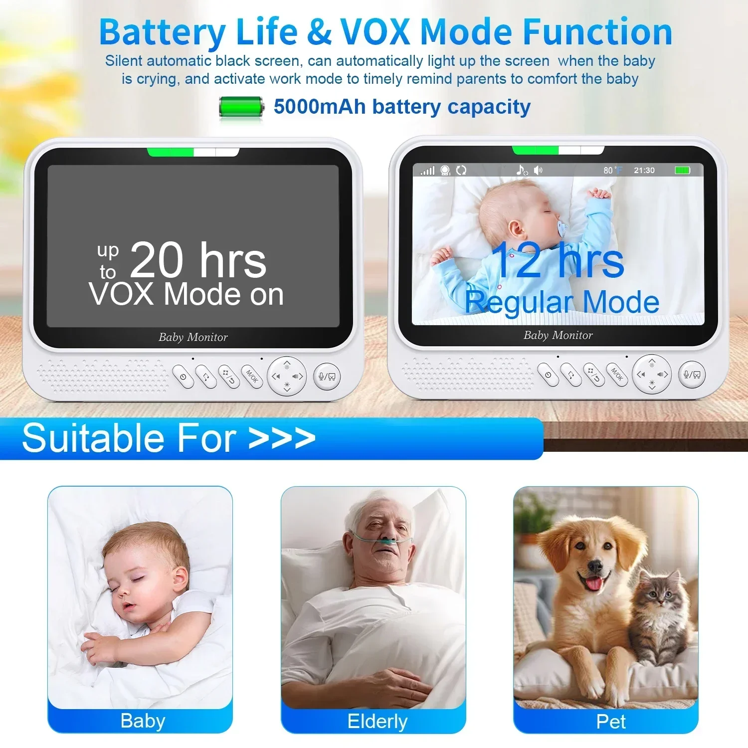 * The Wireless baby monitor With up to 20 hours of video streaming on a single charge when you turn on VOX mode. Up to 5000 mAh battery,Our portable baby monitor is so easy to use no hassle simply plug it in.