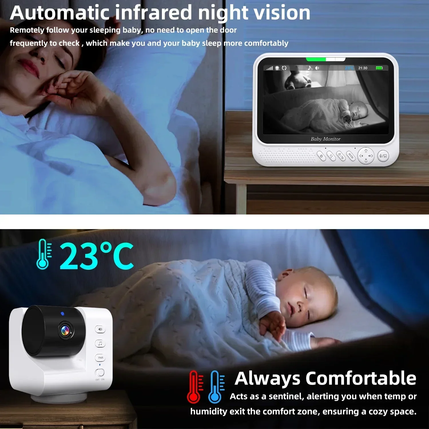 * Remotely follow your sleeping baby, no need to open the door frequently to check , which make you and your baby sleep more comfortably.