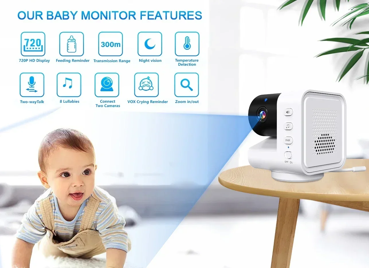 Feature: Intercom,Baby Cry Alarm,Motion Detection,Feeding Time Reminder,Temperature Monitoring,Humidity Monitoring,LCD Display,Nightlight,Power Saver,REMOTE CONTROL,Portable,Music