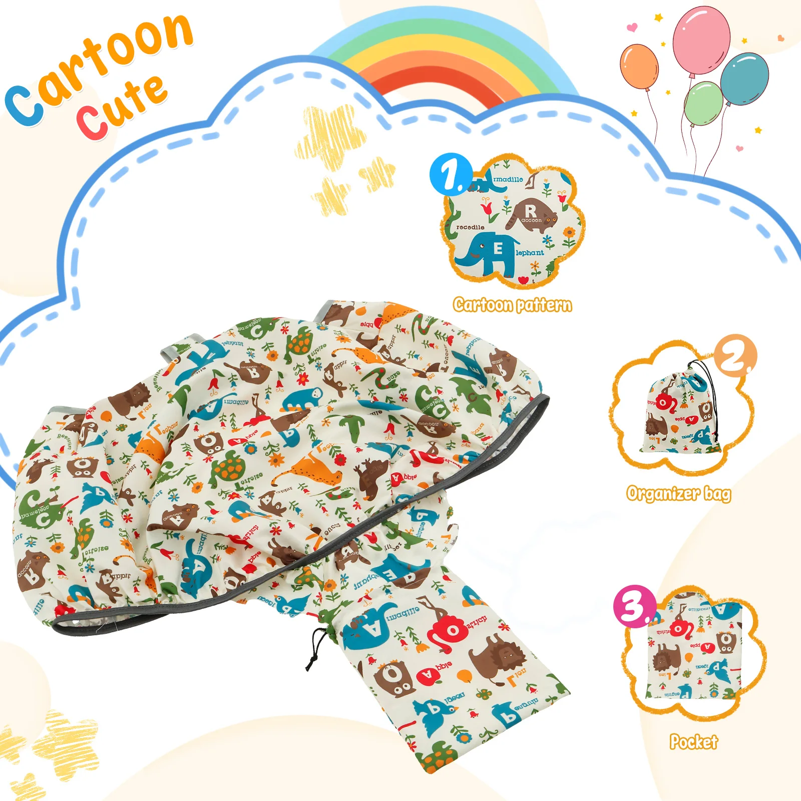 Easy to Store: Our cartoon style shopping cart cover comes with a portable storage bag, fold the shopping cart cover and put it into the storage bag when not in use, it takes up little space and is easy to carry and store