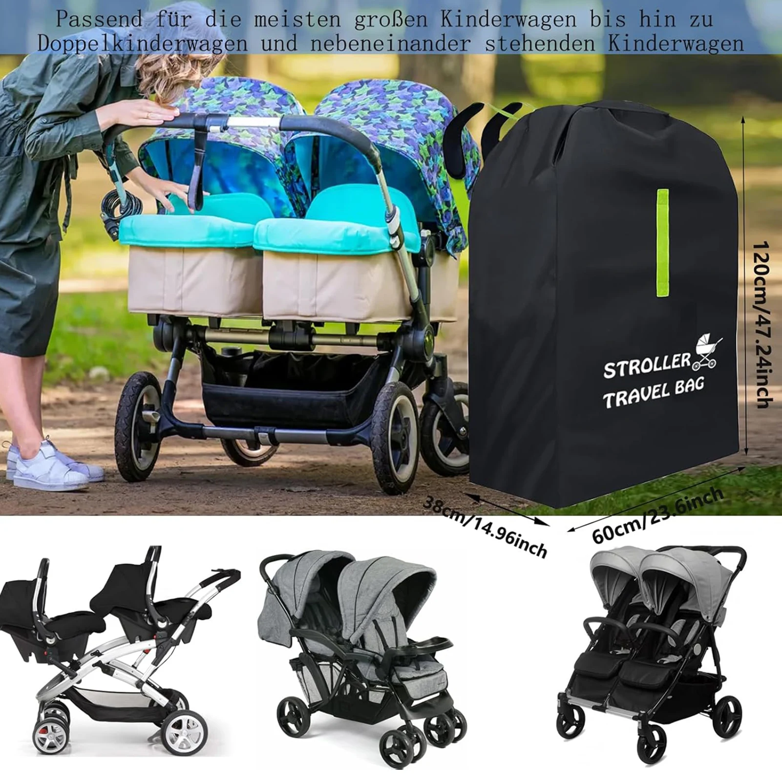 Double Pram Compatibility: Designed to fit most double prams and pushchairs, this travel bag offers a secure and convenient solution for transporting your stroller. Its compact and lightweight design makes it ideal for airplane gate checks and storage.