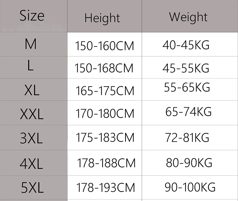 size_info: {"sizeInfoList":[{"length":{"cm":"150-160CM","inch":"59.06-160CM"},"size":"M","vid":-1},{"length":{"cm":"150-168CM","inch":"59.06-168CM"},"size":"L","vid":-2},{"length":{"cm":"165-175CM","inch":"64.96-175CM"},"size":"XL","vid":-3},{"length":{"cm":"170-180CM","inch":"66.93-180CM"},"size":"XXL","vid":-4},{"length":{"cm":"175-183CM","inch":"68.90-183CM"},"size":"XXXL","vid":-5},{"length":{"cm":"178-188CM","inch":"70.08-188CM"},"size":"4XL","vid":-6},{"length":{"cm":"178-193CM","inch":"70.08-193CM"},"size":"5XL","vid":-7}]}