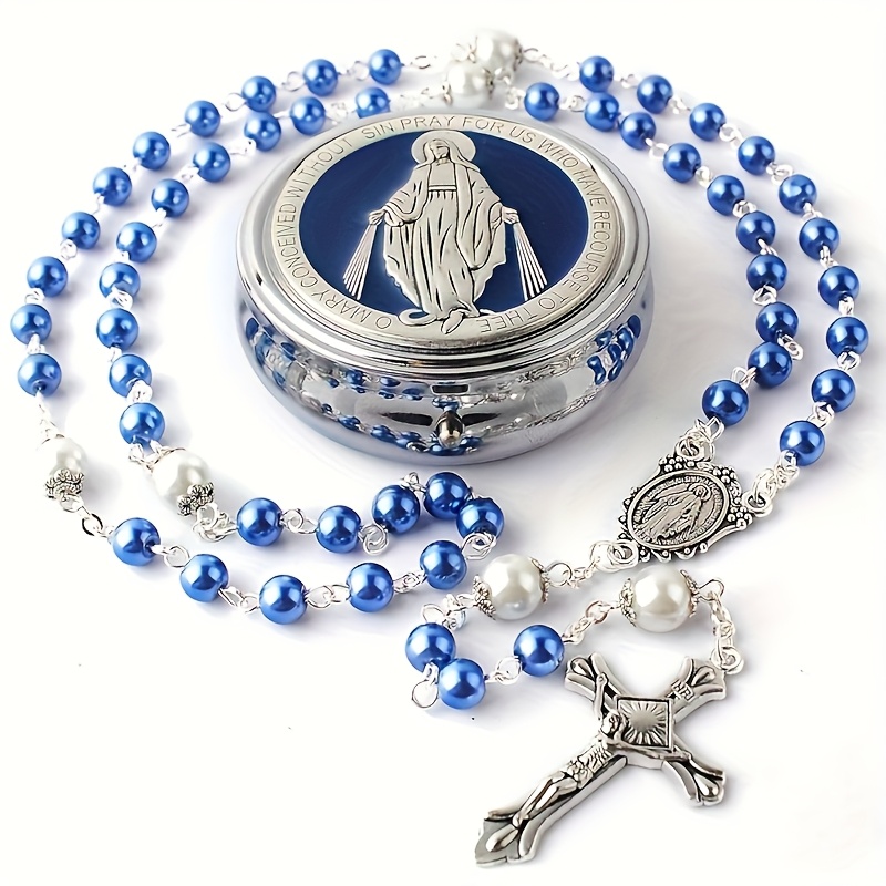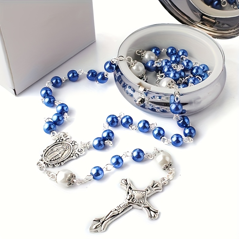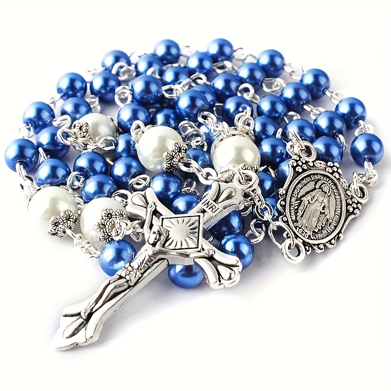 Blue Rosary Cross Pendant Necklace for Men, 6mm Faux Imitation Pearl Prayer Chai