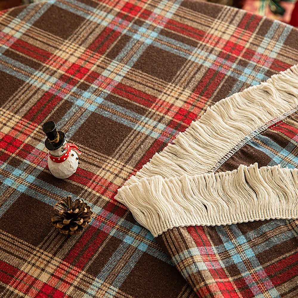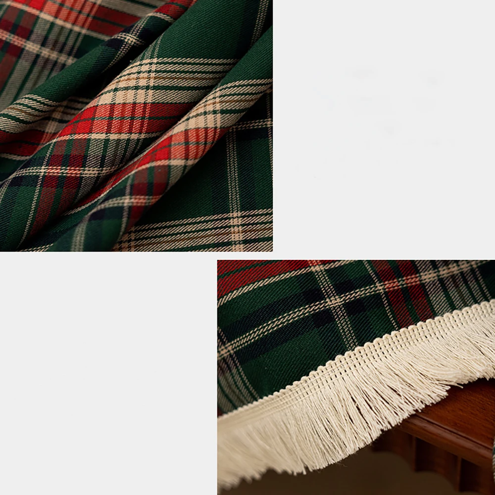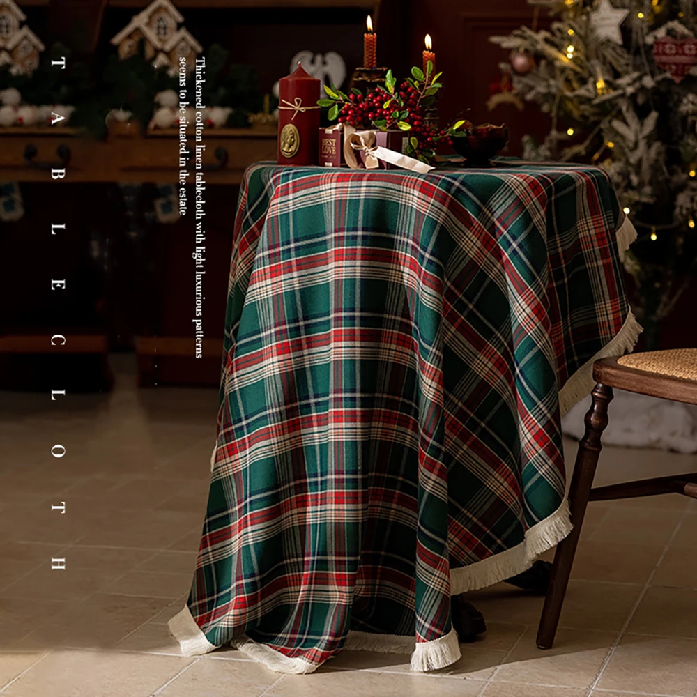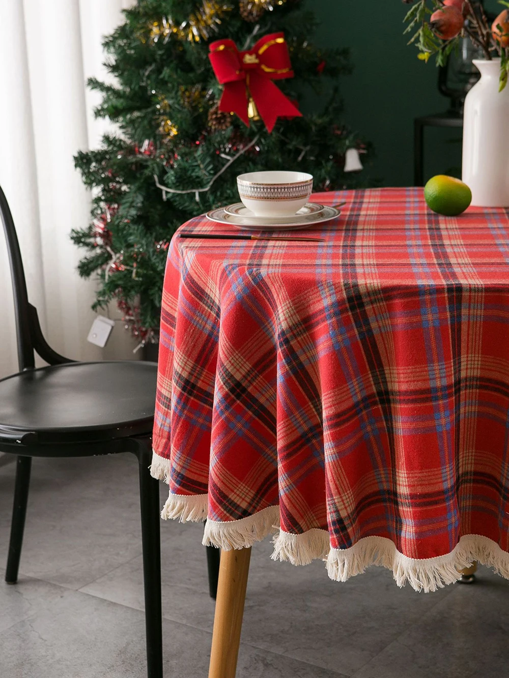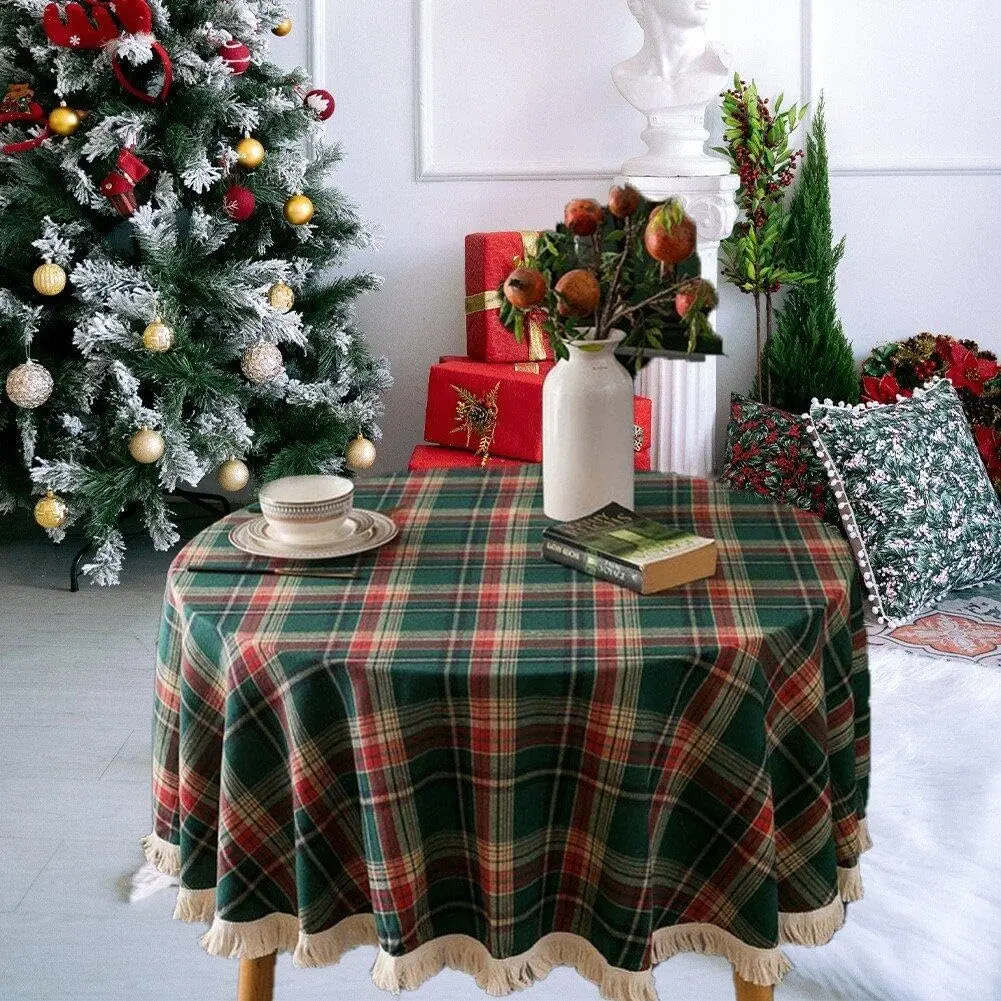 Christmas Round Tablecloths Retro Checkered Fabric Dust-Proof Washable Table Cov