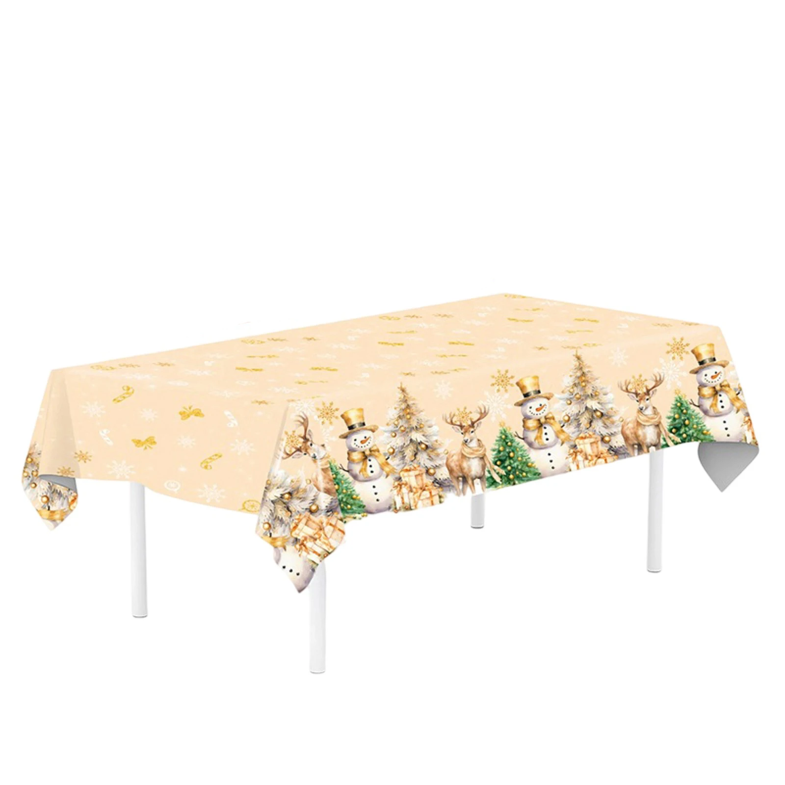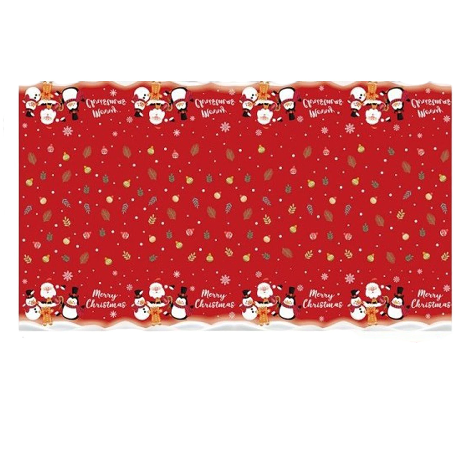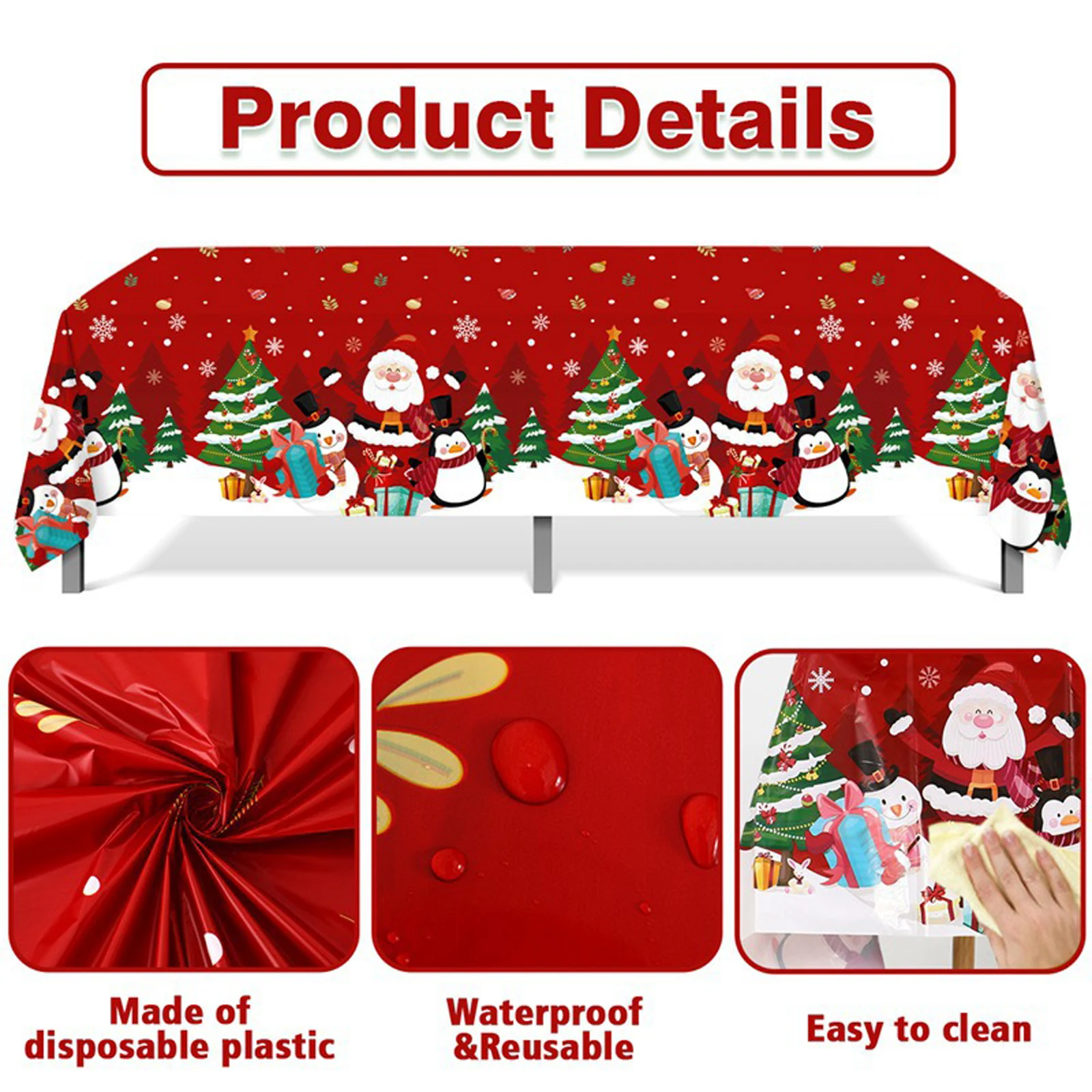 Design: This Christmas-themed disposable PE tablecloth is designed to the festive spirit of your party decor, high-definition print depicts in classic holiday poses—waving a gift bag,sitting by the Christmas tree, or laughing with reindeer—with accents like snowflakes, candy canes, and "Merry Christmas." Made of thick, PE material, the tablecloth measures 54 x 108 inches,making it suitable for most rectangular dining or party tables. Its smooth, waterproof surface resists spills and stains, and its neatly trimmed edges provide a clean, crisp look.The print, made with fade-resistant, ink, features Christmas hues (red, gold, and green) that stay even under party lights.Use: Primarily designed as a decorative and protective tablecloth for Christmas parties, it eliminates the hassle of post-meal cleaning. It protects tables from food spills,drink splashes, and scratches, while the Santa-themed print adds an instant festive to any party space. Besides covering tabletops,it can also serve as a makeshift for a photo booth, a rug for a children's play area (to catch or craft scraps),or wrapping paper for large party favors—adding versatility to party preparations.Suitable for: Perfect for family use, whether it's Christmas Eve dinner, a family brunch, a child's Santa-themed birthday party, or a casual holiday gathering.It's a must-have for party venues, event spaces, or centers hosting Christmas events, simplifying both set-up and for large gatherings.It's also perfect for holiday parties, church potlucks, or school Christmas celebrations, where quick, affordable decorating and easy are key.It's also perfect for outdoor winter parties (with a cover), protecting tables from moisture and windblown debris.Gift: A practical and thoughtful gift for anyone hosting a Christmas party—friends, family, coworkers, or neighbors. Its festive design, disposable convenience,and multi-pack value make it a great addition to holiday gift baskets, host and hostess gifts, or Santa exchanges. This is especially practical for busy party hosts,saving time on post-party while still maintaining a decorative. It's a quick, easy, and meaningful gift.Exquisite Craftsmanship and Premium Quality: Made from thick, high-grade PE, it resists tears or punctures, even from heavy utensils or sharp cutlery.The waterproof surface liquids from seeping through the tabletop, and the, BPA-free ink ensures food contact safety (FDA-compliant).The print is even and won't or bleed, and the edges are smooth. Each tablecloth is quality-inspected to ensure consistent size, crisp print,and durability, ensuring it lasts throughout the entire party, from set-up to clean-up, without compromising its functionality and decorative.Includes: 1 tablecloth