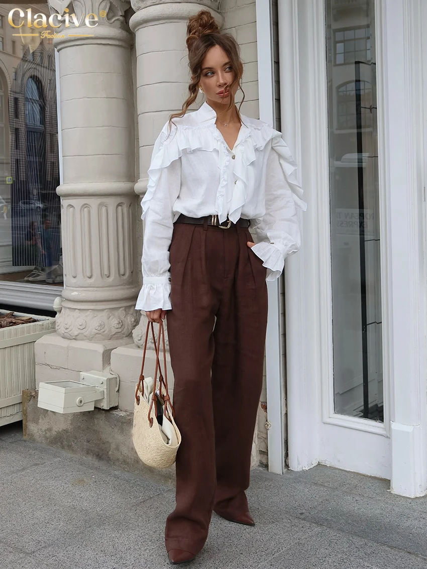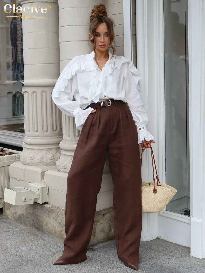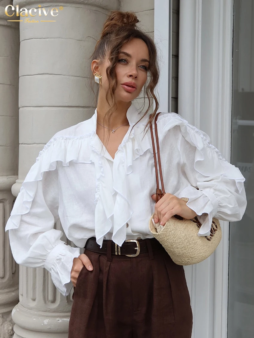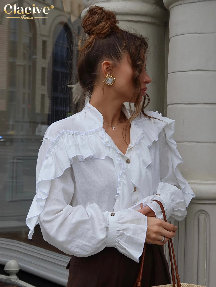 Clacive Fashion Loose White Linen Women's Shirt 2025 Casual Stand Collar Long Sl