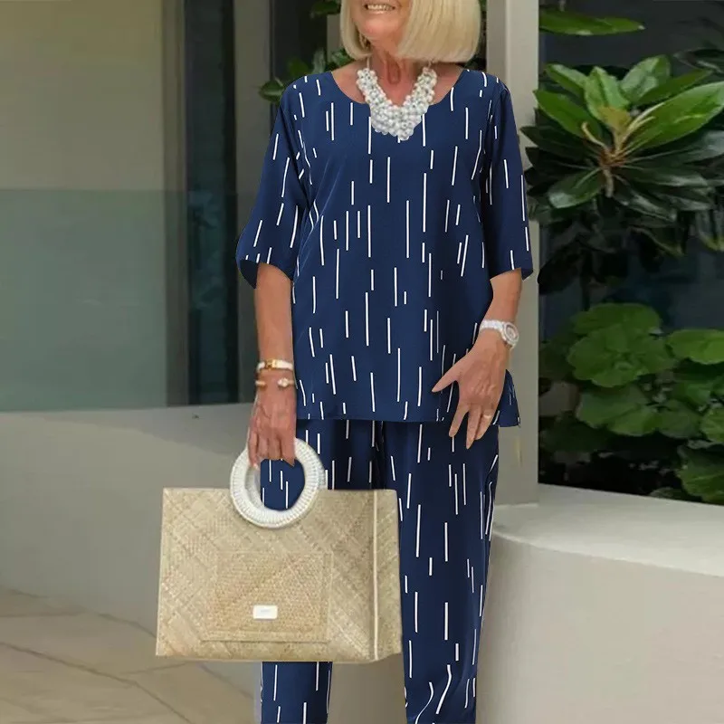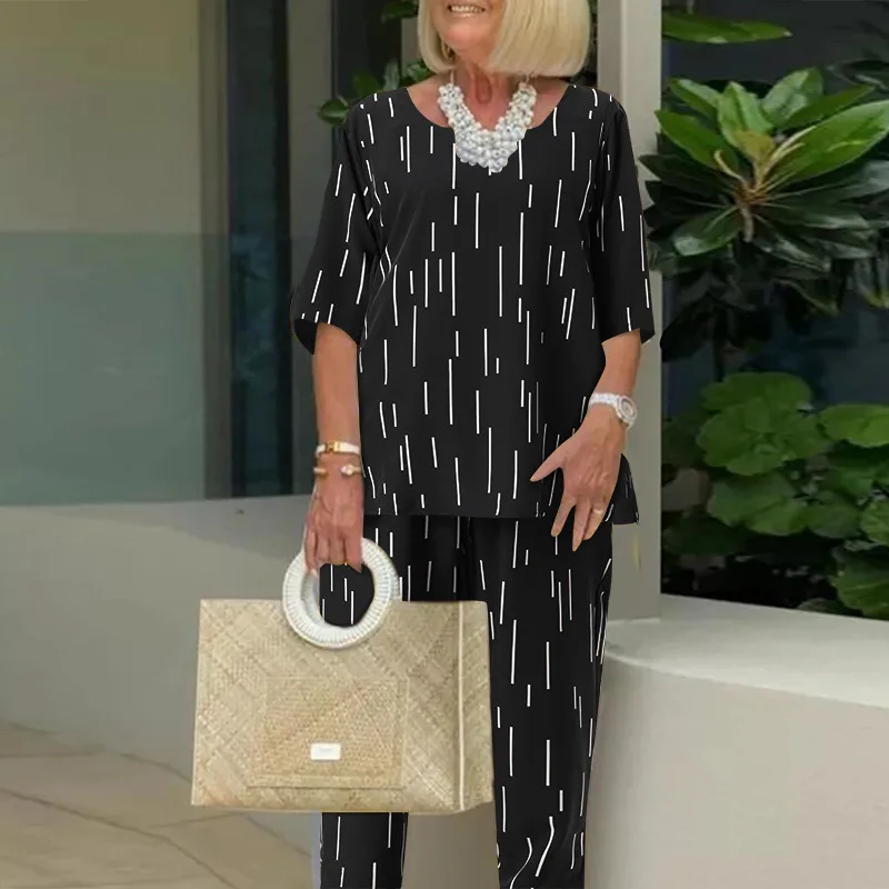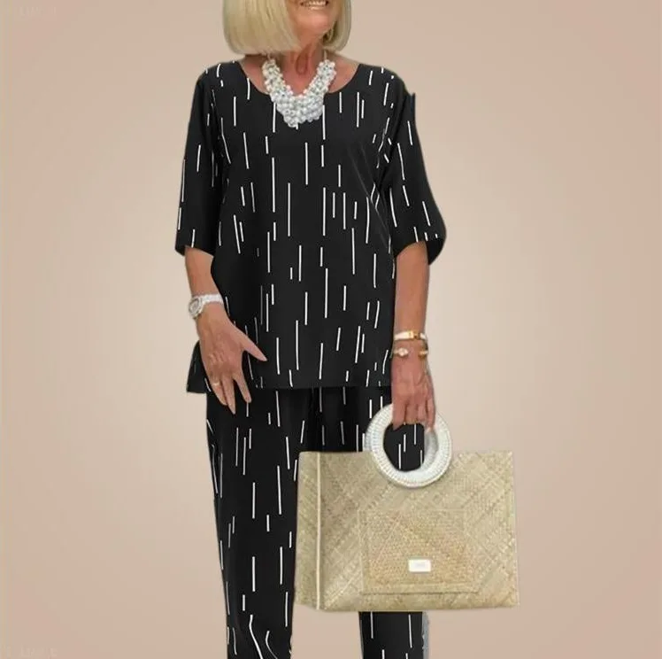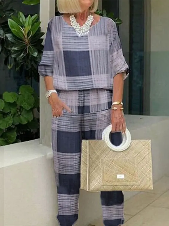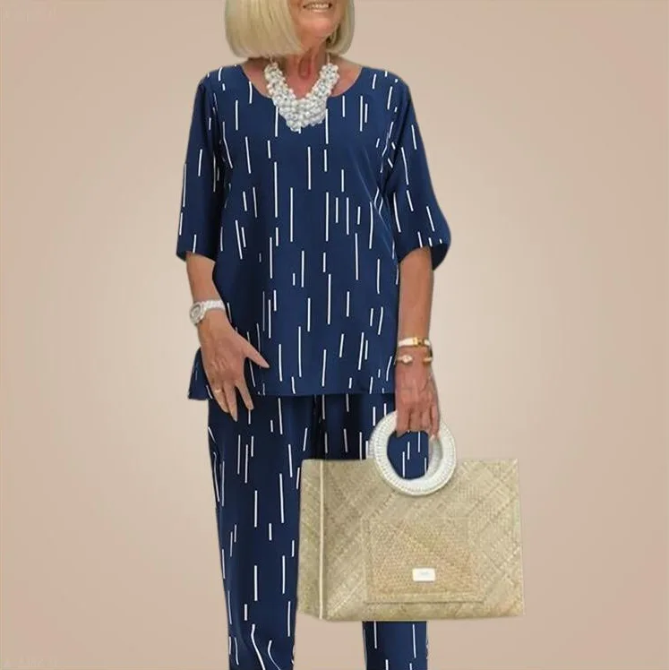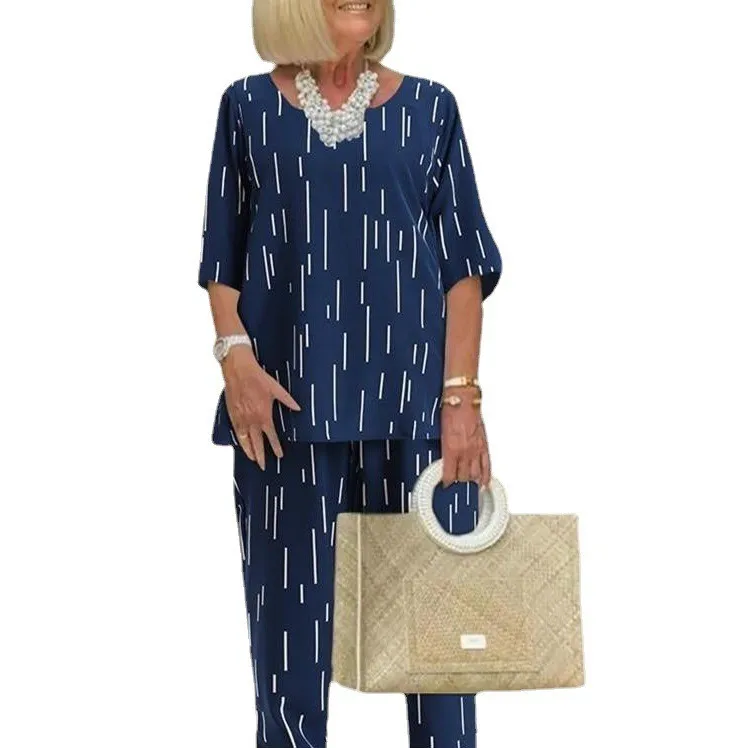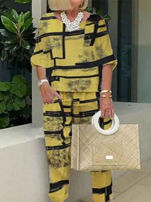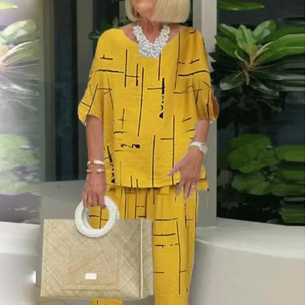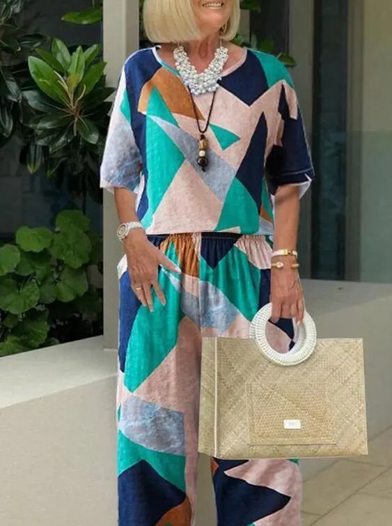 Cotton Linen Print Summer Womens Pant Sets Loose Half Sleeve T Shirt And Trouser