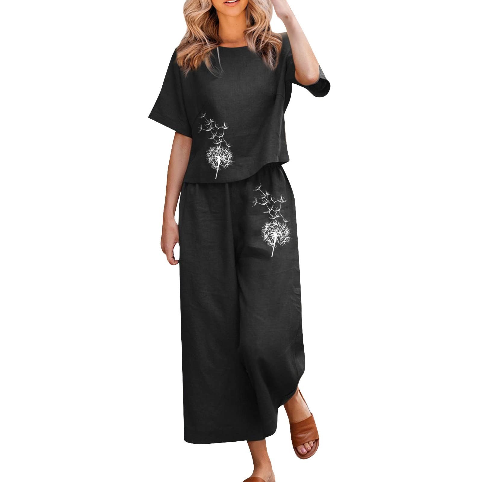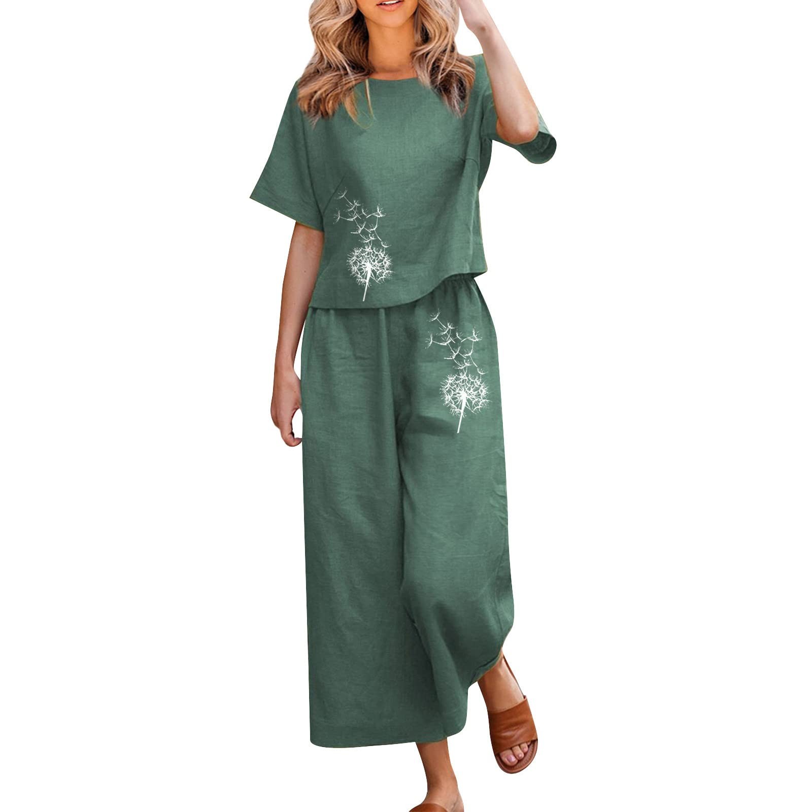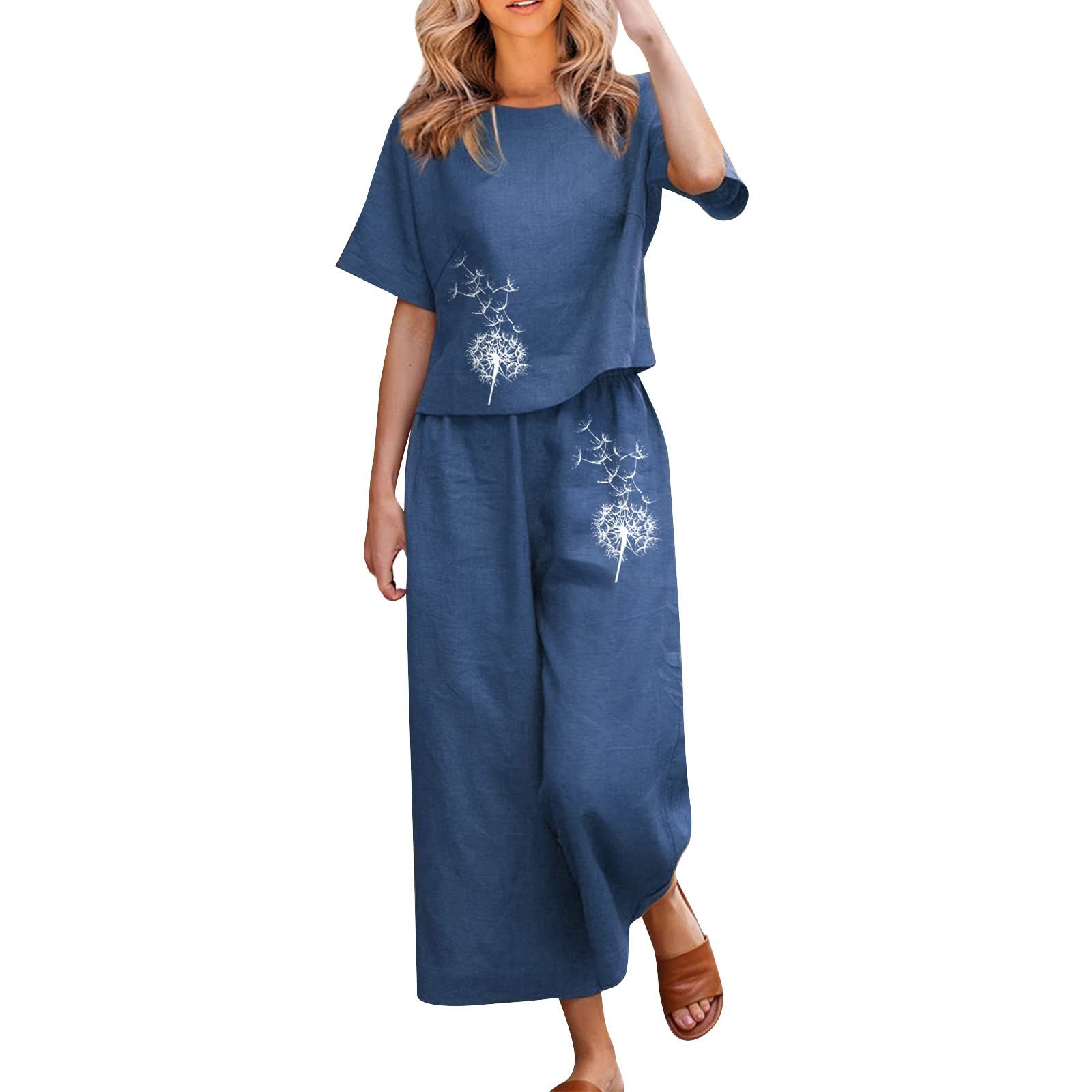 Linen Sets For Women 2 Piece Ladies Cotton Short Sleeve Printed Blouse Loose Cropped Pants Two Piece Suit Pant Suits