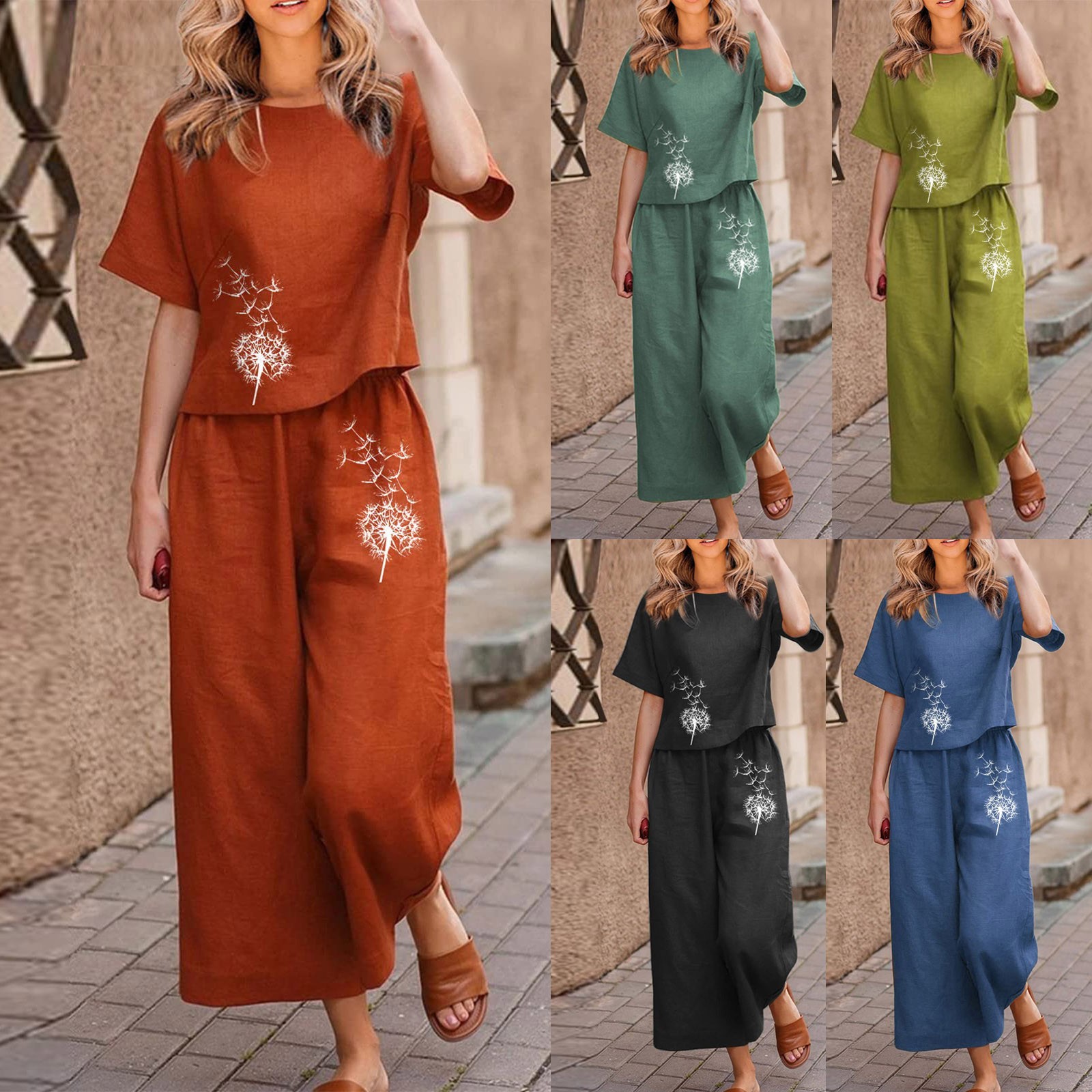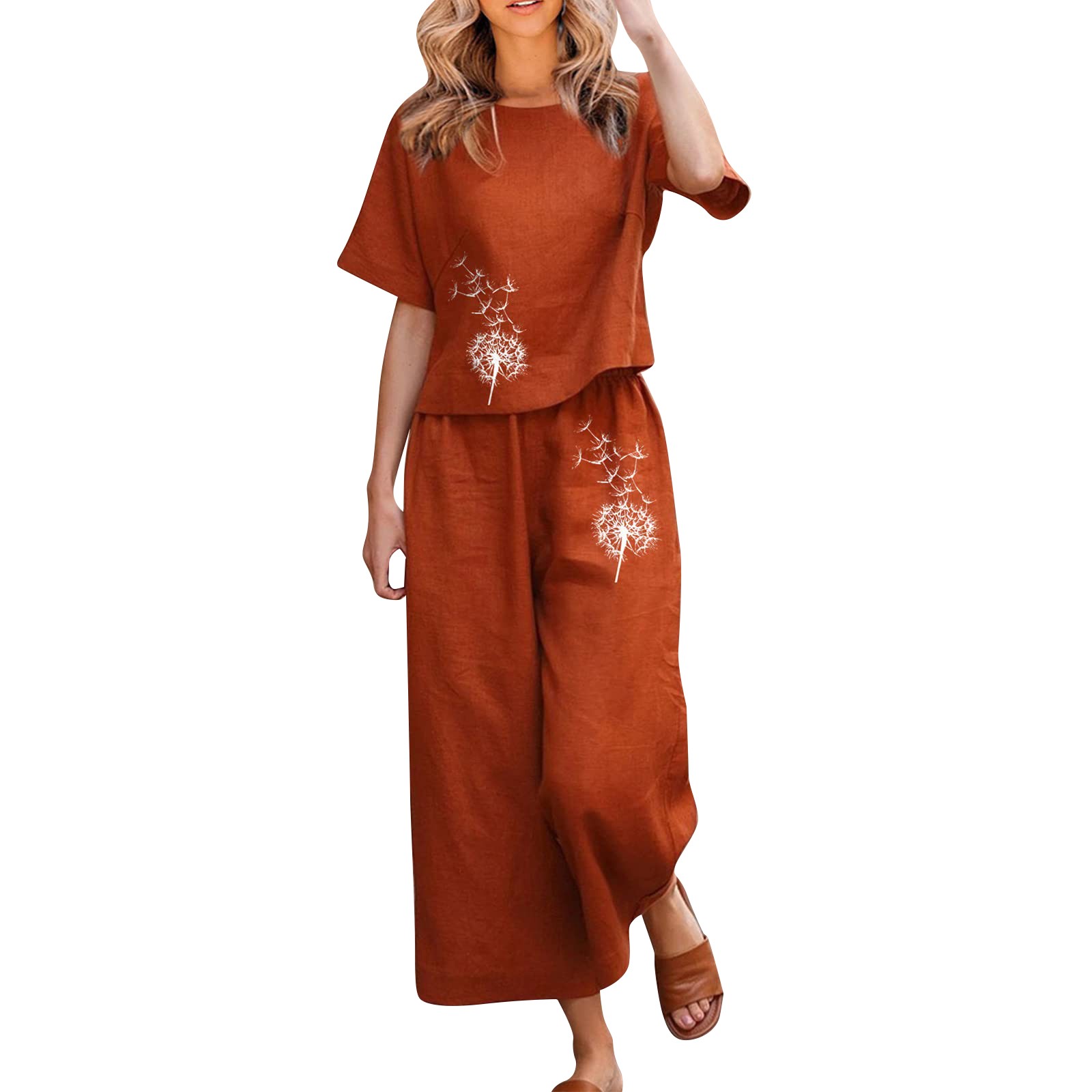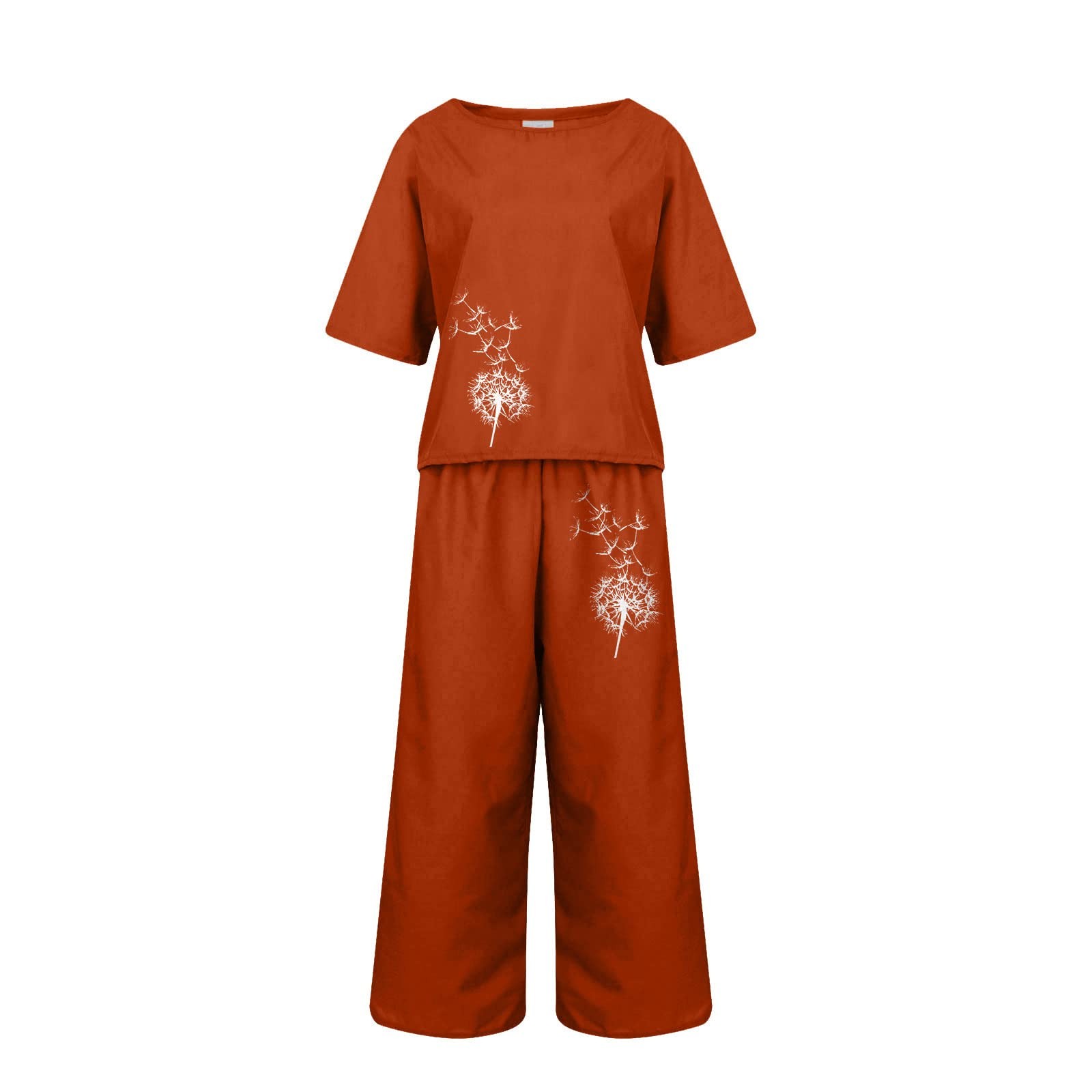 Linen Sets For Women 2 Piece Ladies Cotton Short Sleeve Printed Blouse Loose Cropped Pants Two Piece Suit Pant Suits