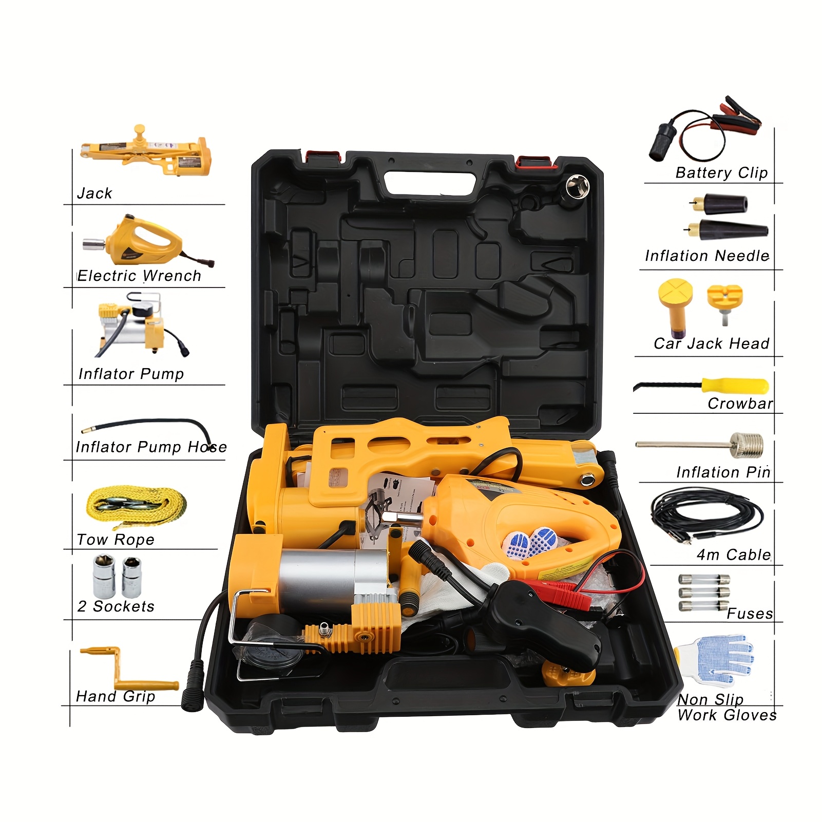 Comprehensive Set: Providing a 100W electric jack with a maximum load capacity of 3T, an inflator pump with maximum pressure of 150psi, and an 80W electric impact wrench, this set caters to a wide range of applications