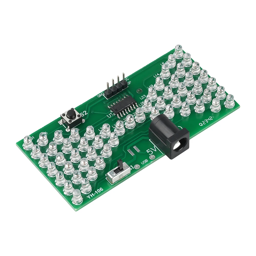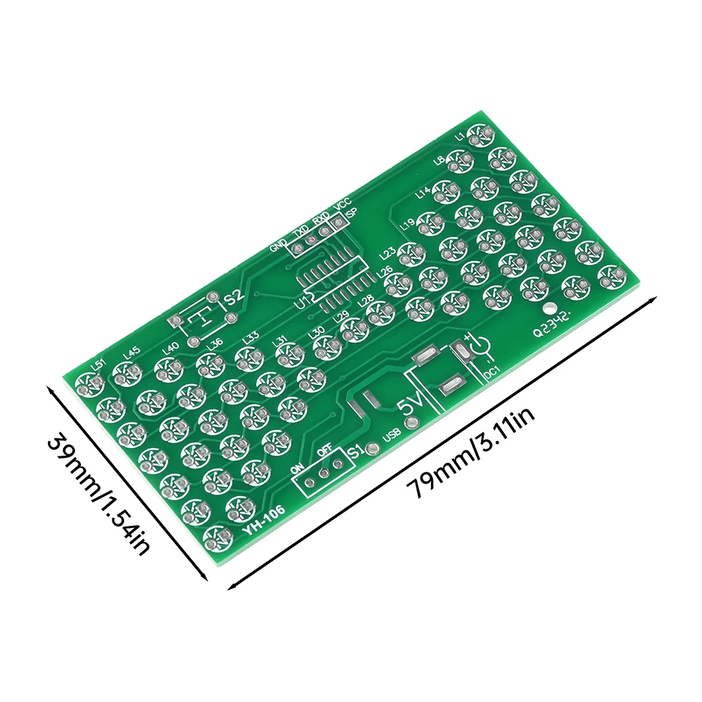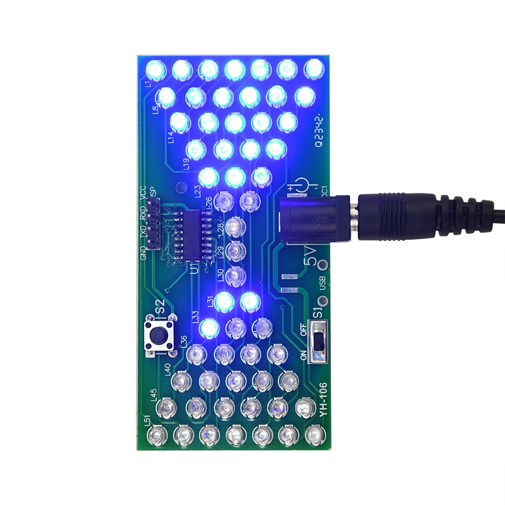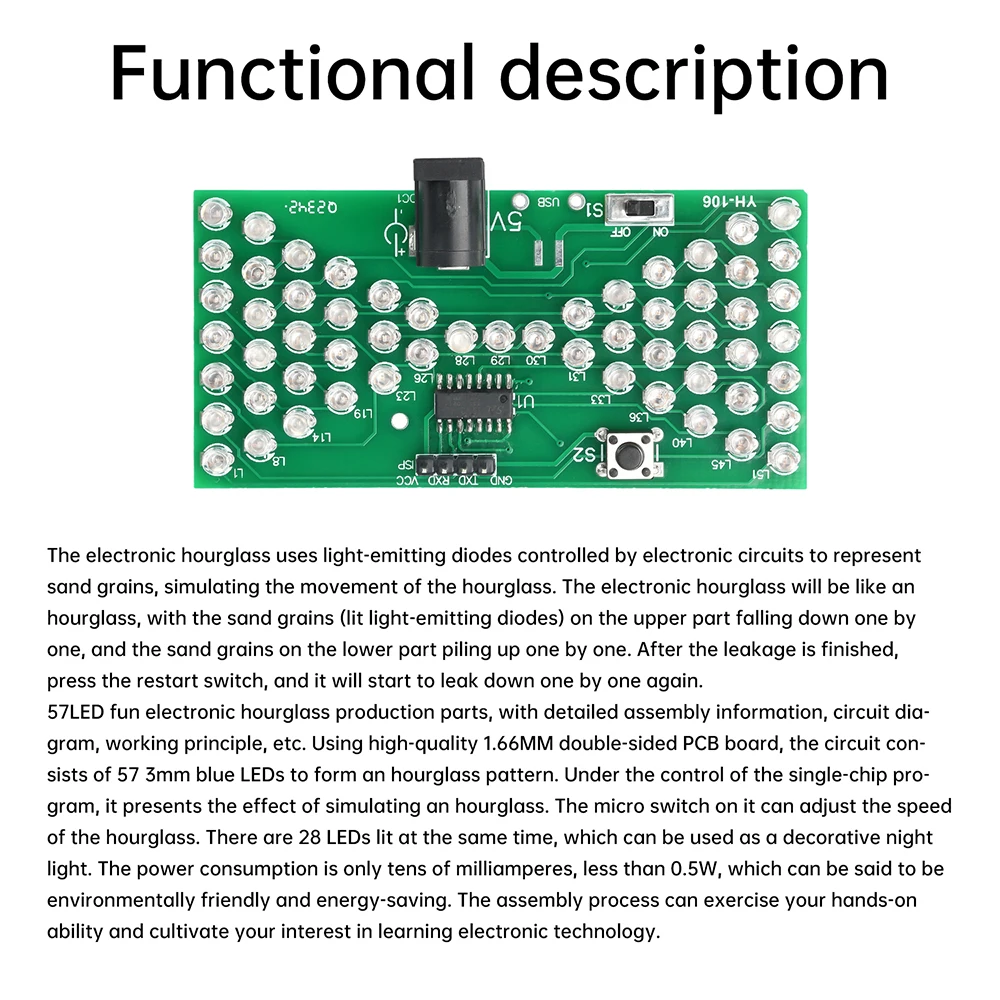 57LED fun electronic hourglass production bulk, using high-quality 1.66MM double-sided PCB board, the circuit consists of 57 3mm blue LEDs composed of hourglass pattern, under the control of the microcontroller program, presenting the effect of simulated hourglass, above the microswitch can be debugged hourglass speed, the number of LEDs lit at the same time, there are 28, can be used as a decorative night light, power consumption is only tens of milliamps, less than 0.5W, can be said to be environmentally friendly and energy saving. The assembly process can exercise your hands-on ability, cultivate interest in learning electronic technology.Package include: