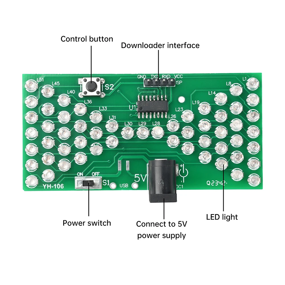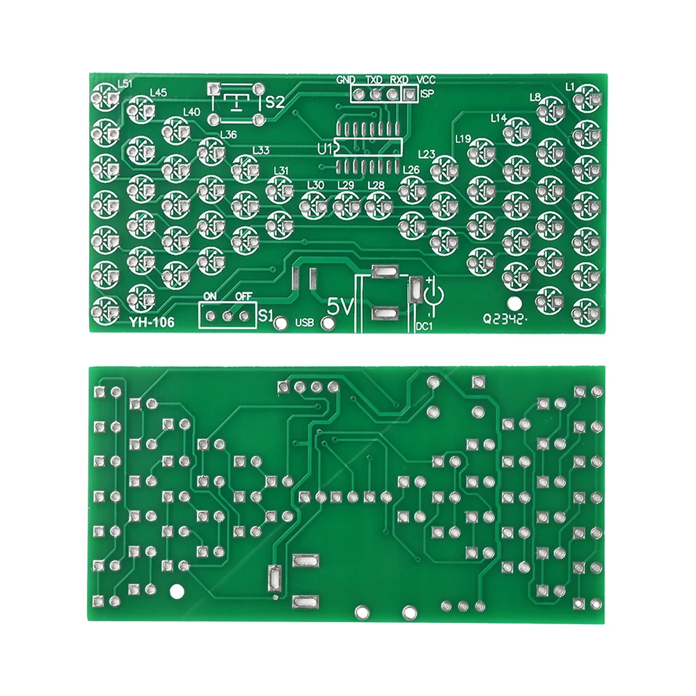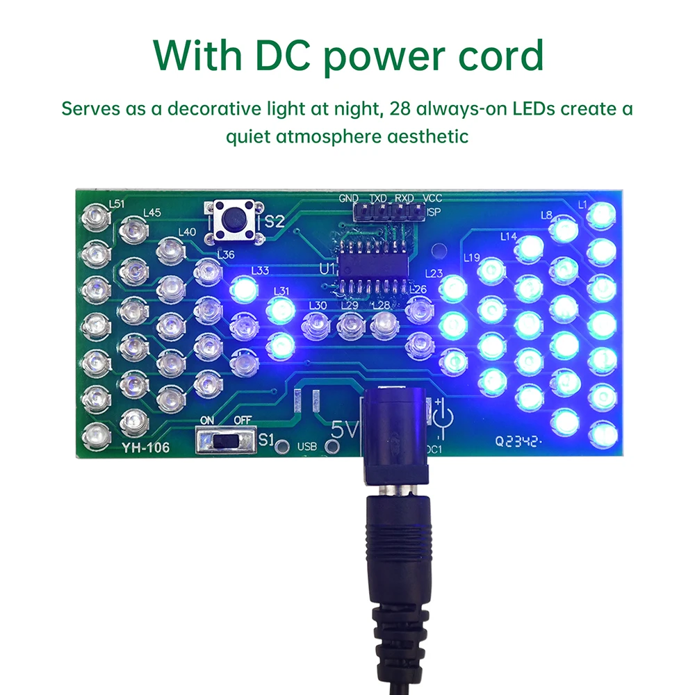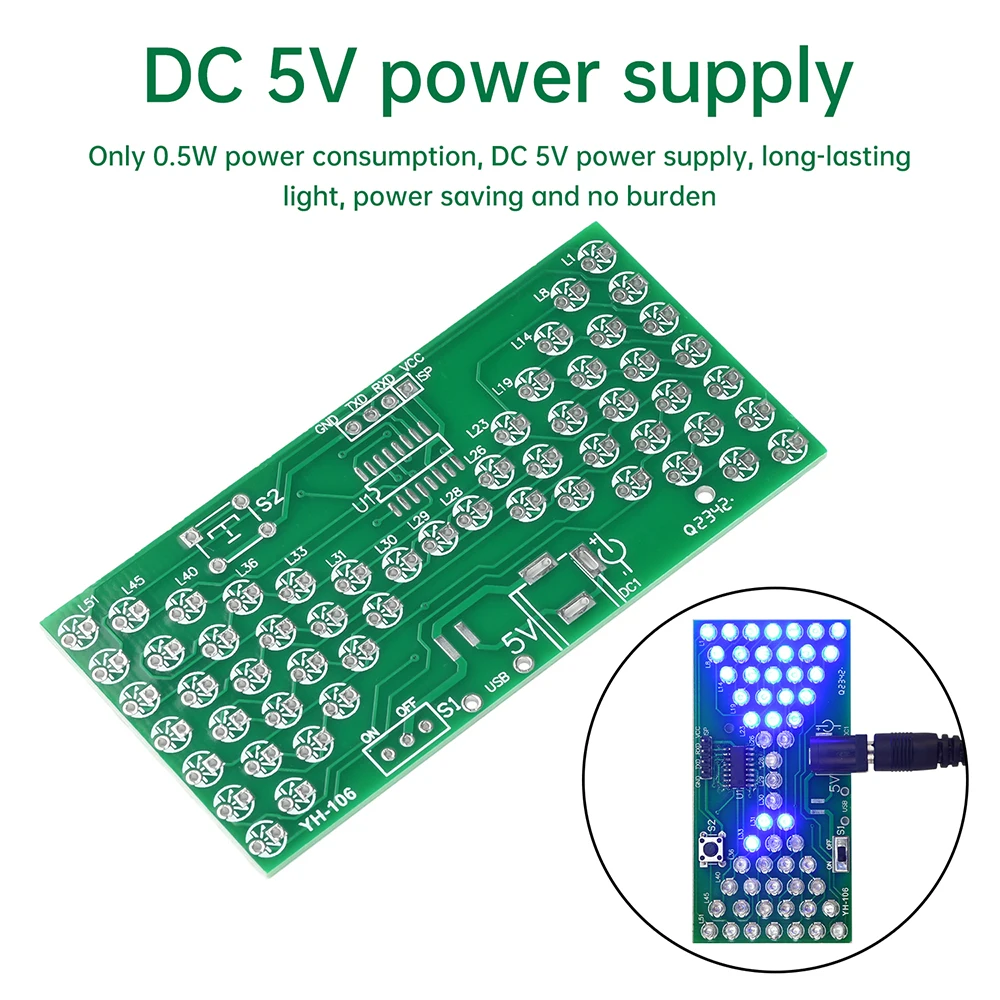 57LED fun electronic hourglass production bulk, using high-quality 1.66MM double-sided PCB board, the circuit consists of 57 3mm blue LEDs composed of hourglass pattern, under the control of the microcontroller program, presenting the effect of simulated hourglass, above the microswitch can be debugged hourglass speed, the number of LEDs lit at the same time, there are 28, can be used as a decorative night light, power consumption is only tens of milliamps, less than 0.5W, can be said to be environmentally friendly and energy saving. The assembly process can exercise your hands-on ability, cultivate interest in learning electronic technology.Package include: