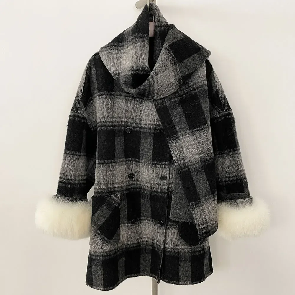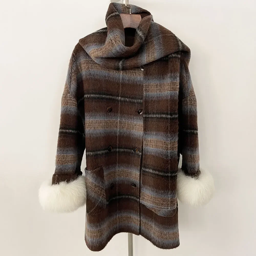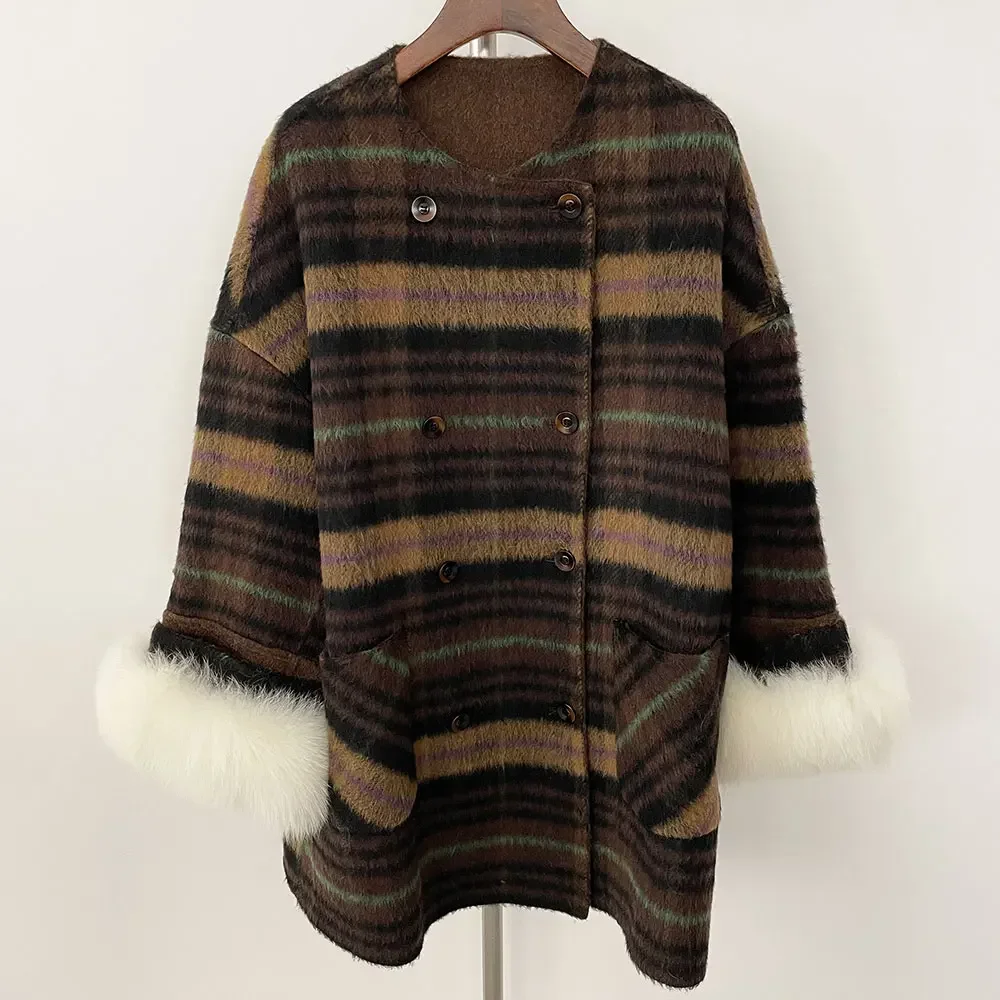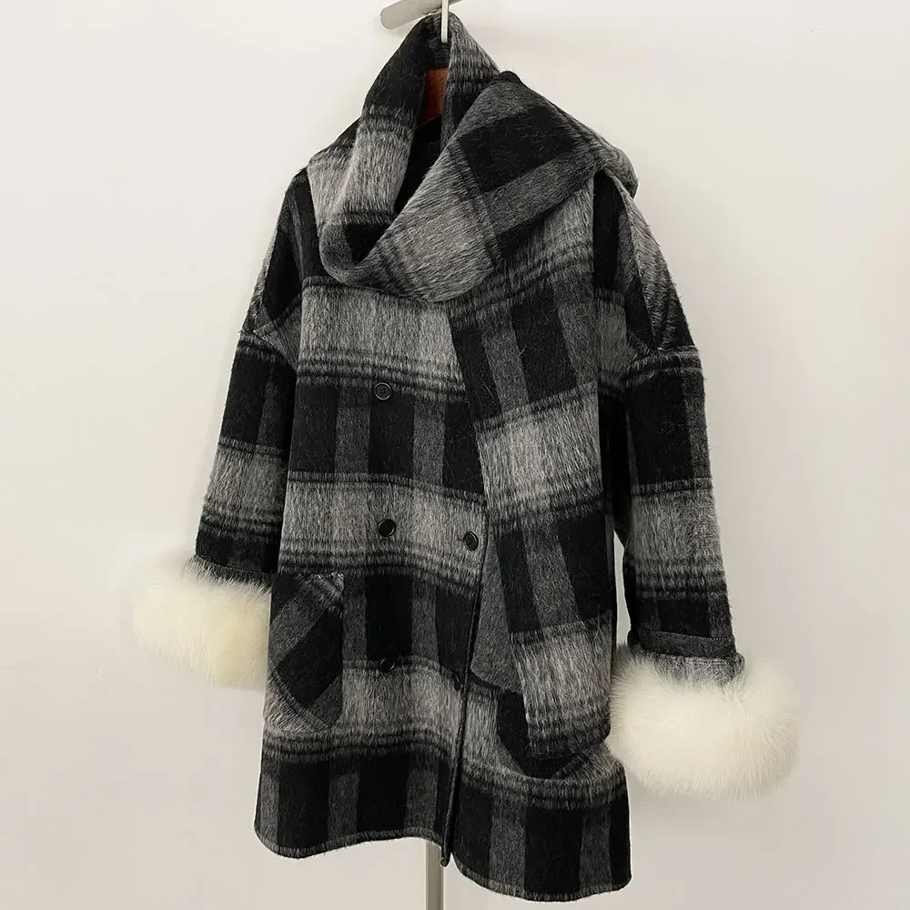 Fashion 2024 Winter Women Coat Real Natural Fox Fur Cuff Turn-down Double-faced