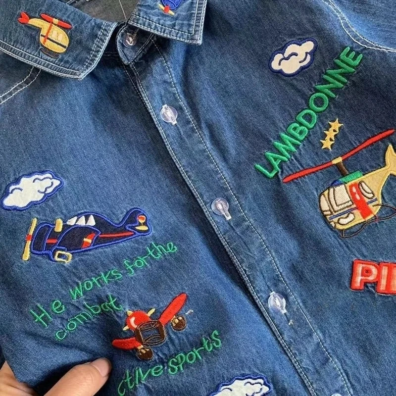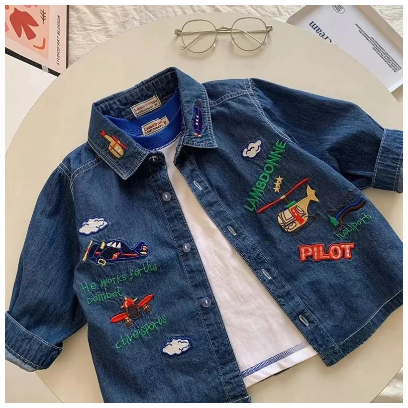 Fashion Boys denim shirt cartoon Embroidery Kids long sleeve Coat children loose