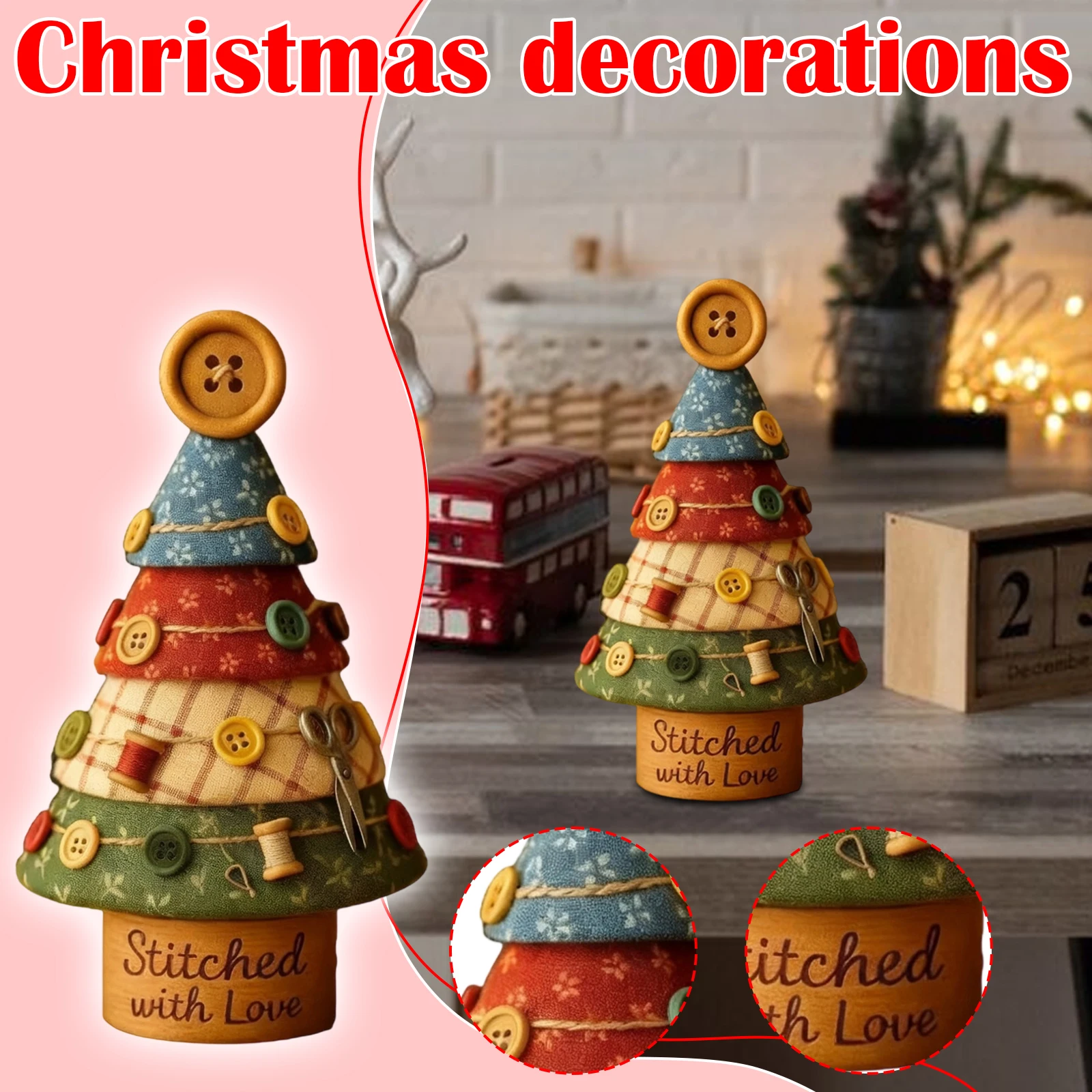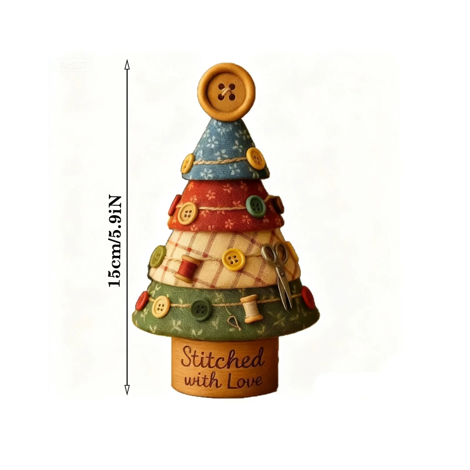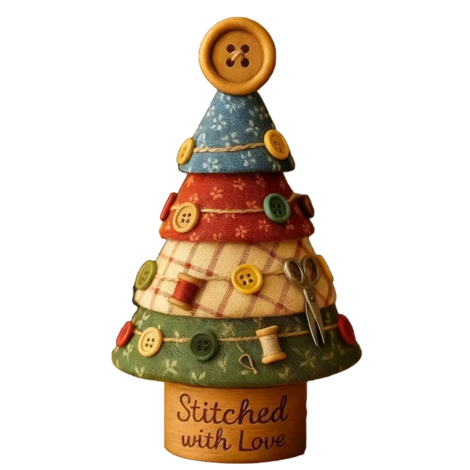About this product:1. **Handmade Fabric Style**: of fabric are stacked into a Christmas tree shape, featuring patterns in blue, red, plaid, and green. Accessorized with sewing elements like buttons, spools of thread, and small scissors, the piece exudes the warmth and CREATIVITY/ of handmade craftsmanship.2. **Rich/ DETAILS/**: Decorated with buttons in a variety of colors and styles, as well as small sewing tool-shaped accessories like spools of thread and small scissors, the piece is Rich/ in DETAILS/ and vividly showcases the sewing theme.3. **Heartwarming Text Design**: The wooden base is printed with the words "Stitched with love," conveying a warm feeling and adding a touch/ of thoughtfulness to the piece.4. **Festive Atmosphere**: The overall Christmas tree shape, combined with the warm fabric and background lighting, perfectly evokes the Christmas atmosphere, making it a perfect Christmas decoration for your home.5. **Decorative and Collectible**: Not Only/ perfect for holiday decorations, its unique, handcrafted design also makes it a valuable collectible, perfect for those who enjoy handmade, fabric, or Christmas-themed items.Package Includes:1 * Ornament