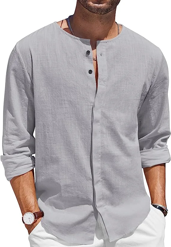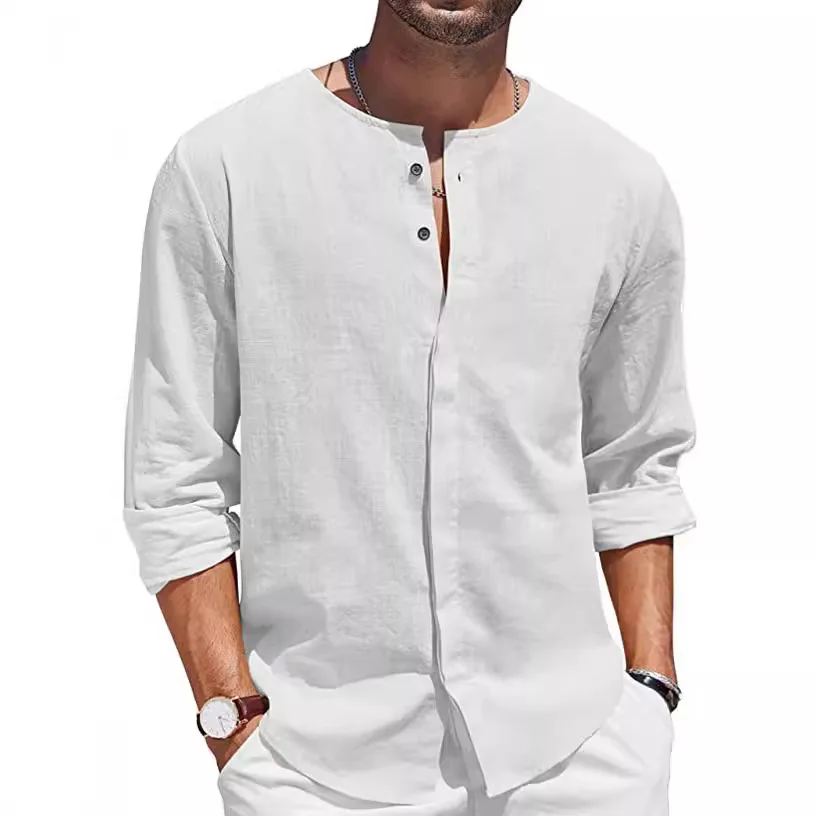 Hawaiian Men's Breathable Cotton Hemp Shirt Long Sleeve Casual Button Collar Bea