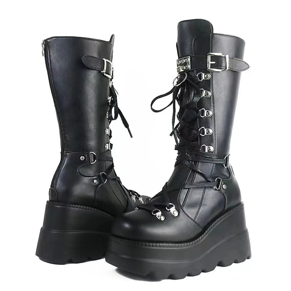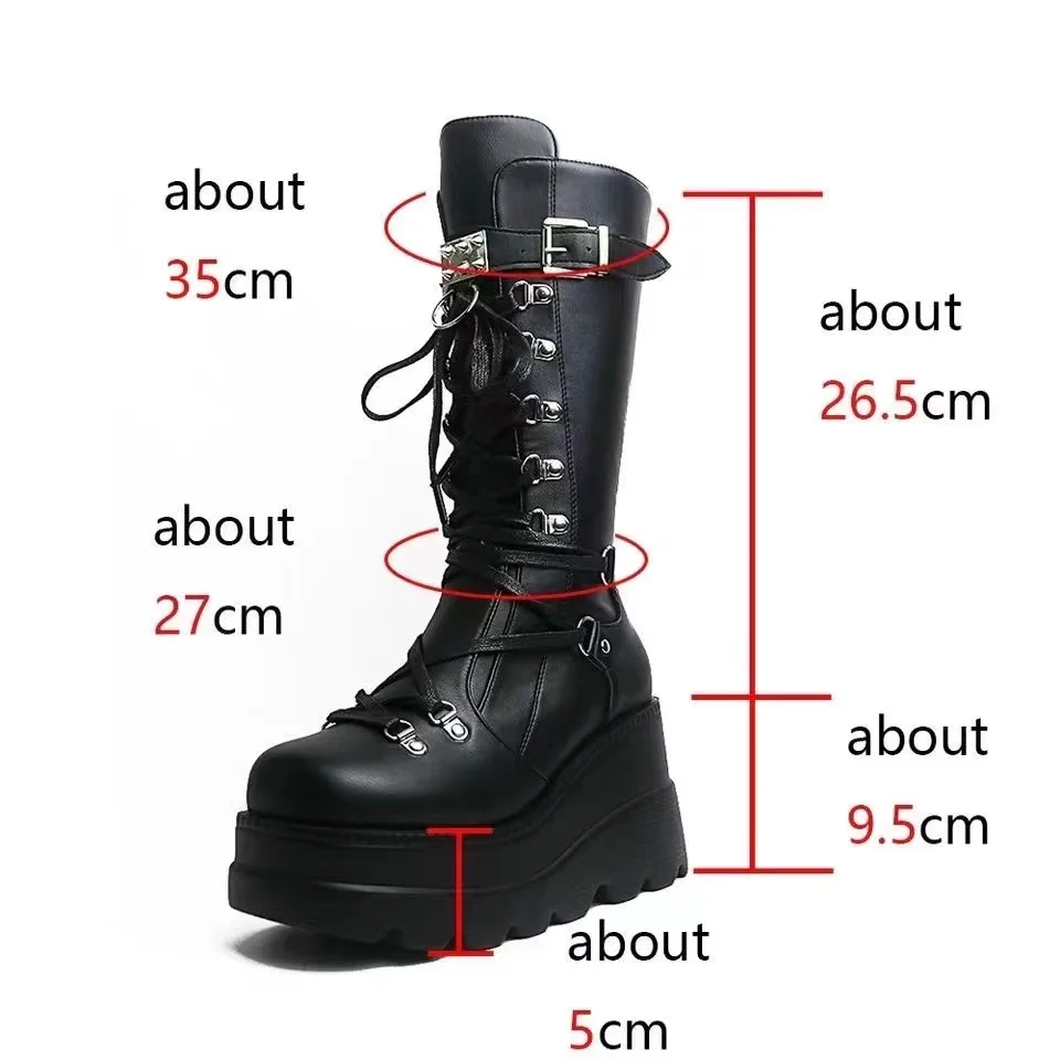 High Heel Mid Calf Platform Boots - Lace Up, Back Zipper, Round Toe, Thick Botto