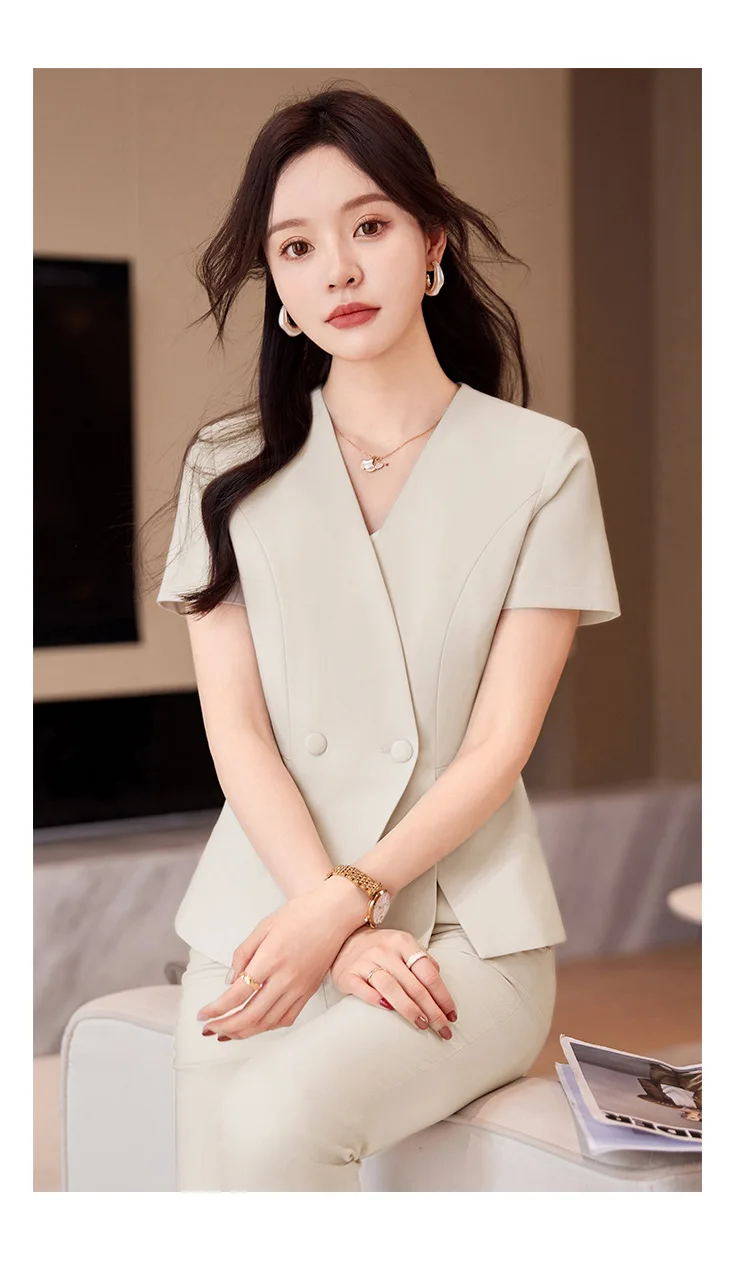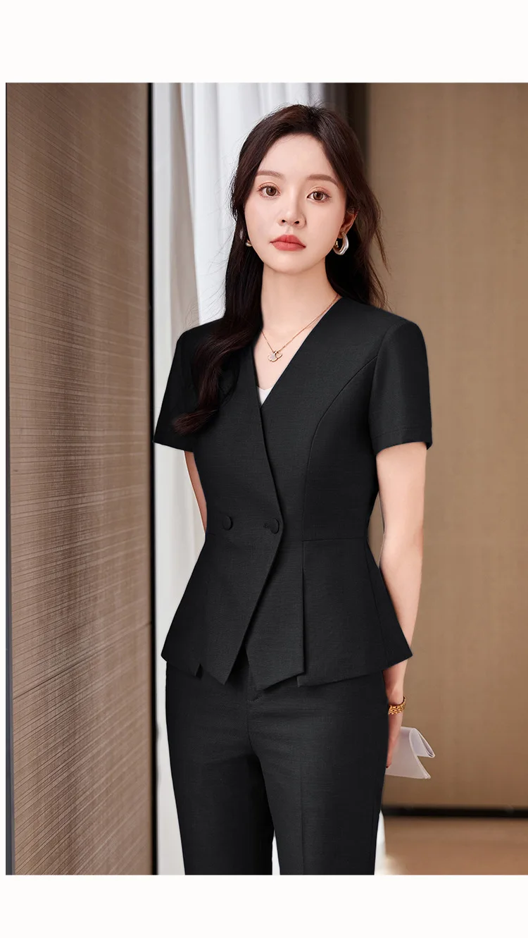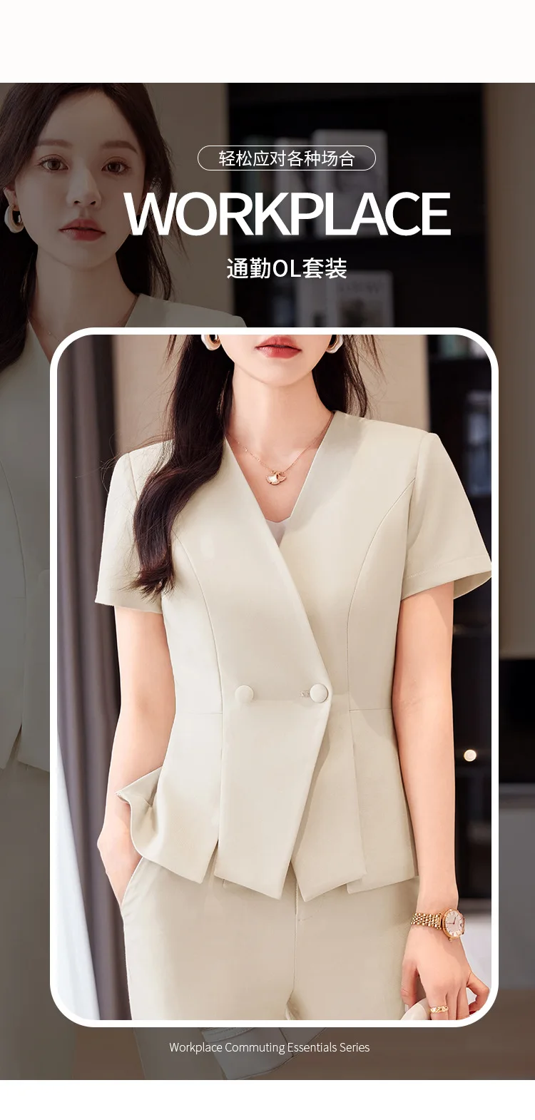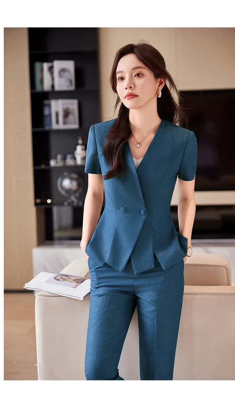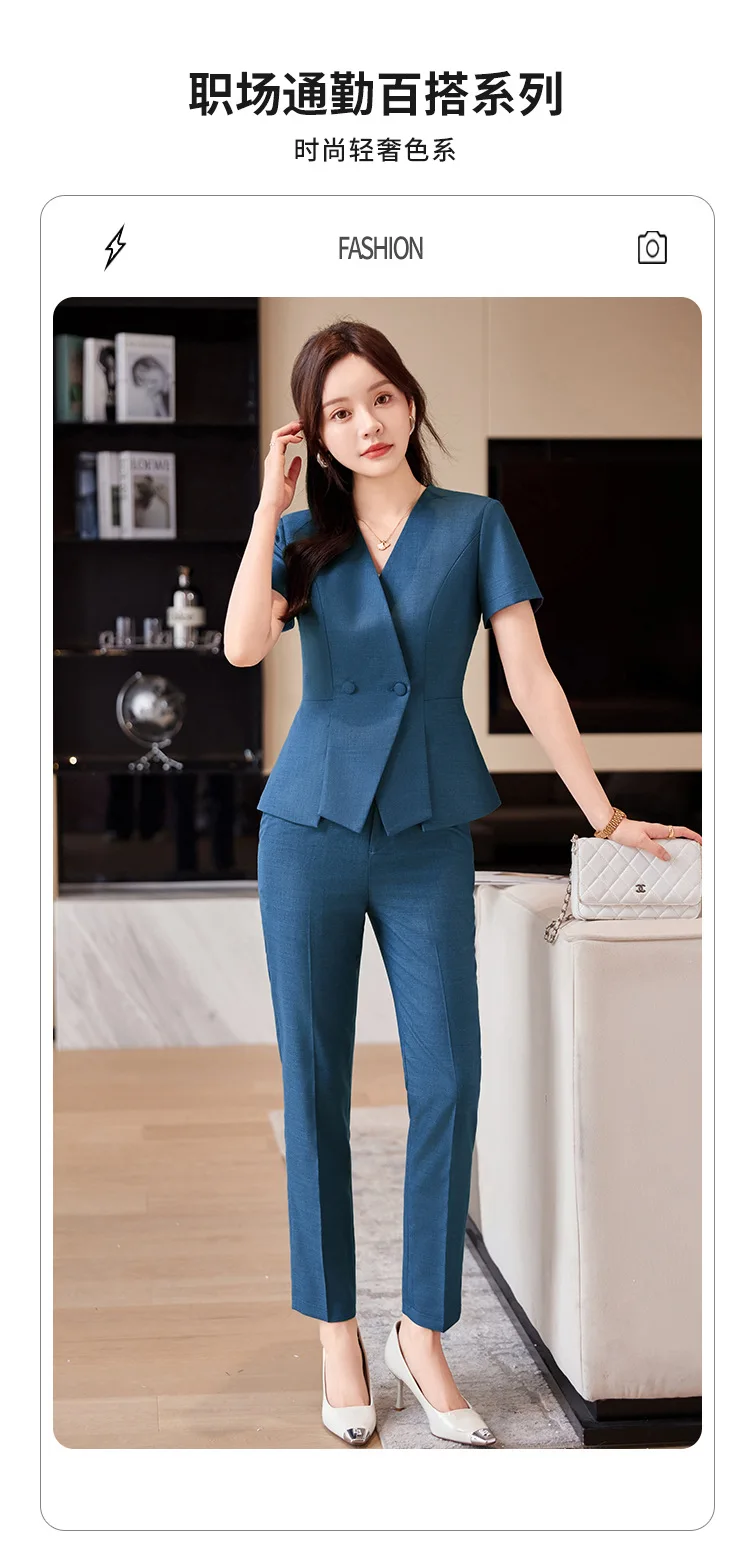 The elegant V-neck collar adds a touch of sophistication to these office-ready outfits, ideal for career women.
