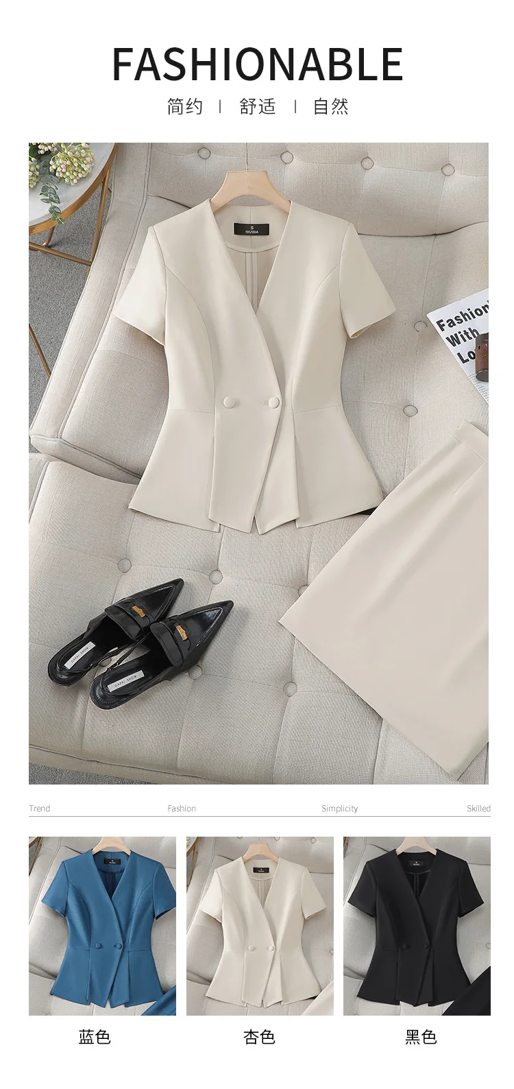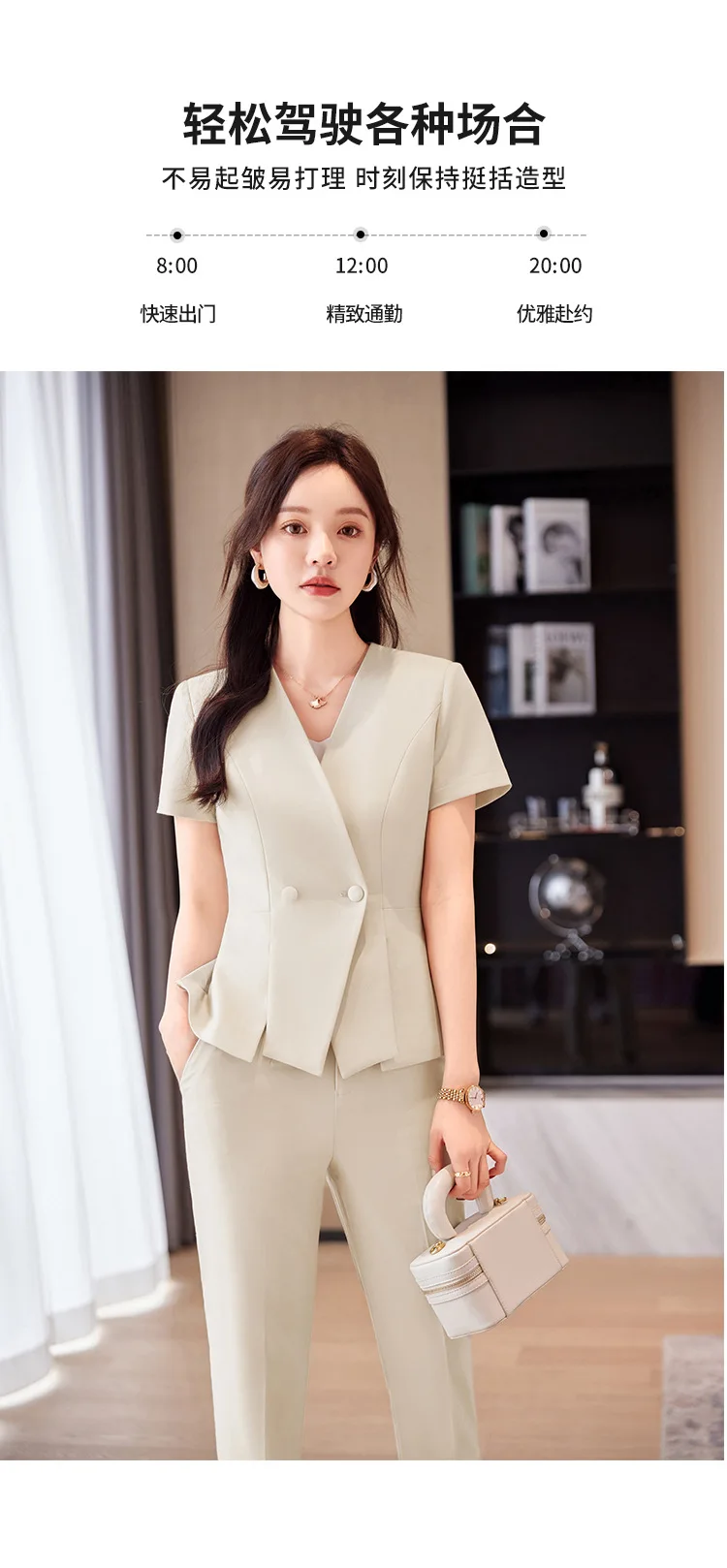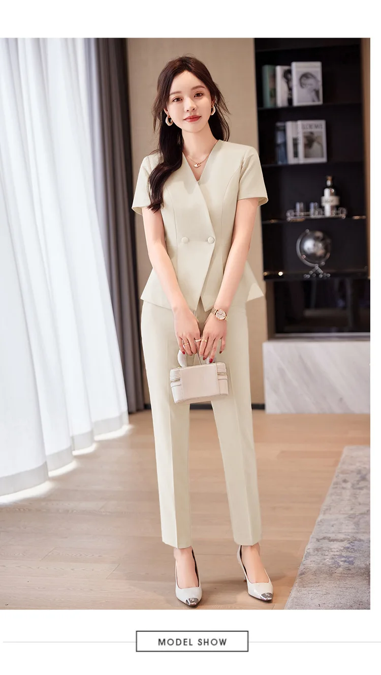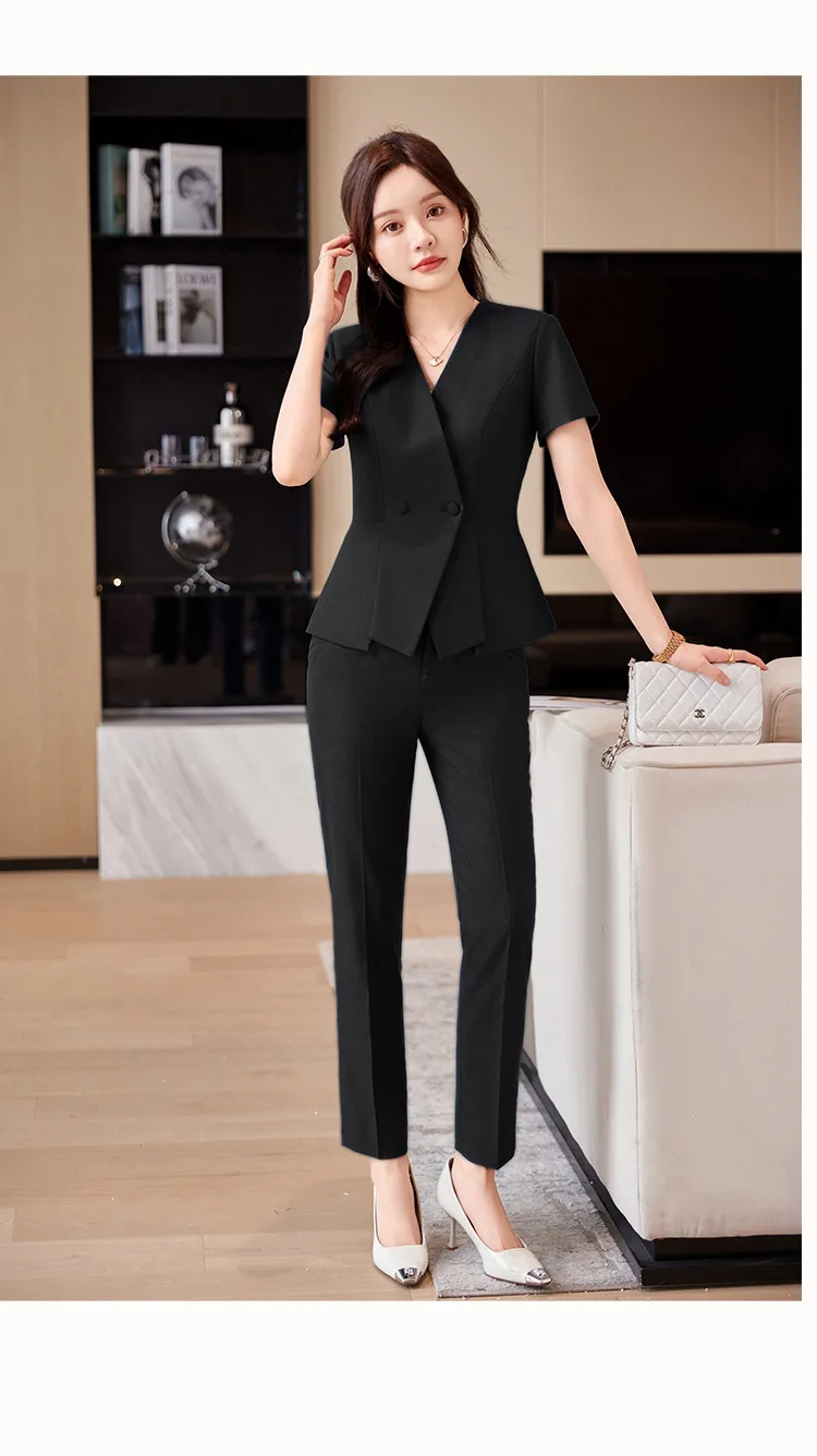 The elegant V-neck collar adds a touch of sophistication to these office-ready outfits, ideal for career women.