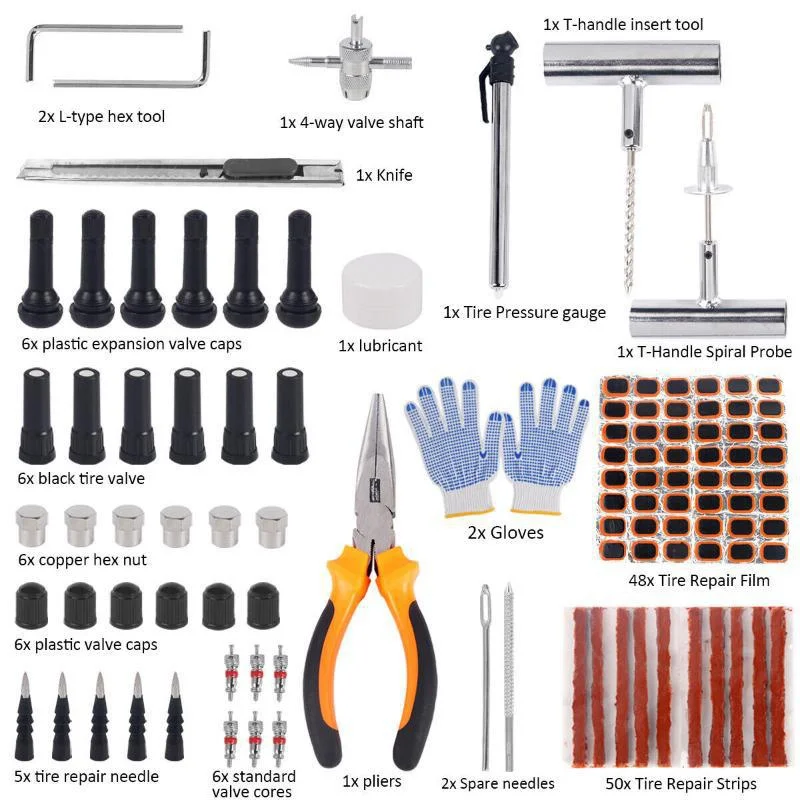 【148 Pcs Tyre Repair Kit】- The complete tire repair tool set includes everything you need.