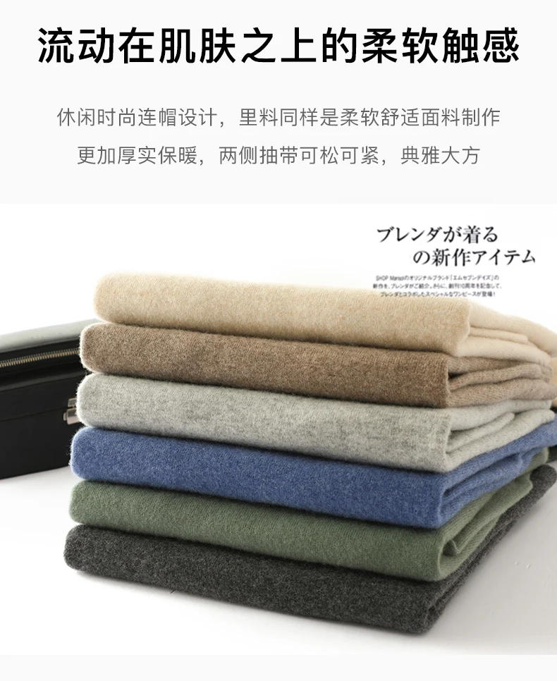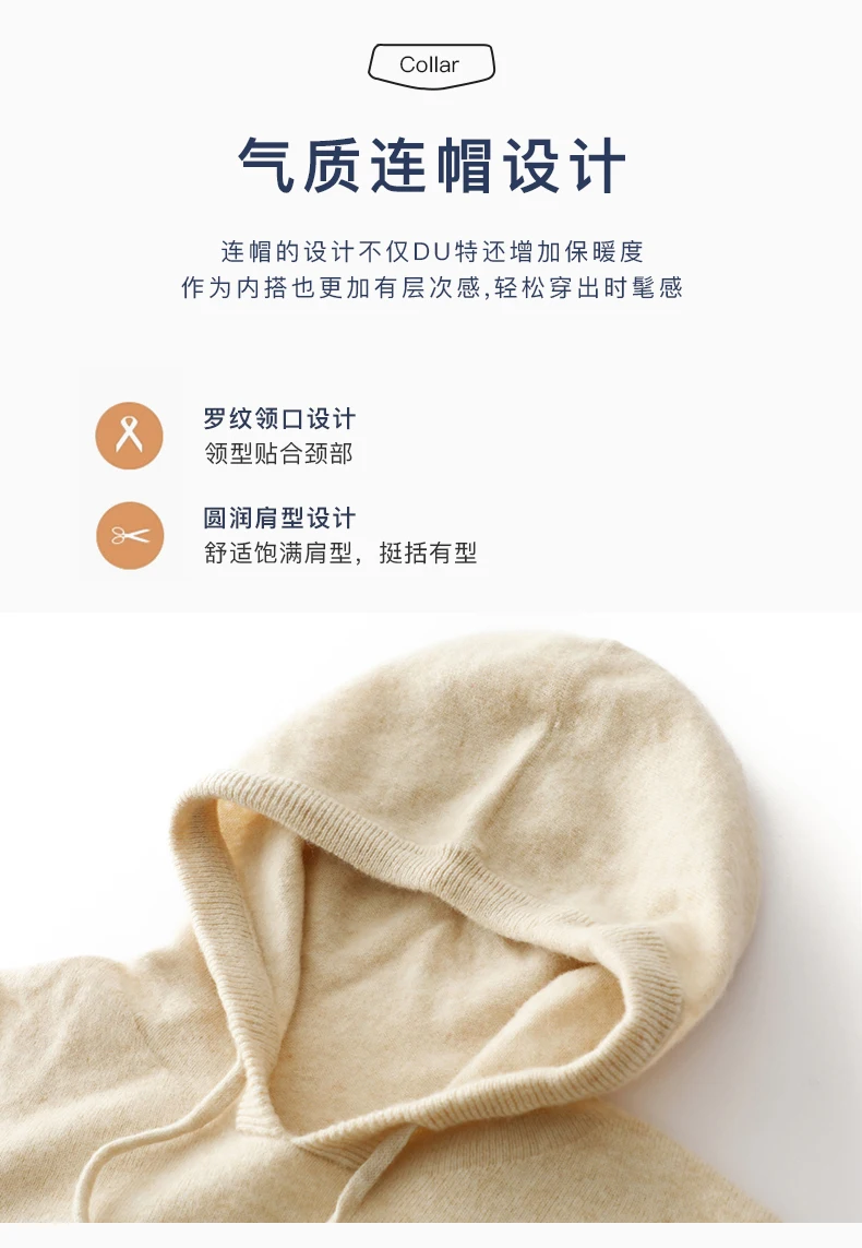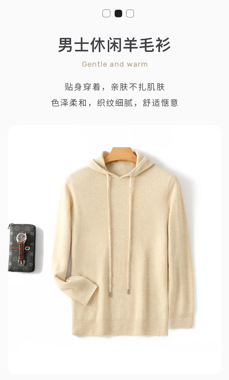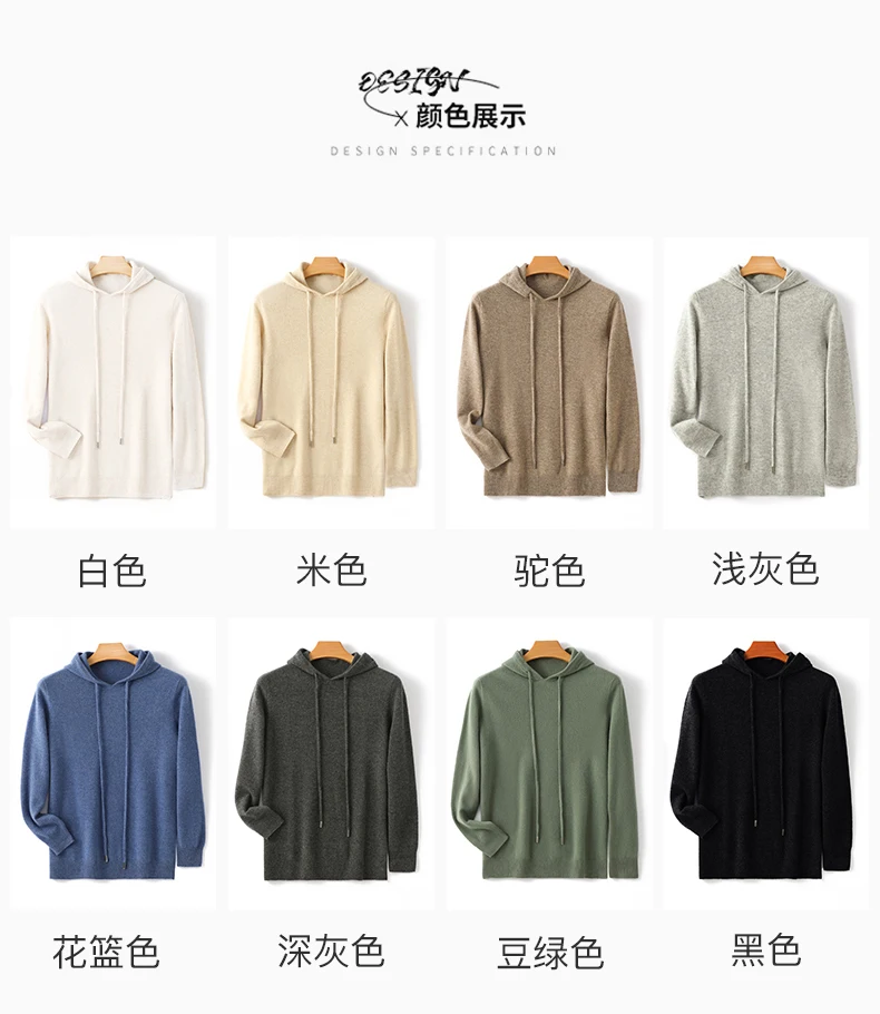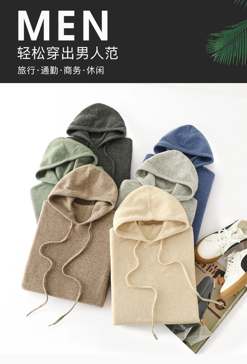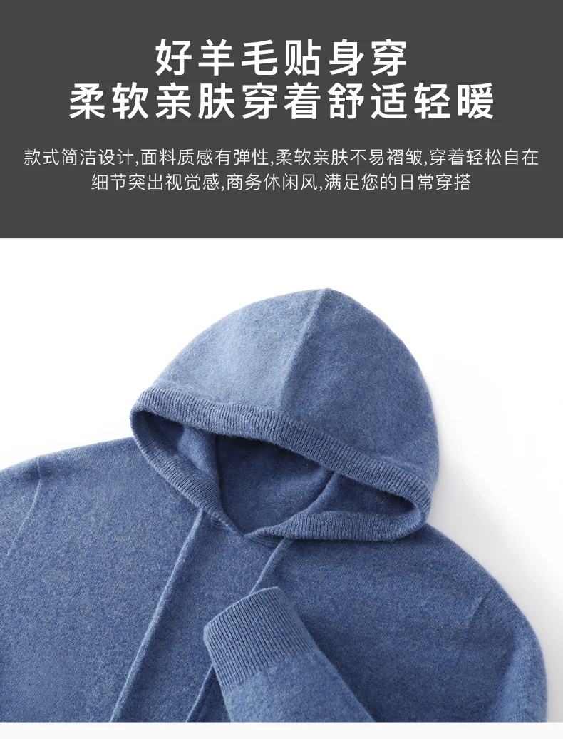 Men's 100% Merino Wool Sweater Hooded Collar Knitted Pullover Cashmere Sweatshir