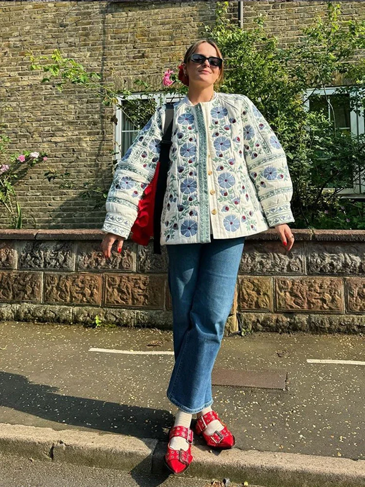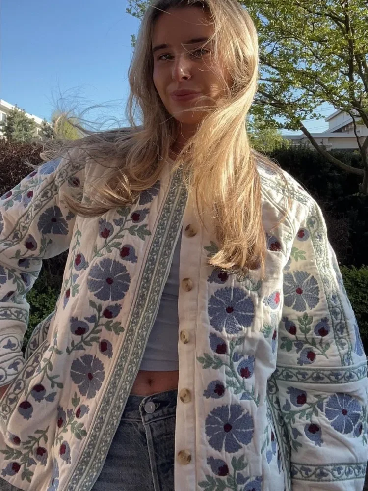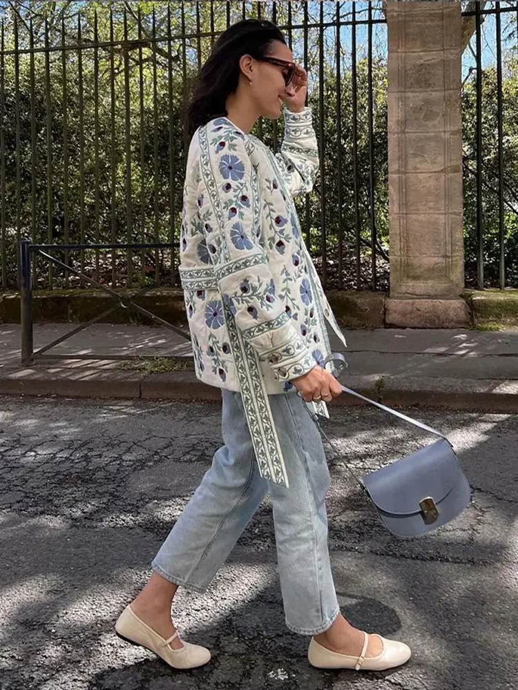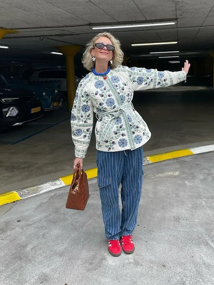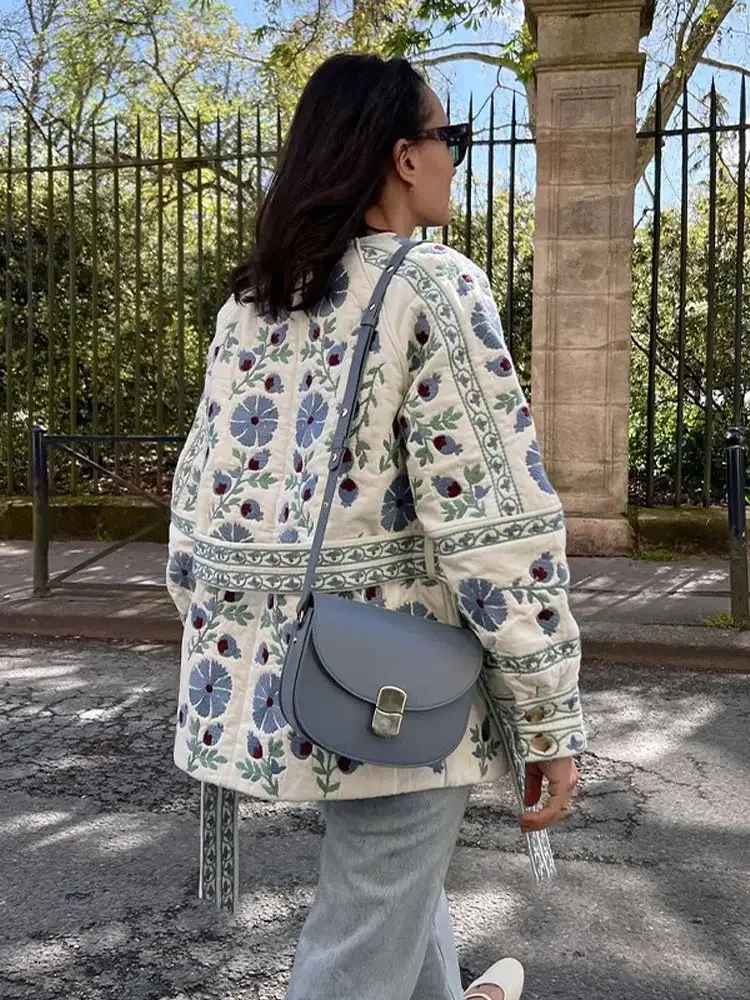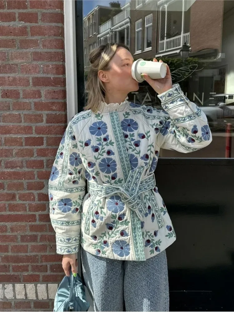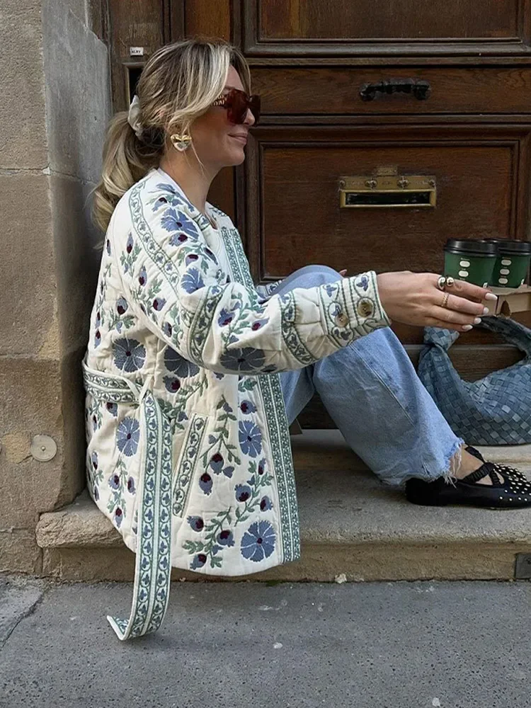 Printed Lace Up Belt Cotton Coat Jacket Single Breasted Casual Loose Waist Cinch