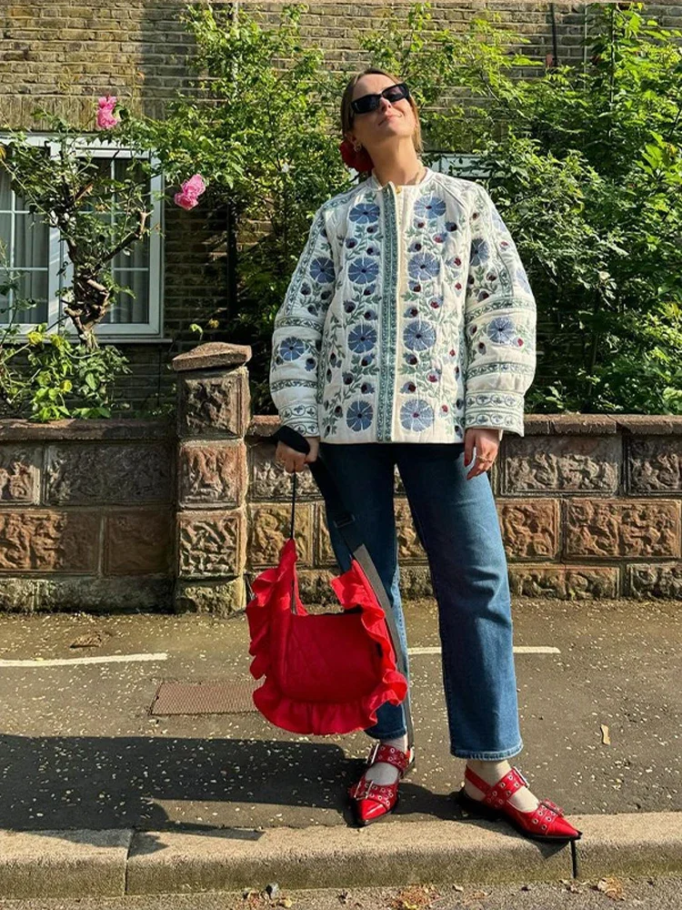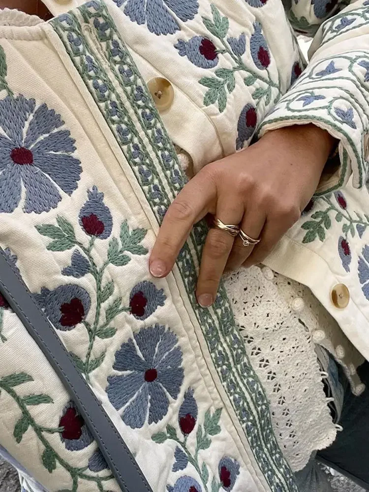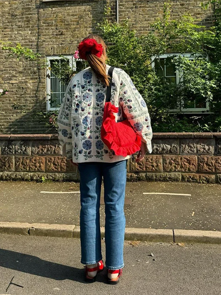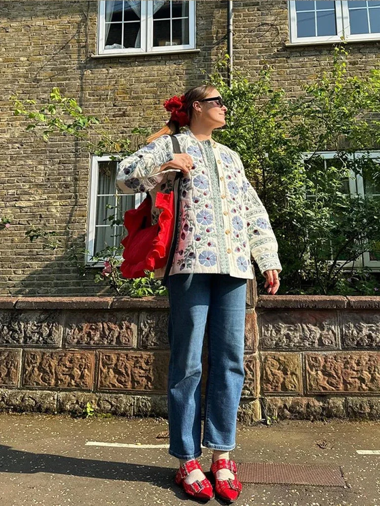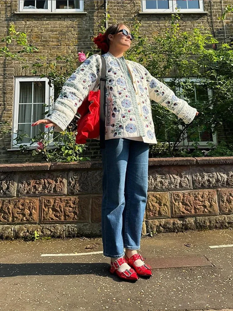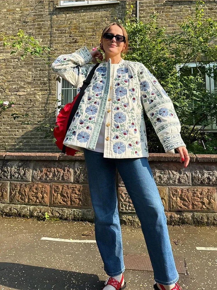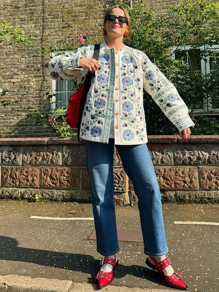 Printed Lace Up Belt Cotton Coat Jacket Single Breasted Casual Loose Waist Cinch
