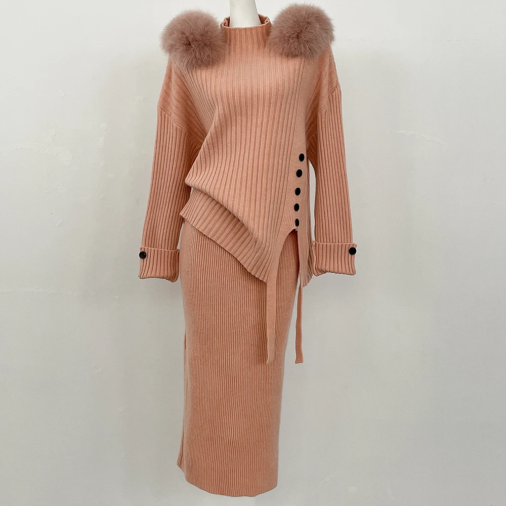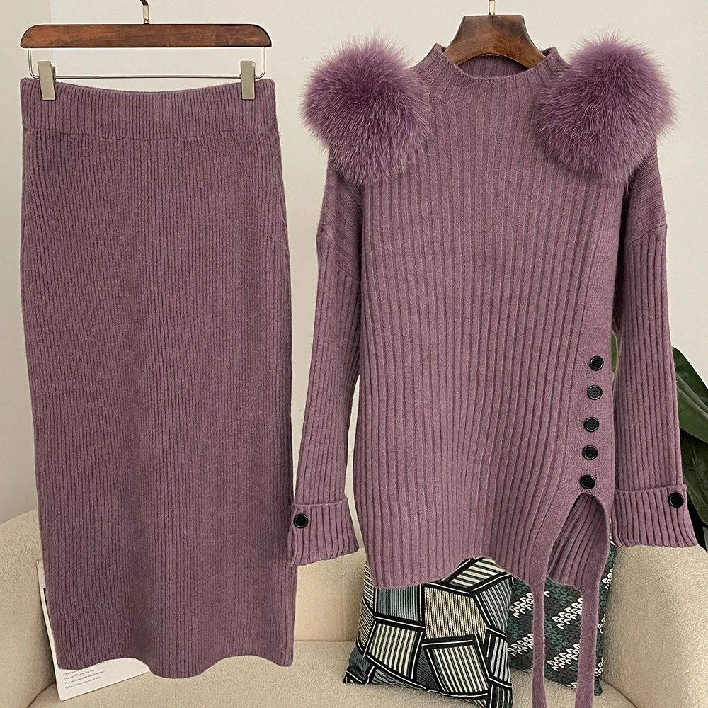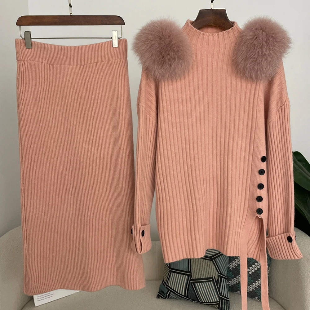 Sweater Set Warm suit Women Winter Knitted Suits two Piece Set Natural fox fur c