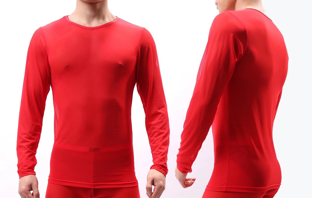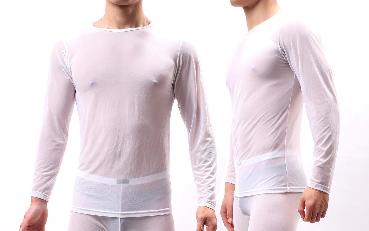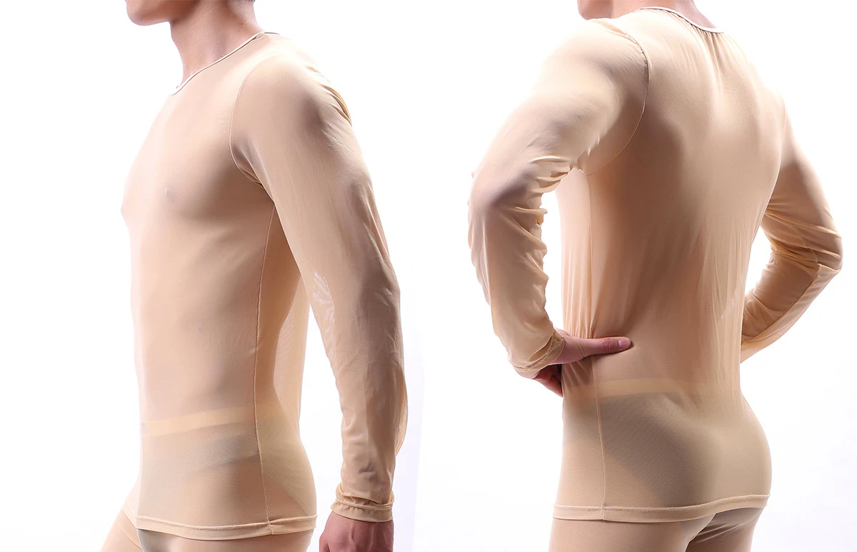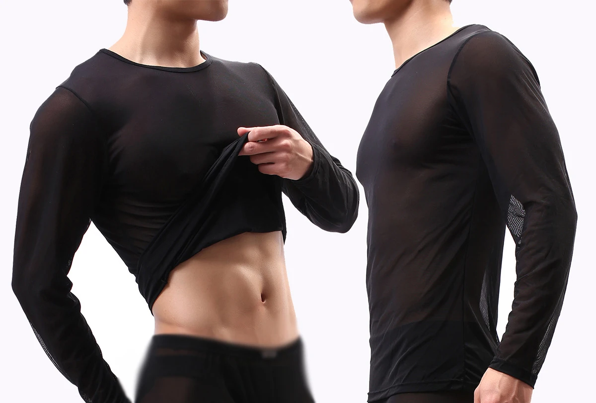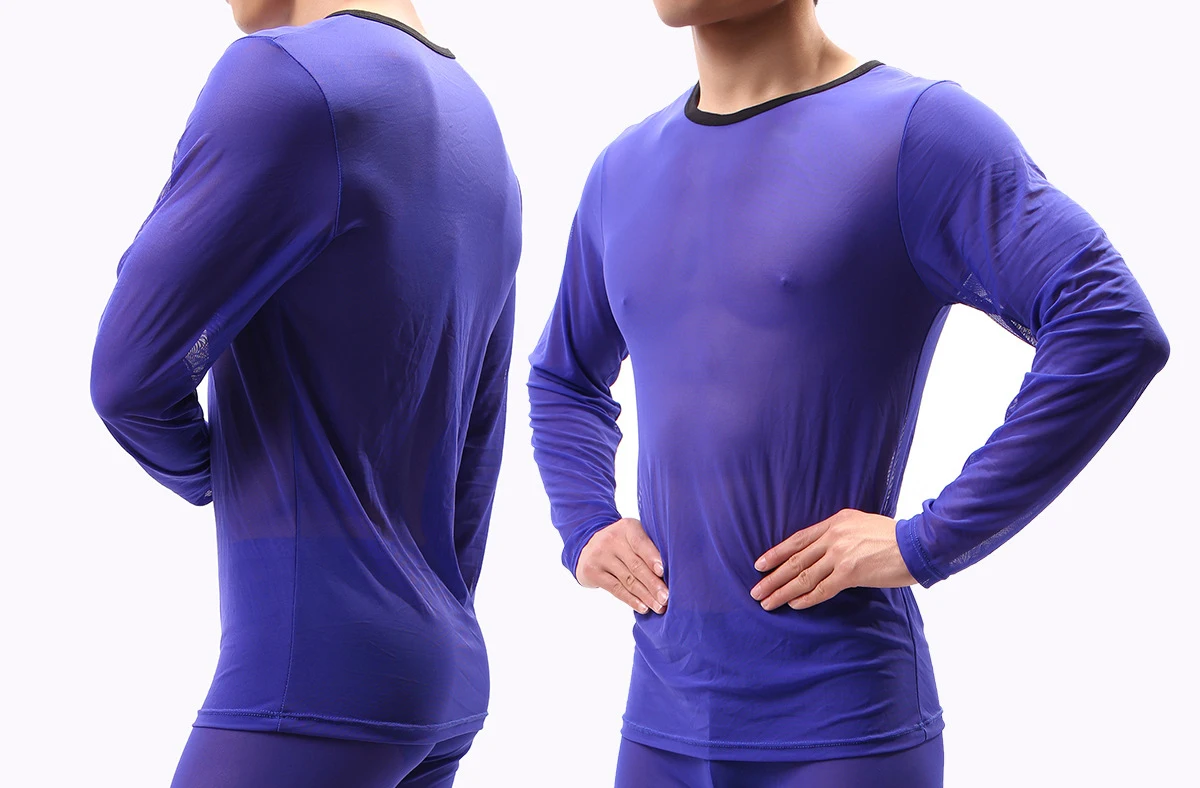 Under Wear Top For Men Transparent Sexy Long Sleeved Round Neck T-Shirt Mesh Und