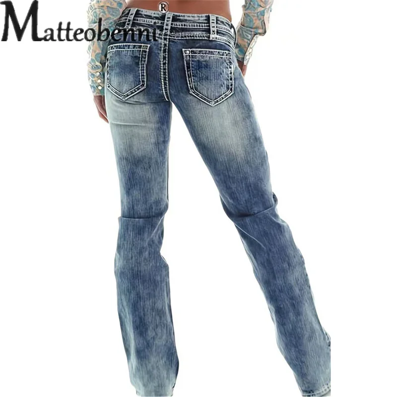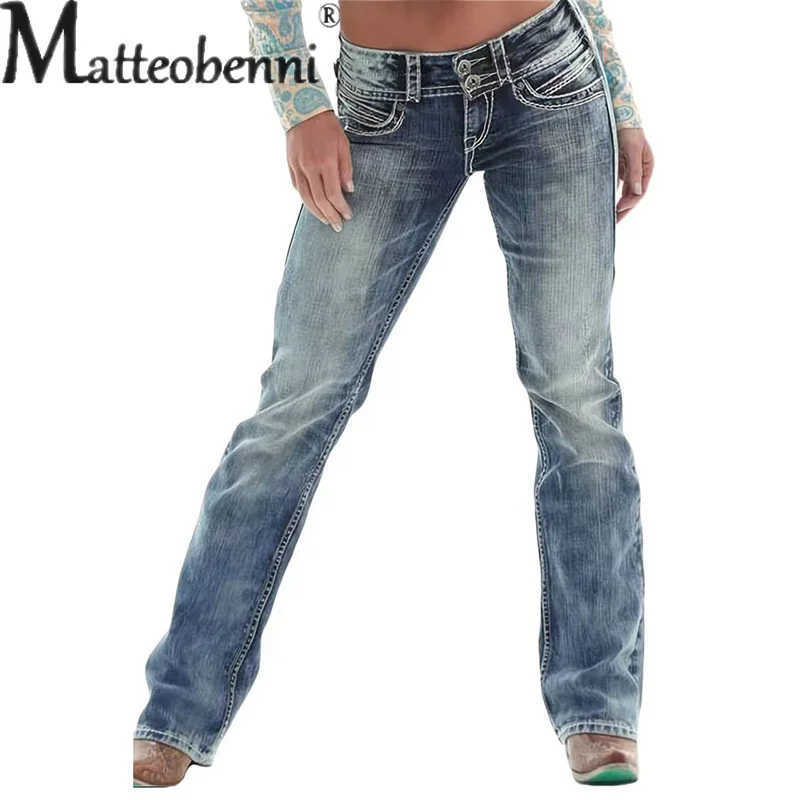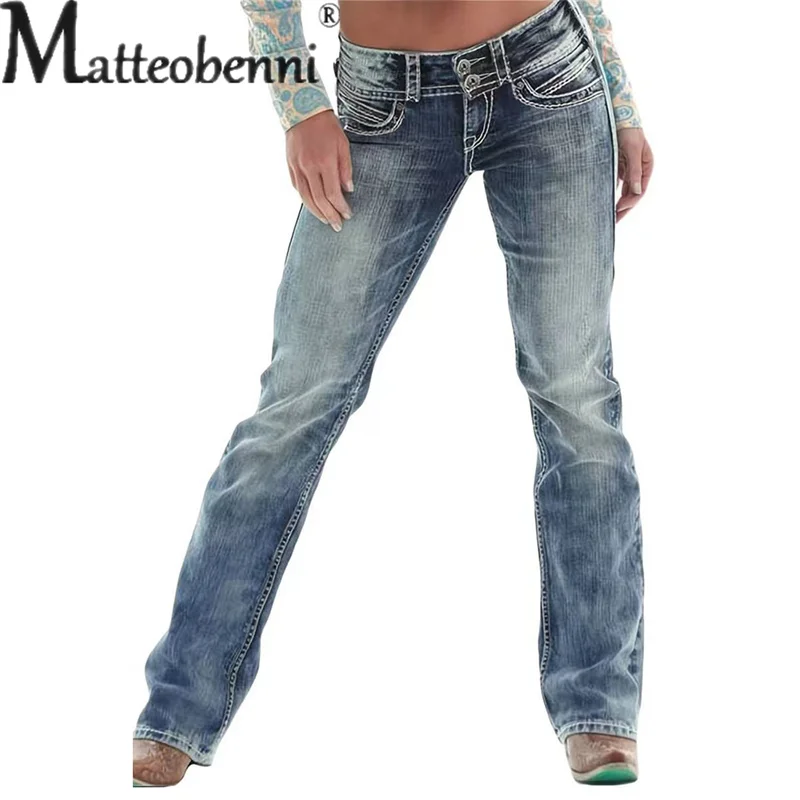 Vintage Rubbed White Denim Pants Women High Waist Double Button Splicing Straigh