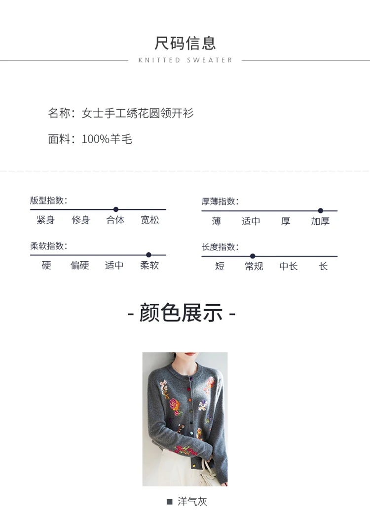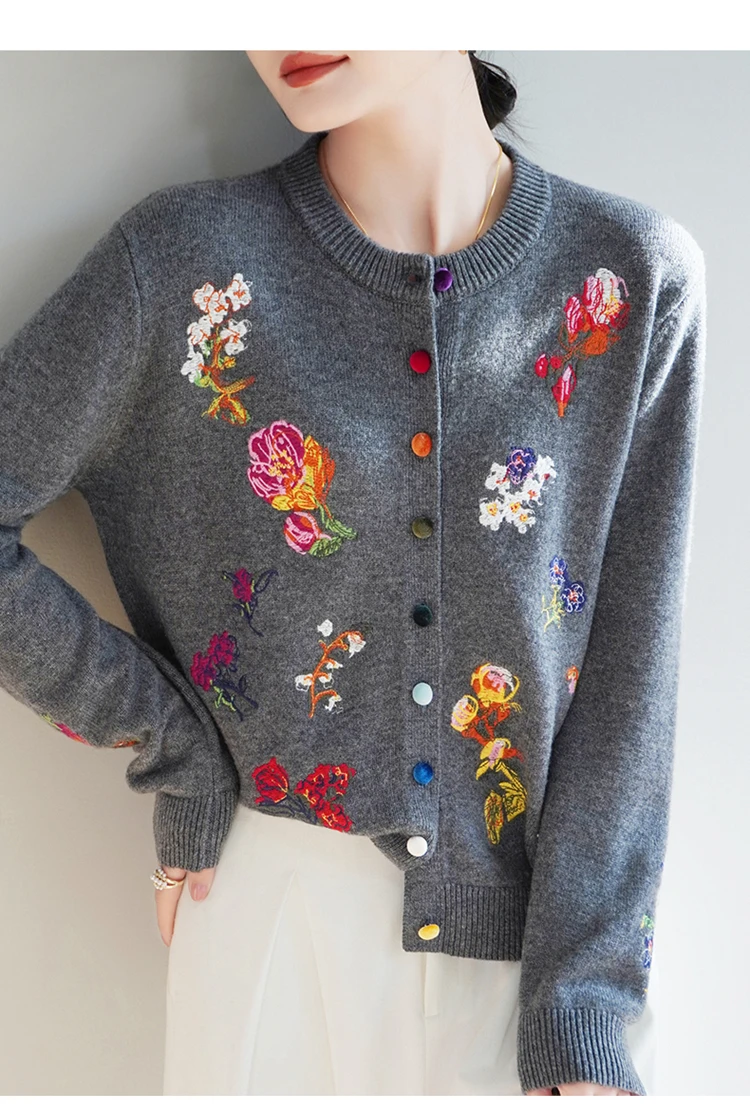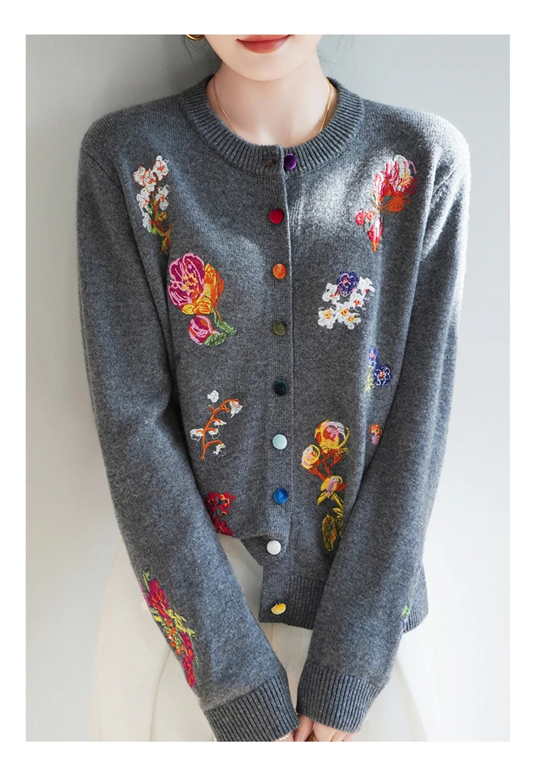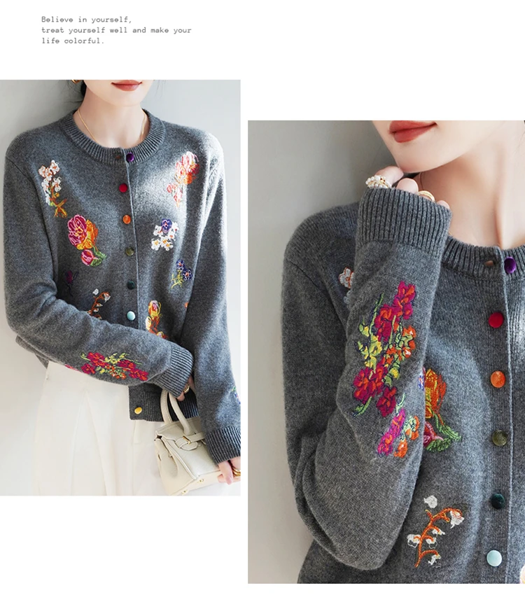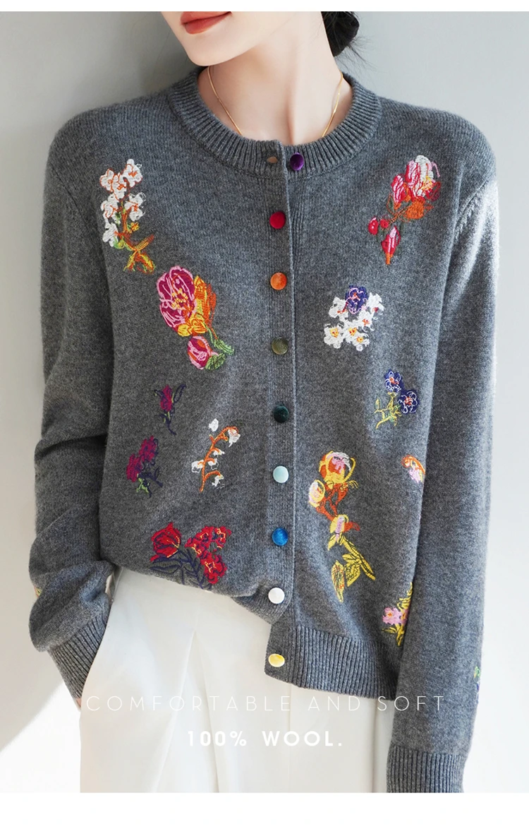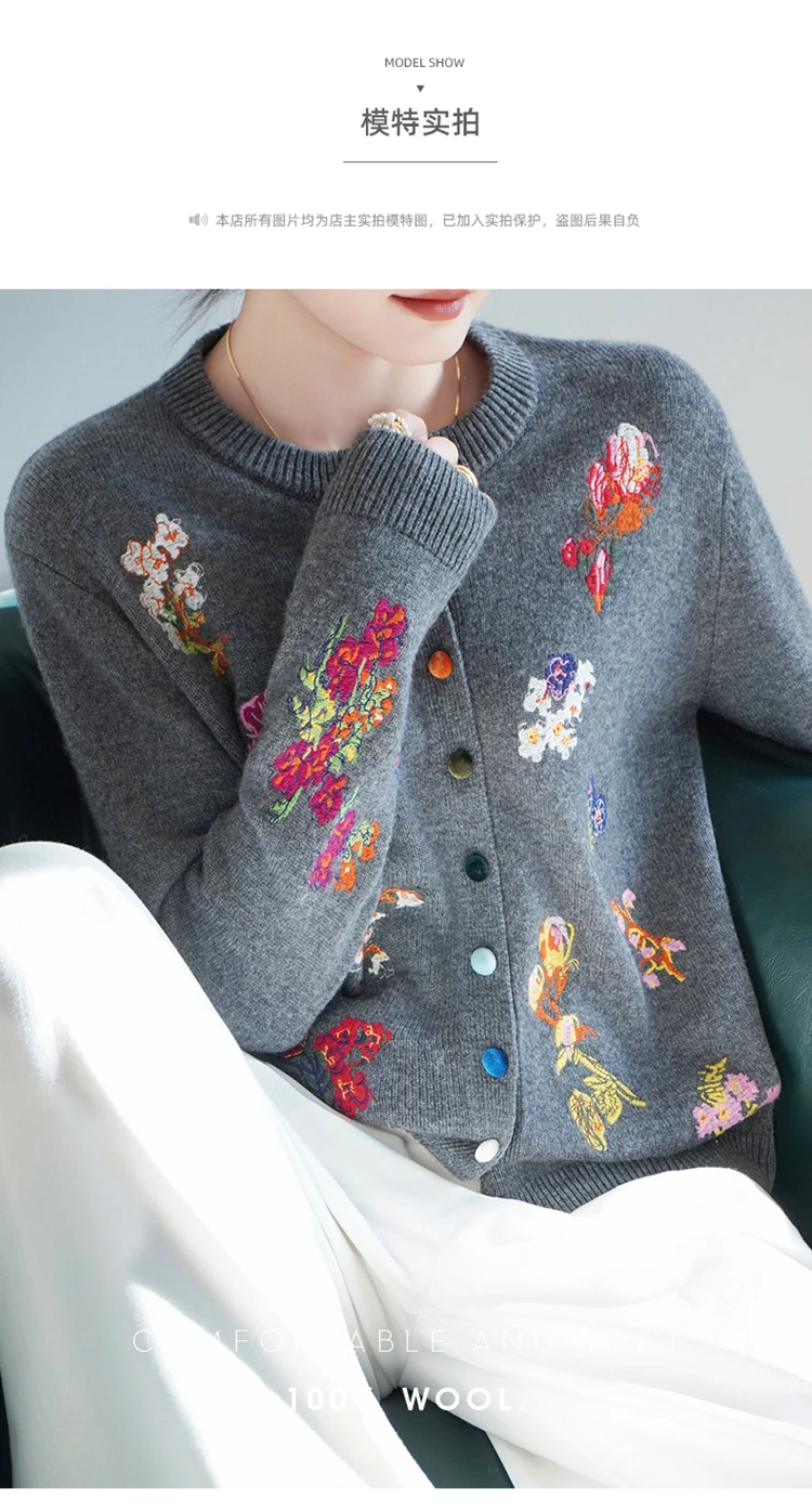 Women 100% Wool Cardigans Sweater Solid embroidery Casual Warm Outerwear Knitwea