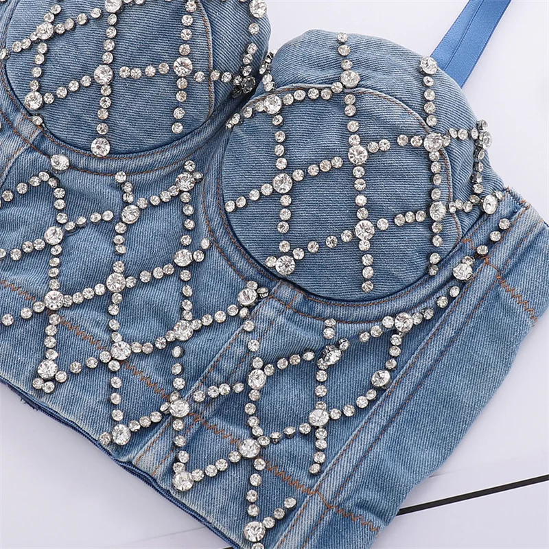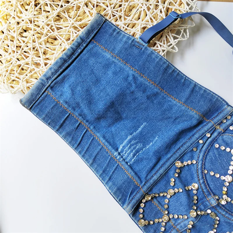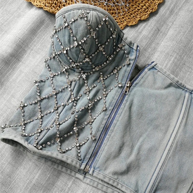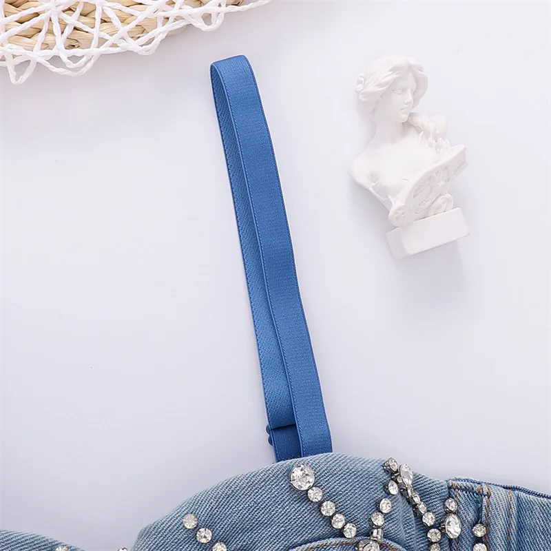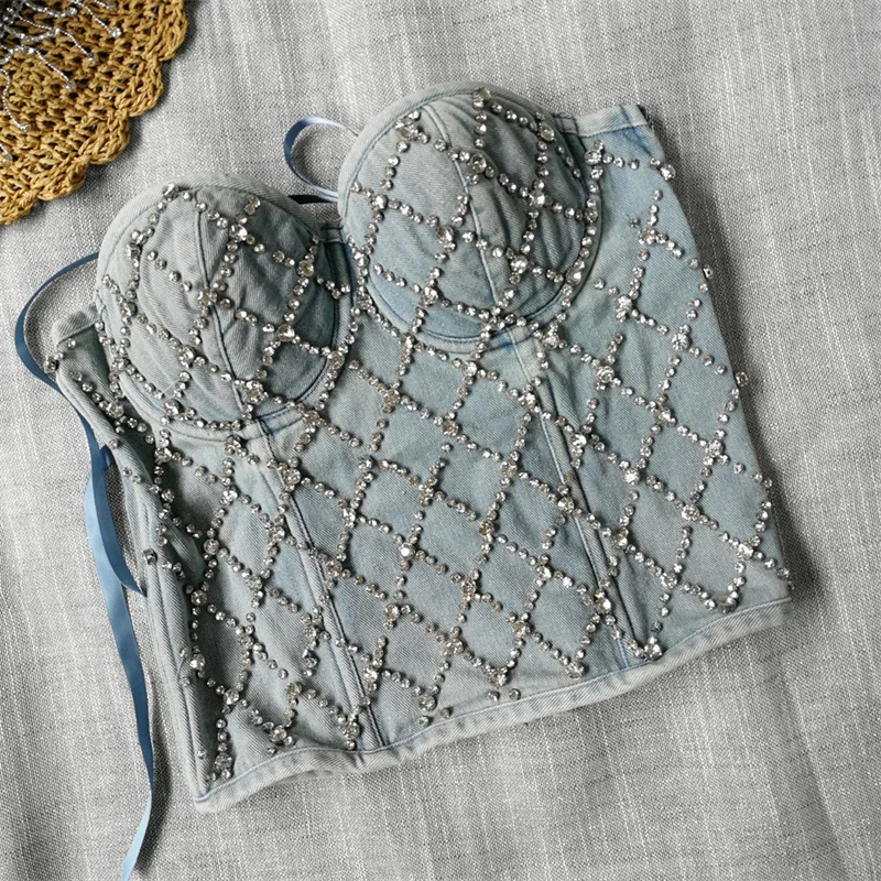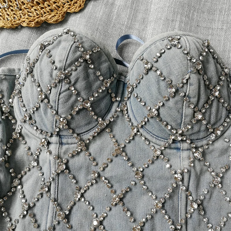 Women Denim Corset Top Sexy Bandage Beading Diamond Crop Top Slim Jean Bustier C