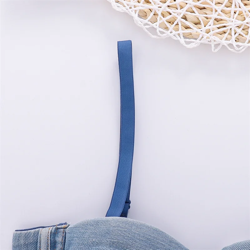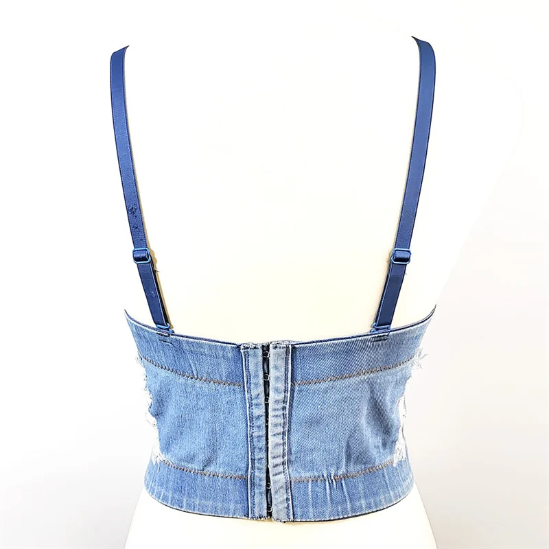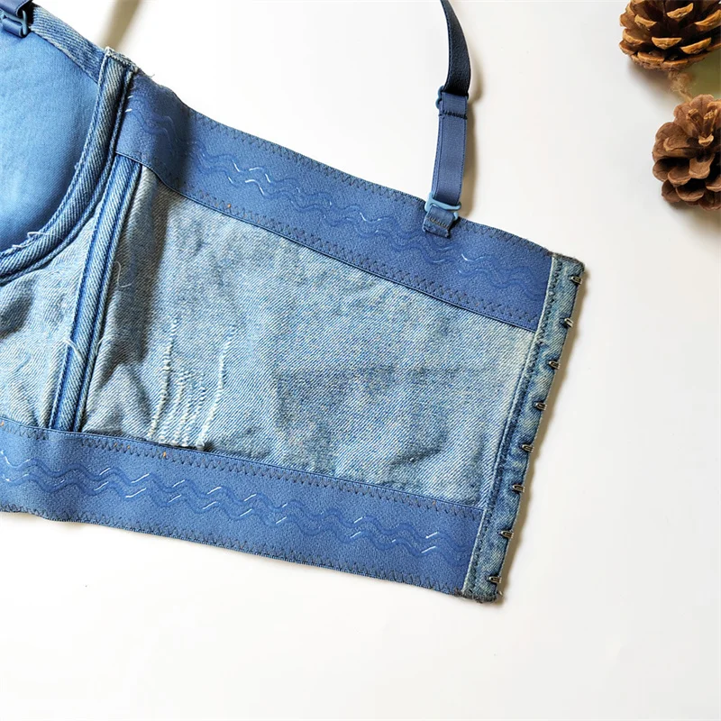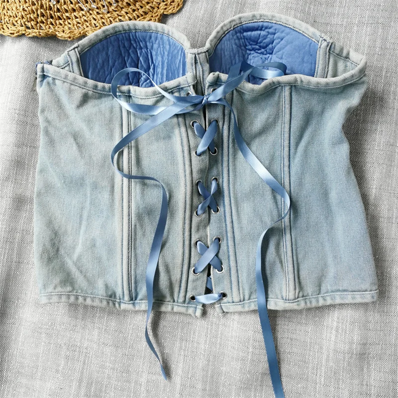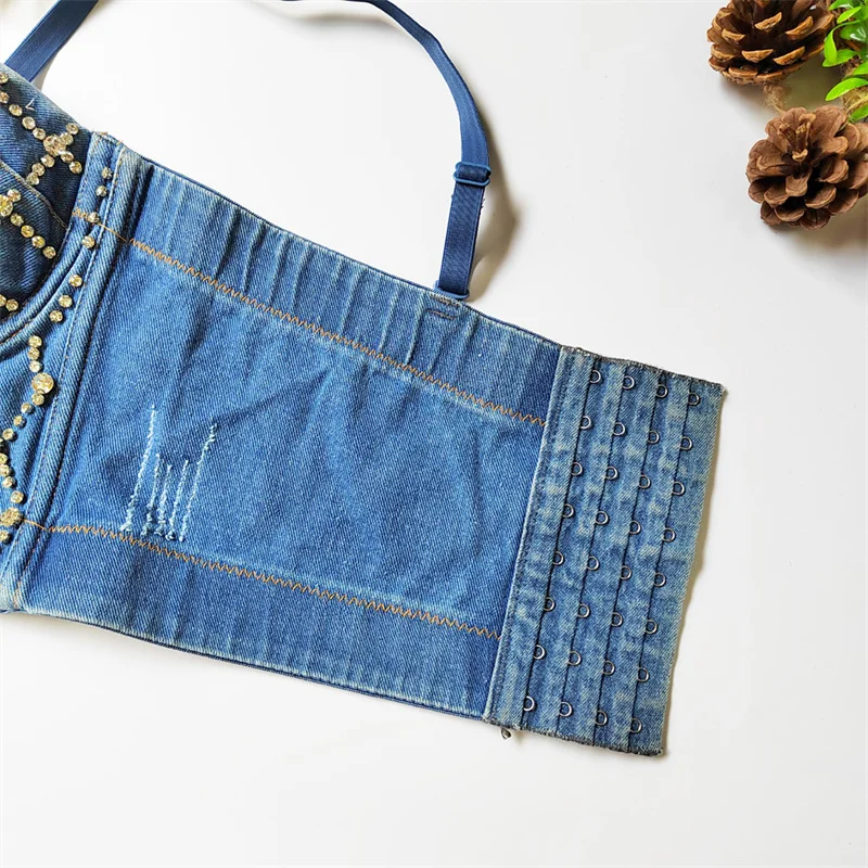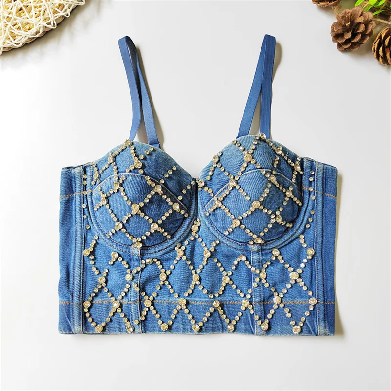 Women Denim Corset Top Sexy Bandage Beading Diamond Crop Top Slim Jean Bustier C