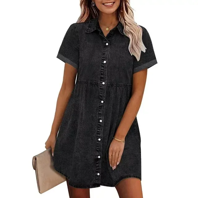 Women Denim Shirt Dresses Short Sleeve Turn Down Collar Jean Dress Single-breast