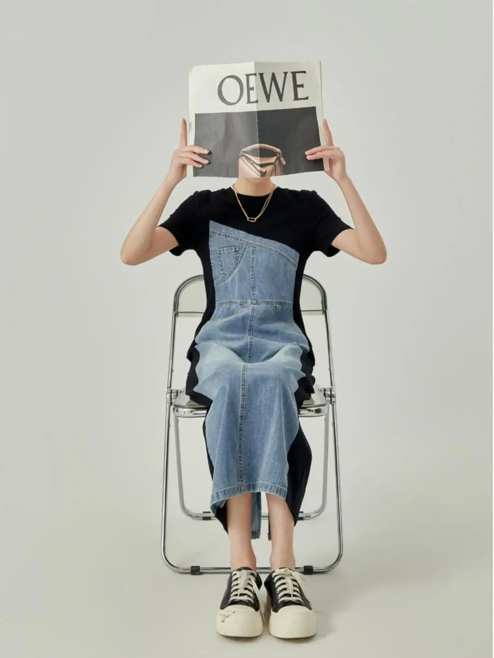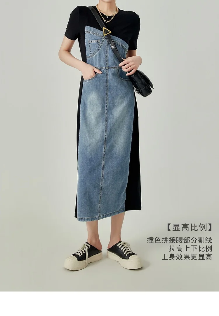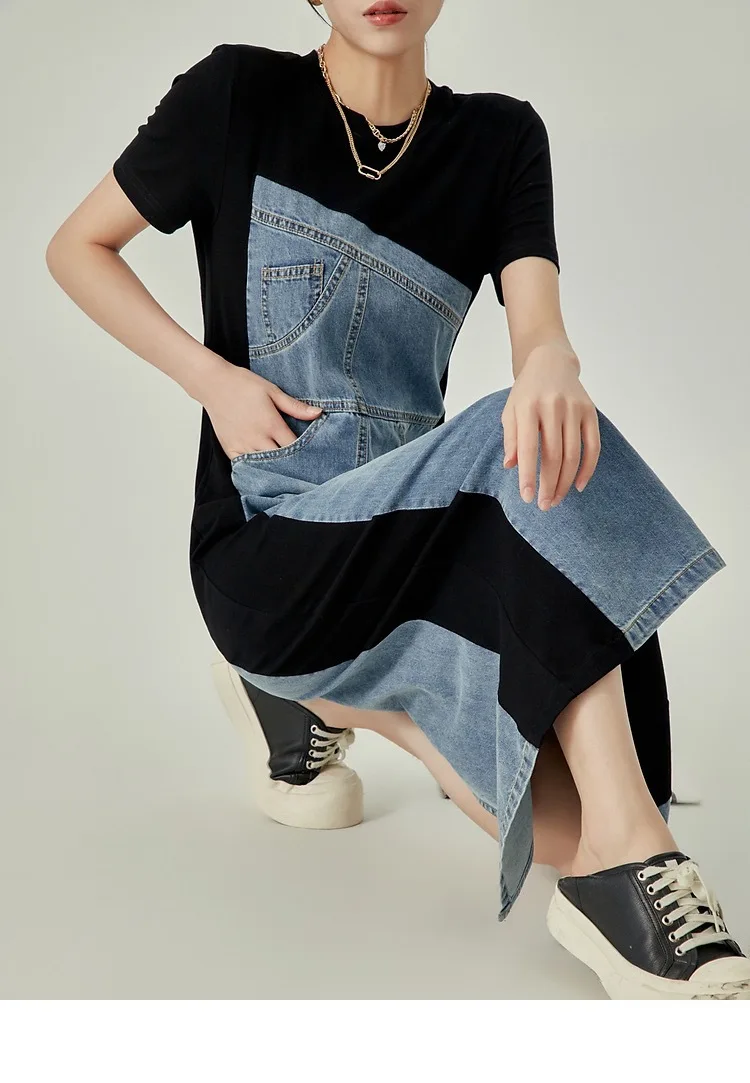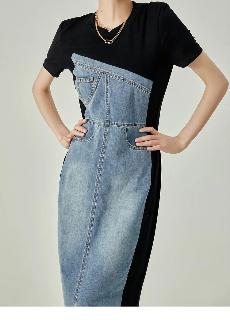 Women Dress Denim Long Dresses Round Neck Short Sleeve Elegant Splice Autumn Tig
