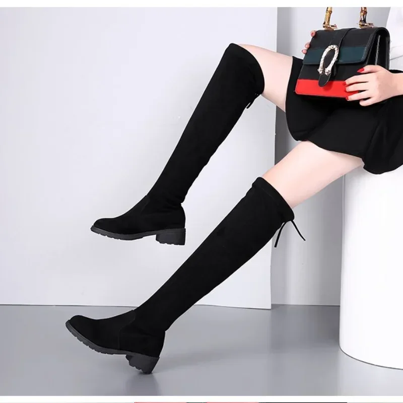 Women's Winter New Black Knee High Boots, Fashionable Lace Up Thick High Heels,